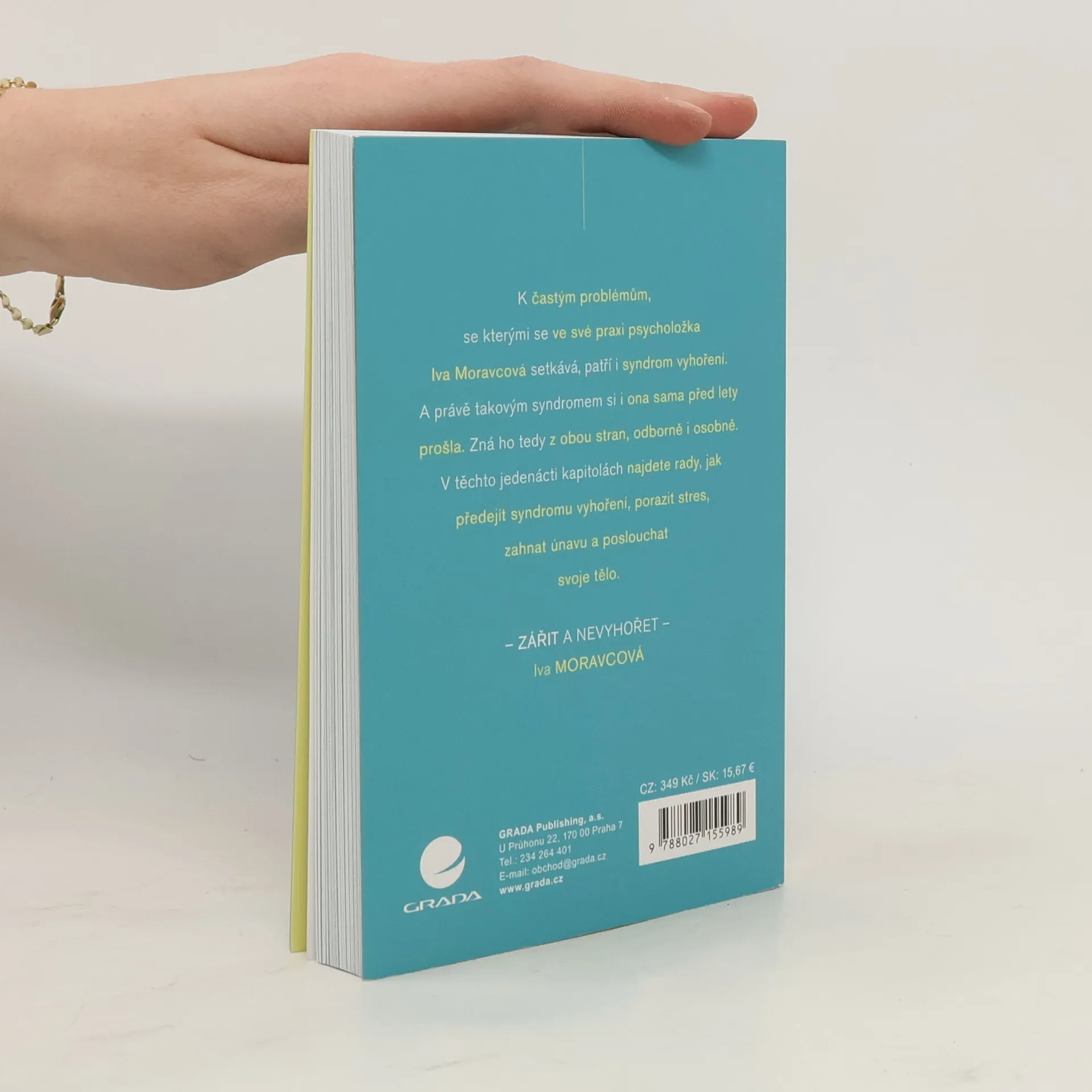 Psycholožka Iva Moravcová si před lety syndromem vyhoření sama prošla, navíc má více než třicet let zkušeností z oblasti psychologie práce. Pomáhá velkým firmám i drobným podnikatelům, vrcholným manažerům i řadovým zaměstnancům. K častým problémům, se kterými se ve své praxi setkává, patří právě syndrom vyhoření, který zná z obou stran, odborně i z osobní zkušenosti. V jedenácti kapitolách publikace Zářit a nevyhořet naleznete rady, jak předejít syndromu vyhoření, porazit stres, zahnat únavu a poslouchat své tělo.