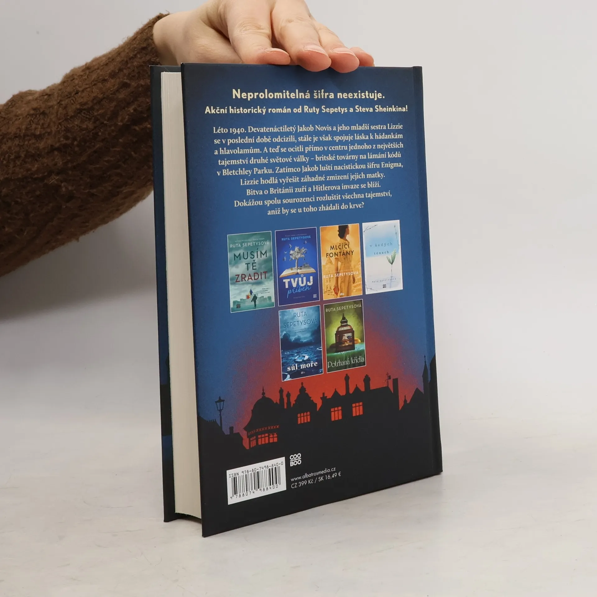 Neprolomitelná šifra neexistuje. Akční historický román od Ruty Sepetys! Léto 1940. Devatenáctiletý Jakob Novis a jeho mladší sestra Lizzie se odcizili, spojuje je však láska k hádankám a hlavolamům. A teď se ocitli přímo v centru jednoho z největších tajemství druhé světové války – britské továrny na lámání kódů v Bletchley Parku. Zatímco Jakob luští nacistickou šifru Enigma, Lizzie hodlá vyřešit záhadné zmizení jejich matky. Bitva o Británii zuří a Hitlerova invaze se blíží. Dokážou spolu sourozenci rozluštit všechna tajemství, aniž by se u toho zhádali do krve?
