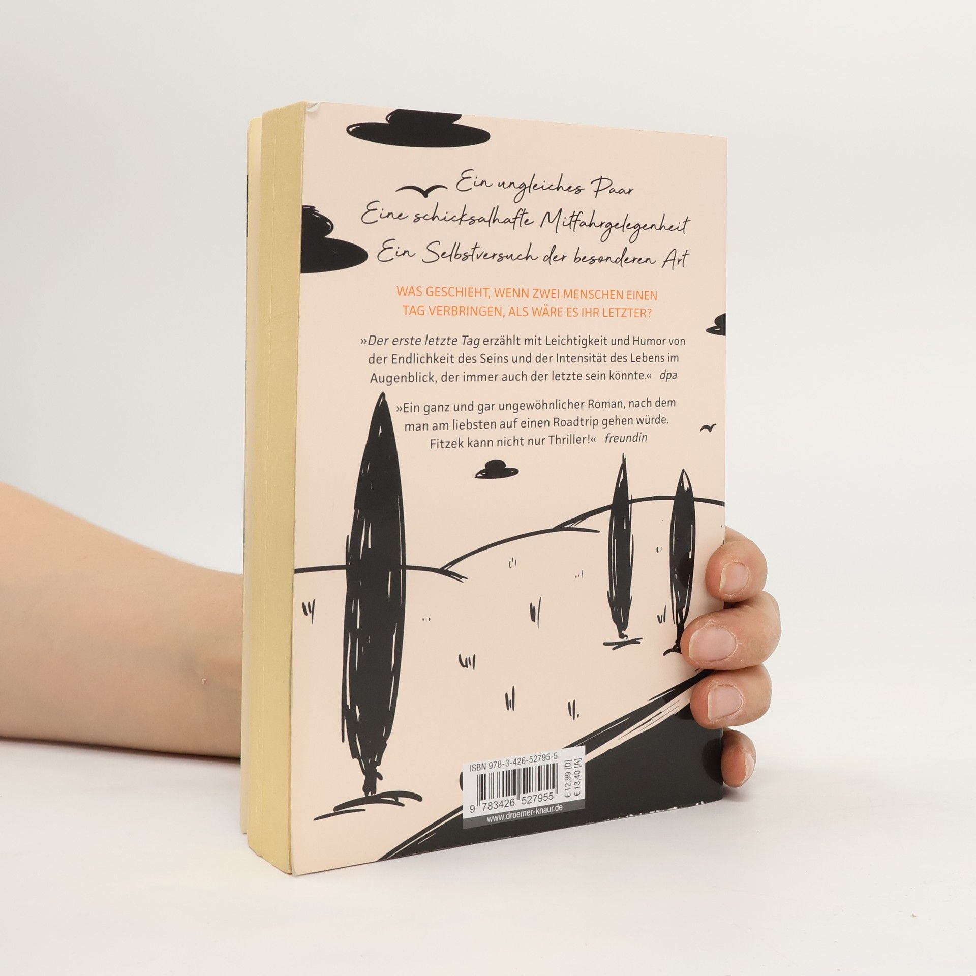 Der Sensationserfolg: Sebastian Fitzeks erster „Keinthriller“ jetzt im Taschenbuch Ein ungleiches Paar. Eine schicksalhafte Mitfahrgelegenheit. Ein Selbstversuch der besonderen Art. WAS GESCHIEHT, WENN ZWEI MENSCHEN EINEN TAG VERBRINGEN, ALS WÄRE ES IHR LETZTER? Ein Roadtrip voller Komik, Dramatik und unvorhersehbarer Abzweigungen von Deutschlands Bestsellerautor Nr. 1 Sebastian Fitzek - mit zwei skurrilen, ans Herz gehenden Hauptfiguren, die unterschiedlicher nicht sein könnten. Livius Reimer macht sich auf den Weg von München nach Berlin, um seine Ehe zu retten. Als sein Flug gestrichen wird, muss er sich den einzig noch verfügbaren Mietwagen mit einer jungen Frau teilen, um die er sonst einen großen Bogen gemacht hätte. Zu schräg, zu laut, zu ungewöhnlich - mit ihrer unkonventionellen Sicht auf die Welt überfordert Lea von Armin Livius von der ersten Sekunde an. Bereits kurz nach der Abfahrt lässt Livius sich auf ein ungewöhnliches Gedankenexperiment von Lea ein – und weiß nicht, dass damit nicht nur ihr Roadtrip einen völlig neuen Verlauf nimmt, sondern sein ganzes Leben! „Sebastian Fitzek ist in einem für ihn untypischen Literatur-Genre unterwegs – und macht dabei keine schlechte Figur. (...) Ein mit Leichtigkeit geschriebenes Werk voller Humor und Komik.“ Passauer Neue Presse „Spitzbübisch, ironisch und voll humoriger, aber tiefgründiger Dialoge.“ Belletristik-Couch(.)de