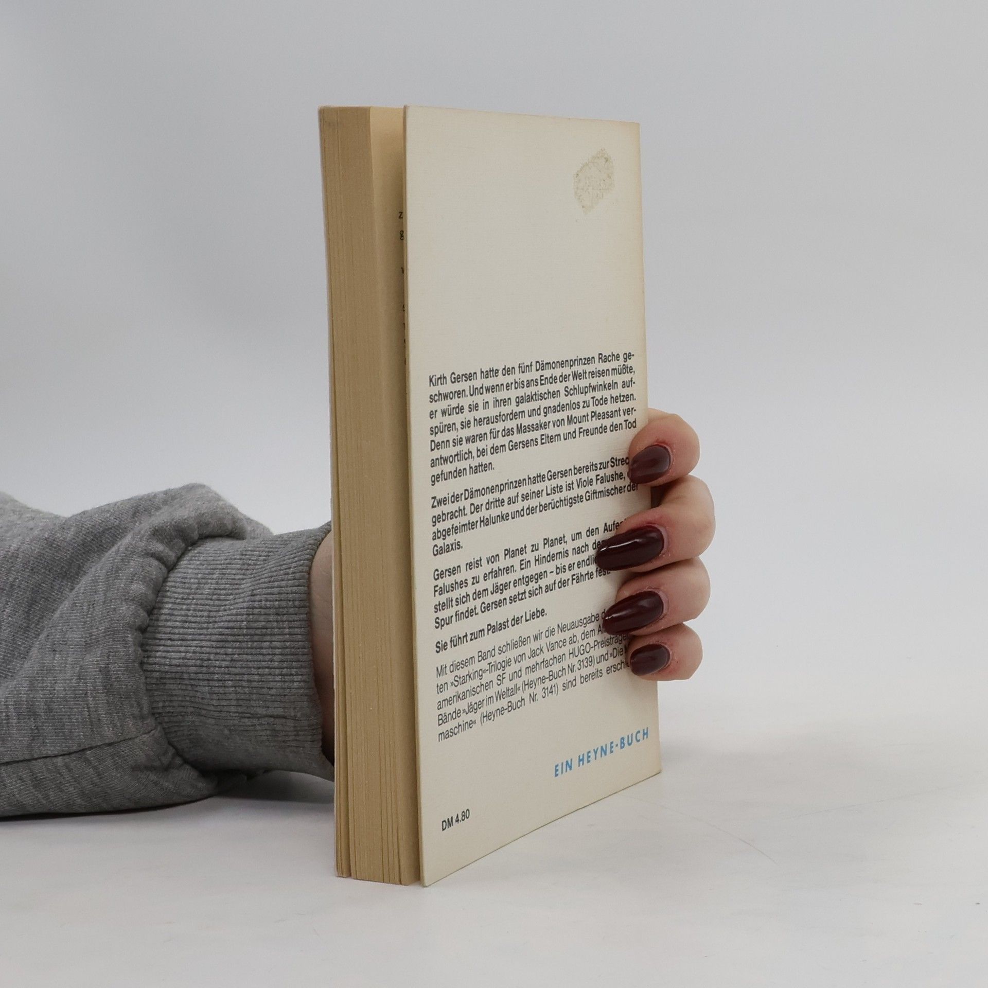 Die Jagd auf die Dämonenprinzen geht weiter Kirth Gersen hat den fünf Dämonenprinzen Rache geschworen, die einst das Massaker von Mount Pleasant verübten, bei dem Gersens Eltern und Freunde starben. Und wenn er bis ans Ende der Galaxis reisen müsste, er würde sie aufspüren, herausfordern und gnadenlos zu Tode hetzen. Zwei der Dämonenprinzen hat er schon zur Strecke gebracht. Der dritte auf seiner Liste ist der abgefeimte Giftmischer Viole Falushe. Doch der hält sich gut versteckt. Gersen reist von Planet zu Planet, um seinen Aufenthaltsort herauszubekommen. Ein Hindernis nach dem anderen stellt sich dem Jäger in den Weg – bis er endlich eine heiße Spur hat. Sie führt ihn zum Palast der Liebe …