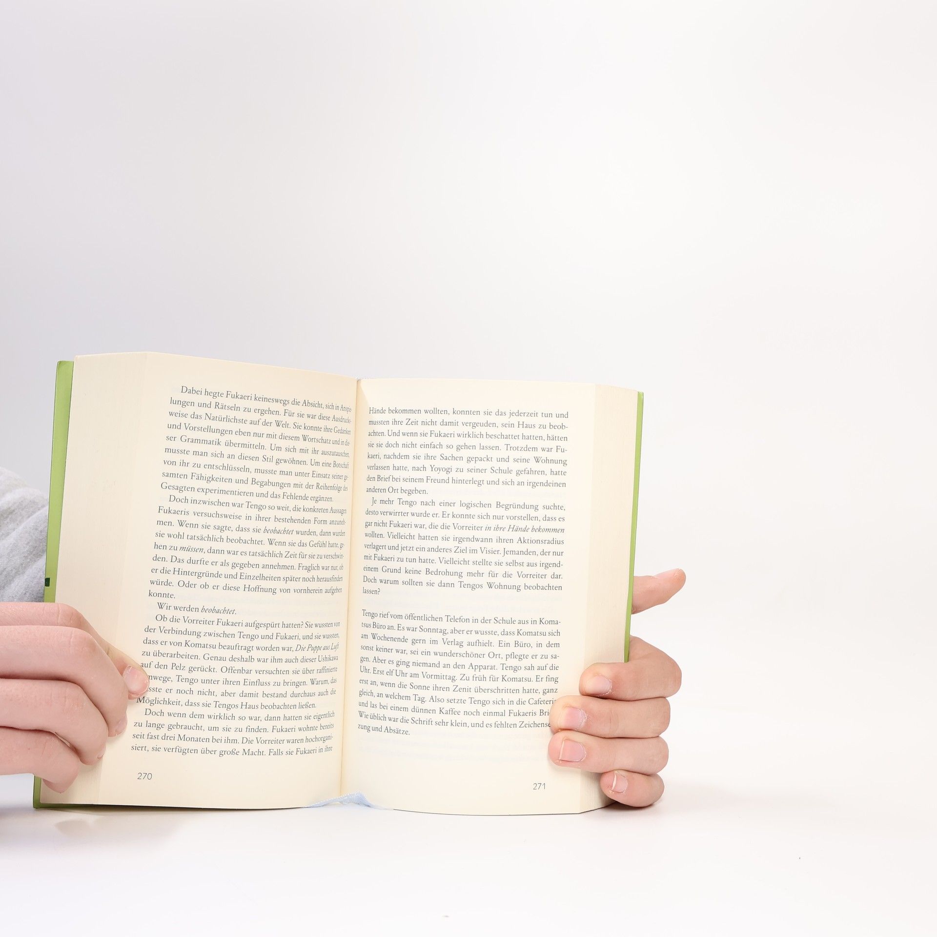 Als Tengo seinen komatösen Vater im Krankenhaus besuchen will, findet er in dessen Krankenbett eine »Puppe aus Luft« vor, die ein Abbild Aomames als junges Mädchen in sich birgt. Er greift nach ihrer Hand, und eine unsichtbare Verbindung entsteht. Fortan wartet Tengo darauf, der Puppe nochmals zu begegnen, doch vergebens. War das Signal nicht stark genug, um die zwischen Leben und Tod schwankende Aomame zu retten?