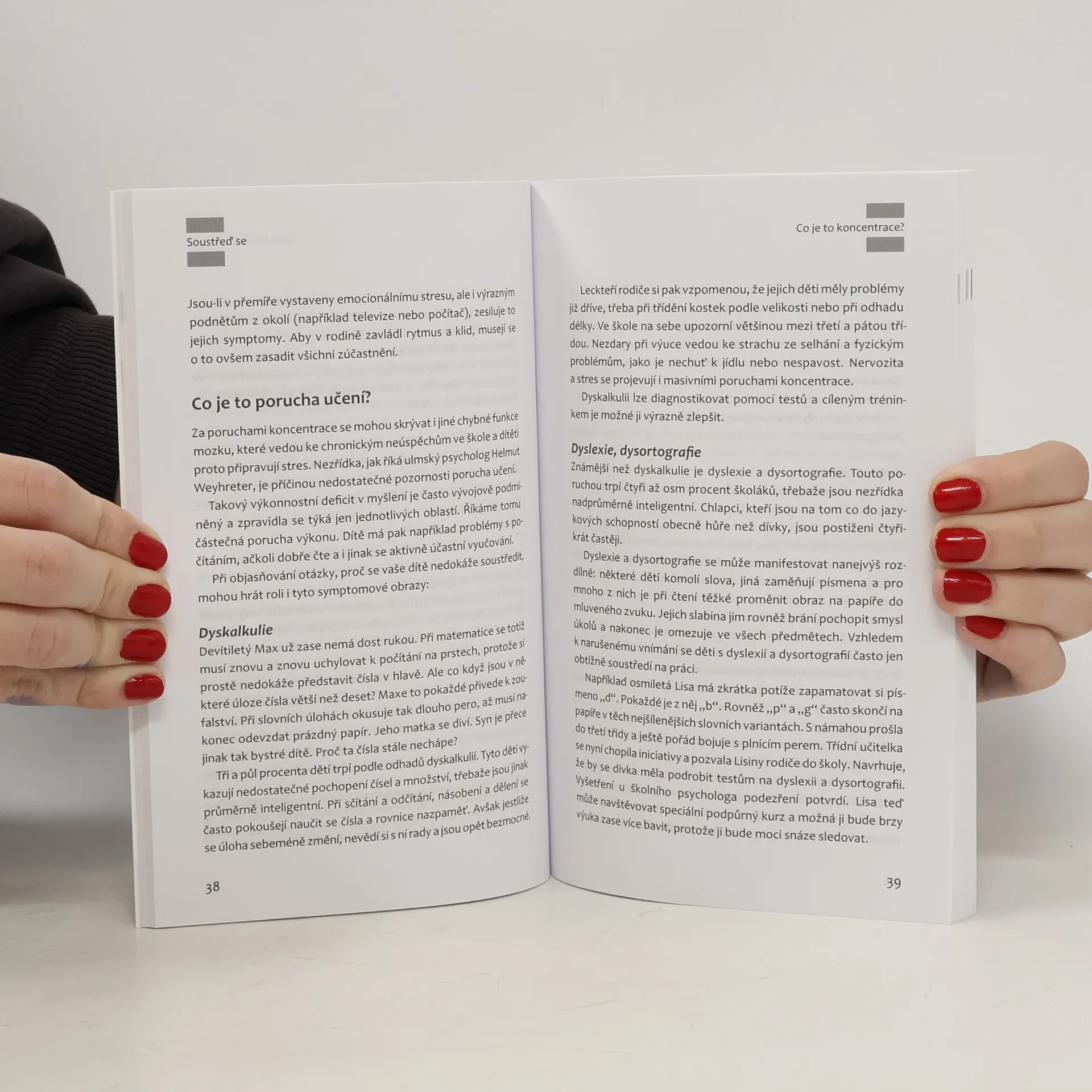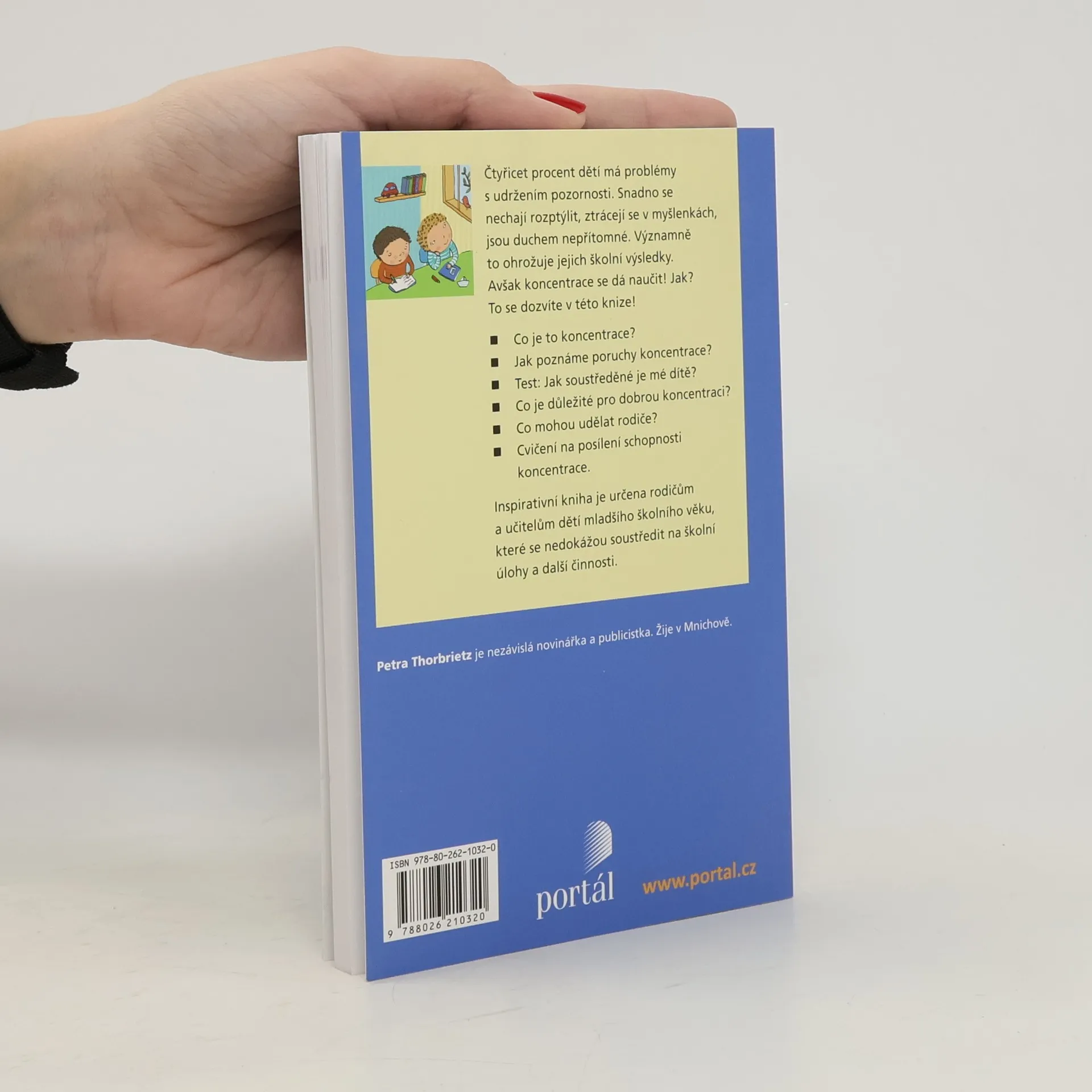 Autorka vychází z předpokladu, že dnešní děti čelí takové řadě podnětů a nejrůznějších lákadel, že je pro ně stále obtížnější vnímat konkrétní téma, soustředit se na vyučování, zvládat plynule a bez zbytečných odkladů domácí úkoly. Výzkumy prokázaly, že se soustředěním má vážné problémy kolem 40 % dětí. Bez koncentrace však nelze uspět. Tento rádce názorně ukazuje, co se vlastně odehrává v dětské hlavě, jak lze rozpoznat nedostatky v soustředění a jak mohou rodiče pomoci svým dětem, aby se dokázaly lépe koncentrovat – ať už vytvořením správného prostředí, dostatečnou tělesnou aktivitou nebo praktickými cvičeními. Test, rozdělený podle věkových skupin, pomůže rodičům určit, kde leží potenciál jejich dítěte a jaké jsou jeho slabé stránky.