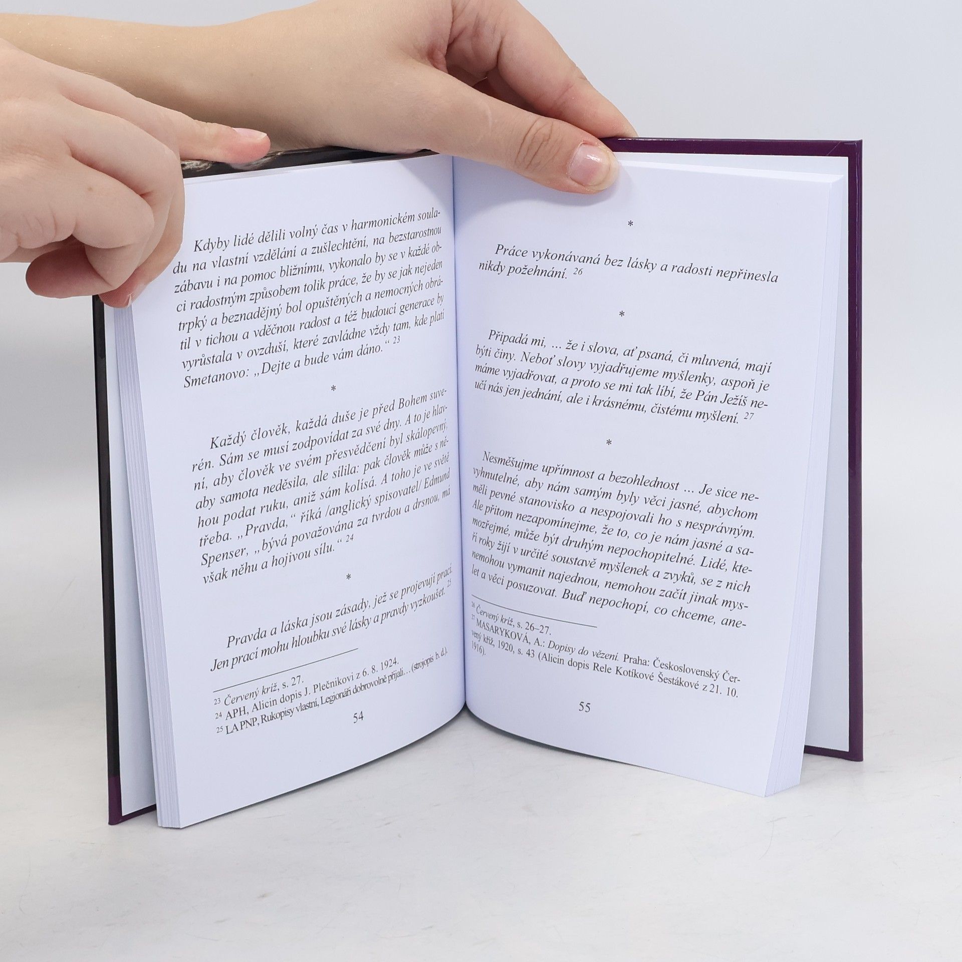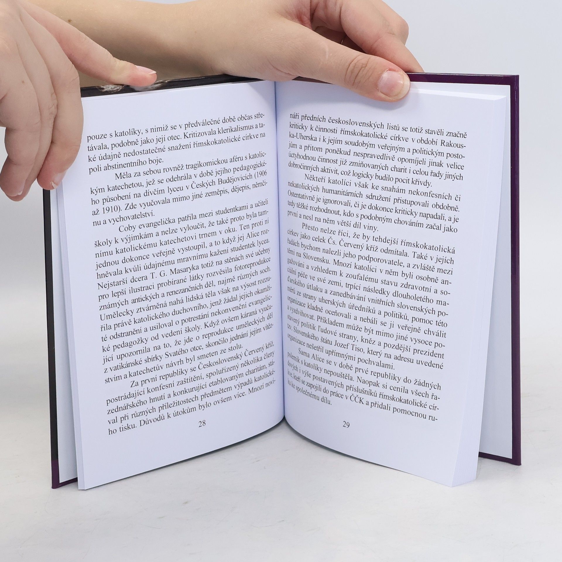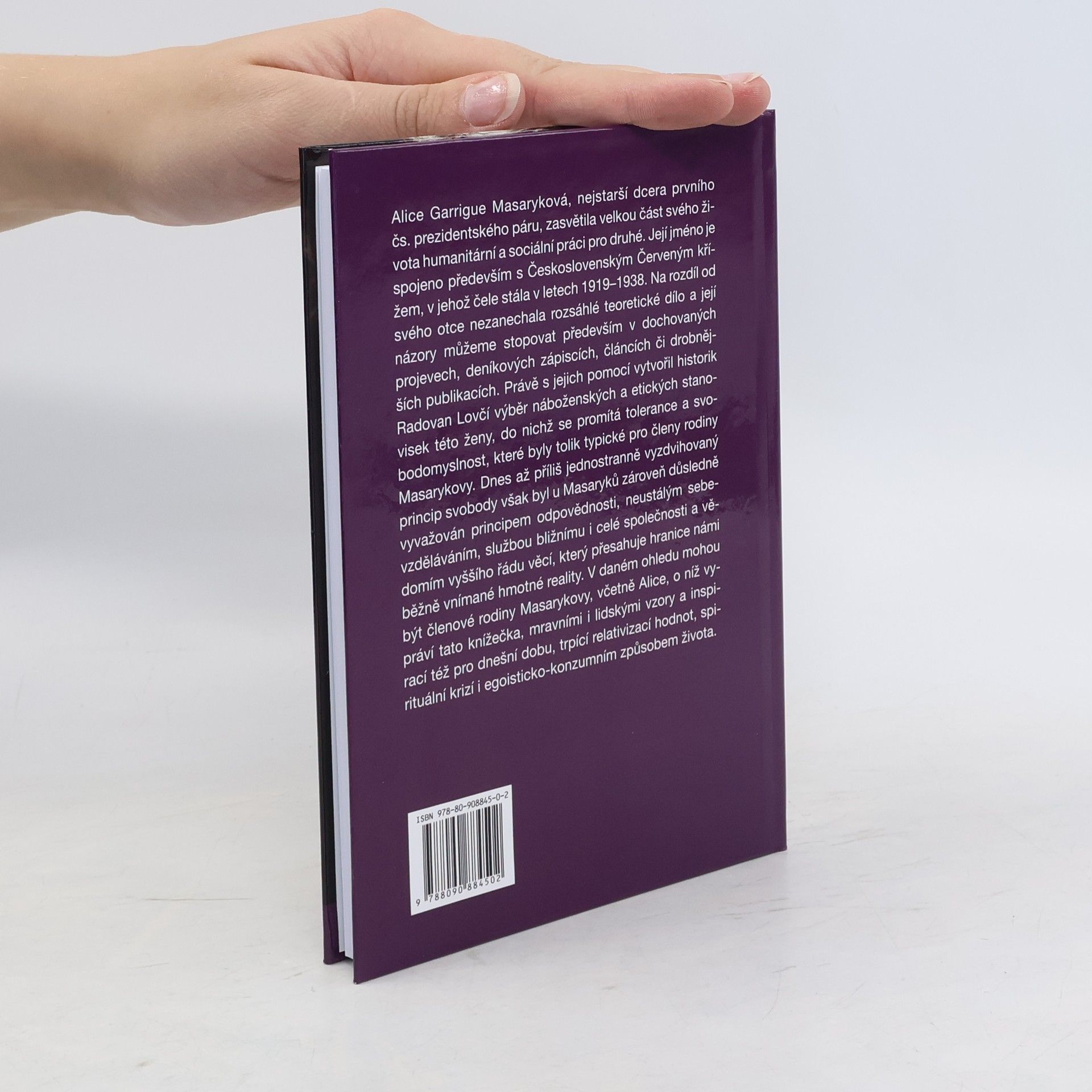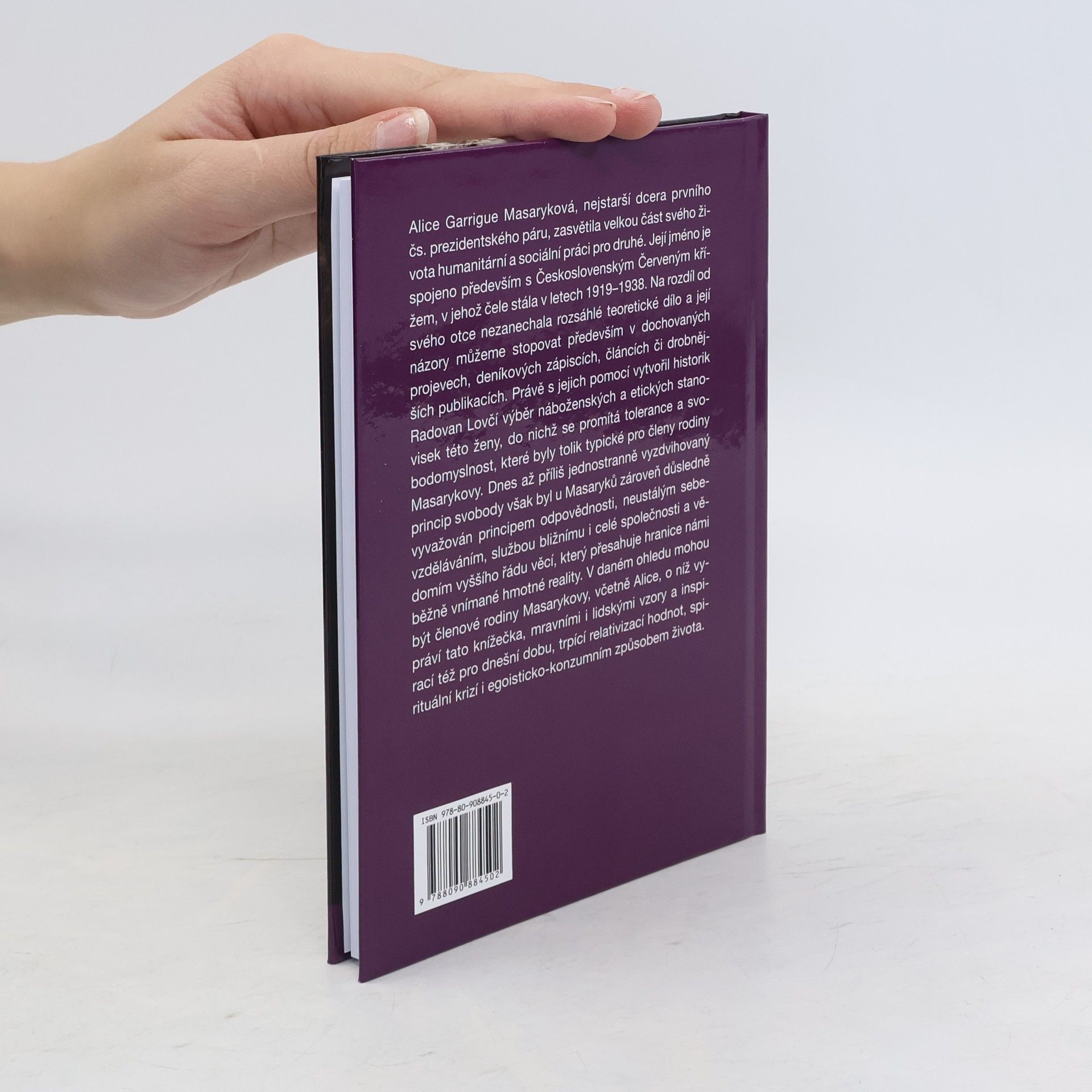 Alice Garrigue Masaryková, nejstarší dcera prvního čs. prezidentského páru, zasvětila velkou část svého života humanitární a sociální práci pro druhé. Její jméno je spojeno především s Československým Červeným křížem, v jehož čele stále v letech 1919-1938. Na rozdíl od svého otce nezanechala rozsáhlé teoretické dílo a její názory můžeme stopovat především v dochovaných projevech, deníkových zápiscích, článcích či drobnějších publikacích. Právě s jejich pomocí vytvořil historik Radovan Lovčí výběr náboženských a etických stanovisek této ženy, do nichž se promítá tolerance a svobodomyslnost, které byly tolik typické pro členy rodiny Masarykovy. Dnes až příliš jednostranně vyzdvihovaný princip svobody však byl u Masaryků zároveň důsledně vyvažován principem odpovědnosti, neustálým sebevzděláváním, službou bližnímu i celé společnosti a vědomím vyššího řádu věcí, který přesahuje hranice námi běžně vnímané hmotné reality. V daném ohledu mohou být členové rodiny Masarykovy, včetně Alice, o níž vypráví tato knížečka, mravními i lidskými vzory a inspirací též pro dnešní dobu, trpící relativizací hodnot, spirituální krizí i egoisticko-konzumním způsobem života. Autor v tiráži uvádí, že jde o 2., rozšířené a částečně přepracované vydání původně brožury z roku 2009.