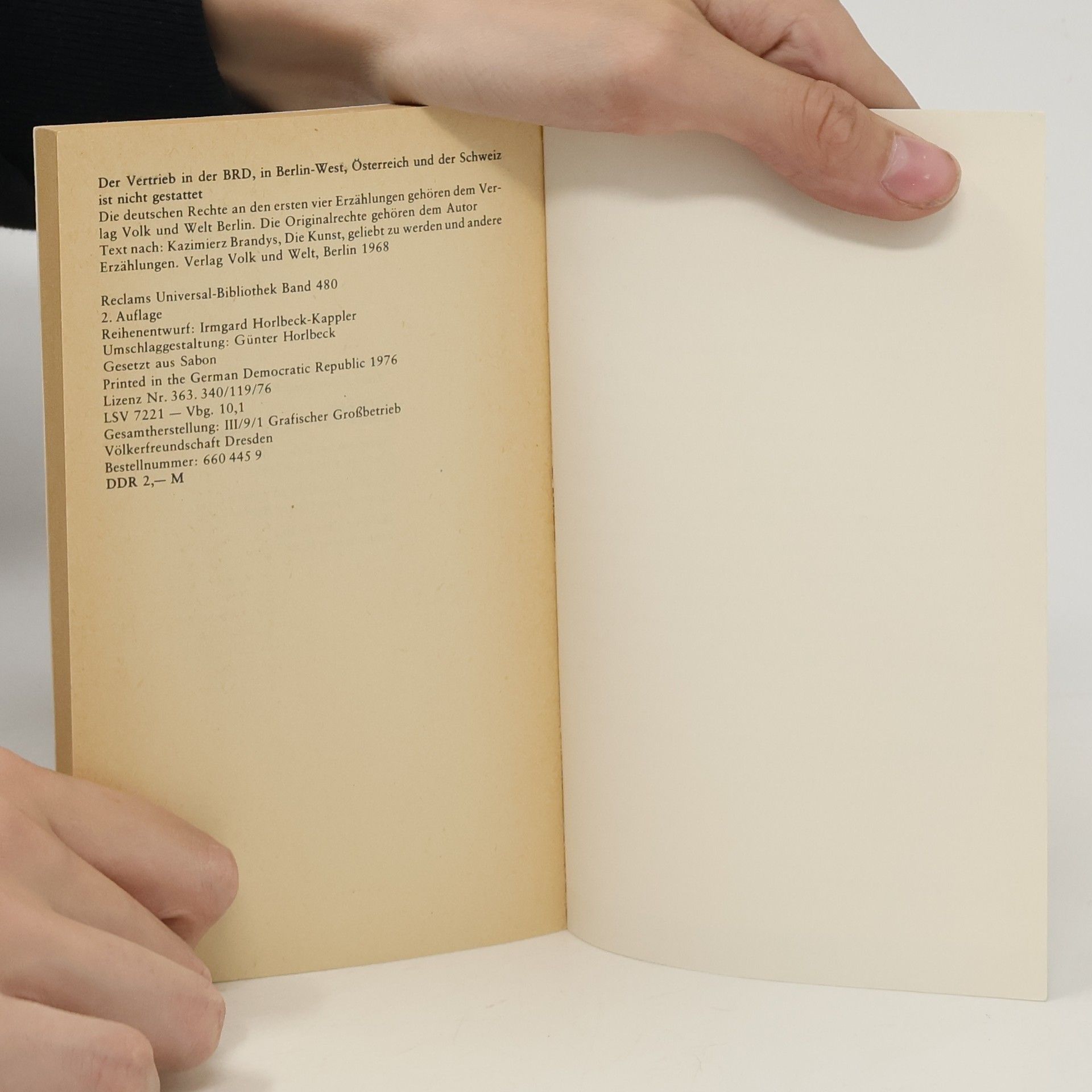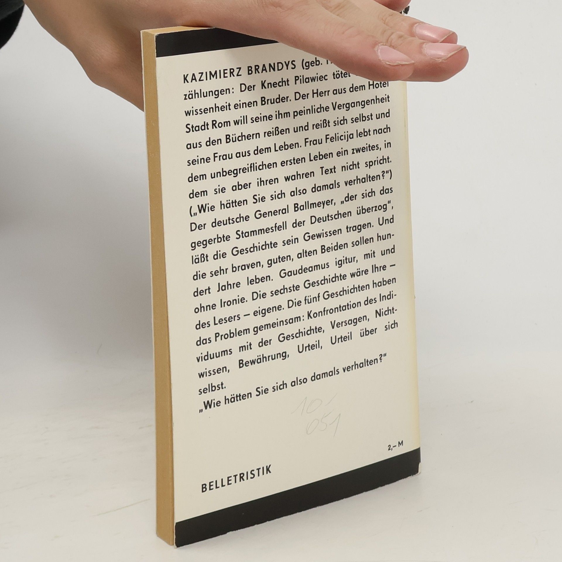 Kazimierz Brandys (geb. 1916). Fünf Erzählungen: Der Knecht Pilawiec tötet aus Unwissenheit seinen Bruder. Der Herr aus dem Hotel Stadt Rom will seine ihm peinliche Vergangenheit aus den Büchern reißen und reißt sich selbst und seine Frau aus dem Leben. Frau Felicija lebt nach dem unbegreiflichen ersten Leben ein zweites, in dem sie aber ihren wahren Text nicht spricht. ("Wie hätten Sie sich also damals verhalten?") Der deutsche General Ballmeyer, "der sich das gegerbte Stammesfell der Deutschen überzog", läßt die Geschichte sein Gewissen tragen. Und die sehr braven, guten, alten Beiden sollen hundert Jahre leben. Gaudeamus igitur, mit und ohne Ironie. Die sechste Geschichte wäre Ihre - des Lesers - eigene. Die fünf Geschichten haben das Problem gemeinsam: Konfrontation des Individuums mit der Geschichte, Versagen, Nichtwissen, Bewährung, Urteil, Urteil über sich selbst."Wie hätten Sie sich also damals verhalten?"