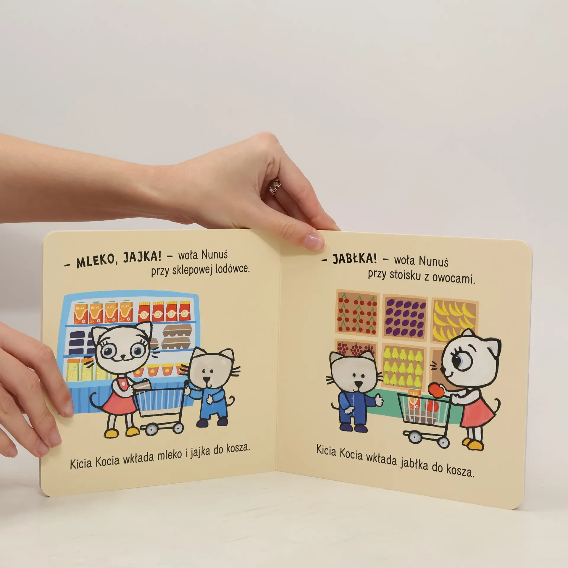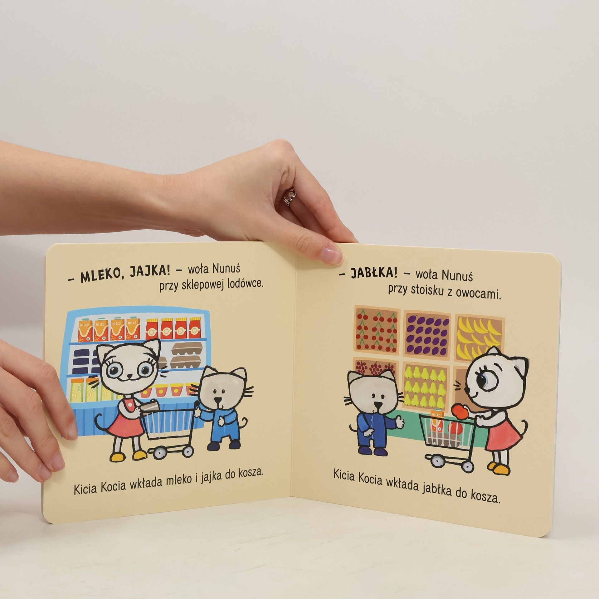 Kicia Kocia i Nunuś samodzielnie robią zakupy. Nunuś jest bardzo podekscytowany! Trzeba zapamiętać, co się chce kupić – potrzebne są jajka, mleko, jabłka i mydło. Nunuś o wszystkim pamięta i dzielnie pomaga Kici Koci.