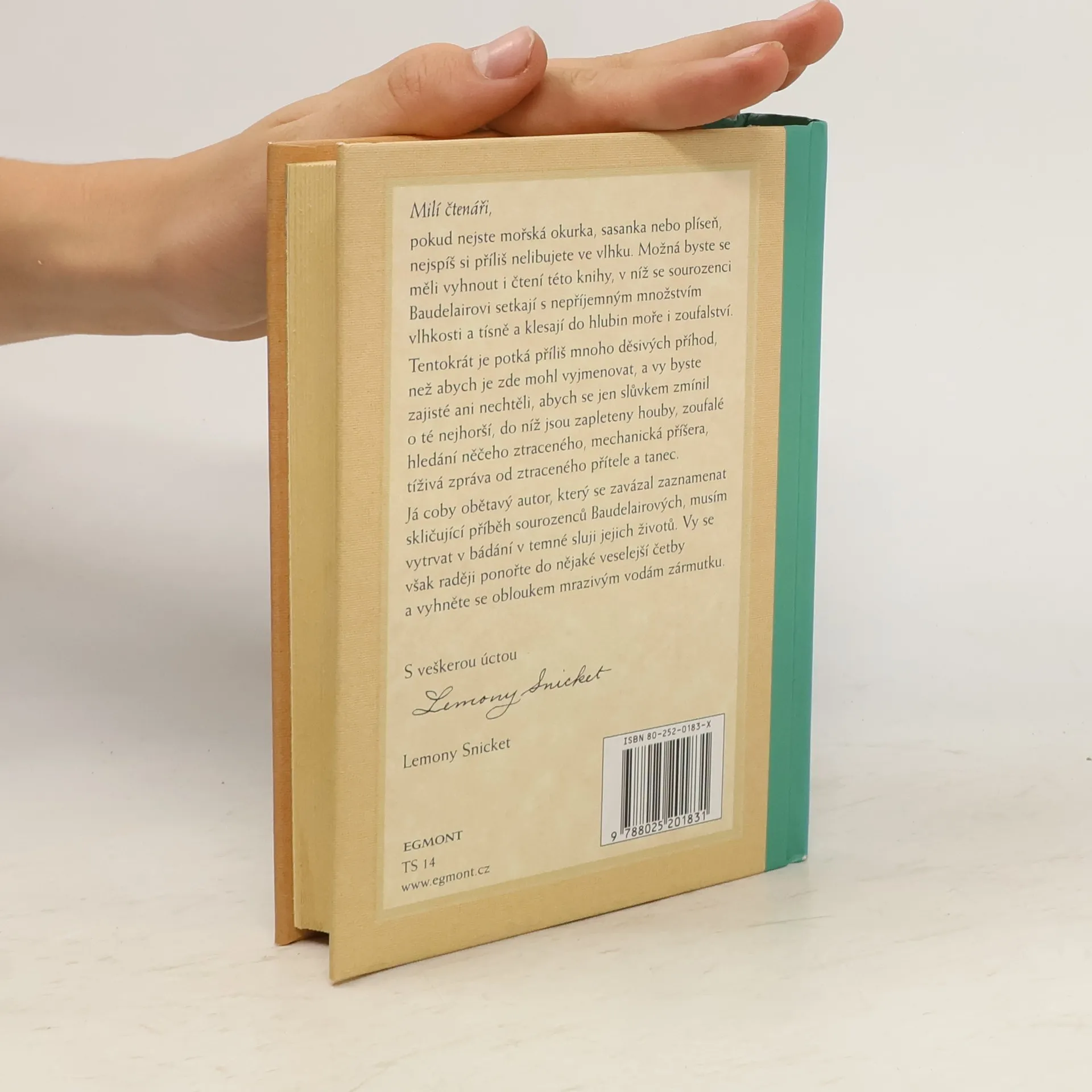 Milí čtenáři, pokud nejste mořská okurka, sasanka nebo plíseň, nejspíš si příliš nelibujete ve vlhku. Možná byste se měli vyhnout i čtení této knihy, v níž se sourozenci Baudelairovi setkají s nepříjemným množstvím vlhkosti a tísně a klesají do hlubin moře i zoufalství. Tentokrát je potká příliš mnoho děsivých příhod, než aby se zde mohly vyjmenovat, a vy byste zajisté ani nechtěli vědět o té nejhorší, do níž jsou zapleteny houby, zoufalé hledání něčeho ztraceného, mechanická příšera, tíživá zpráva od ztraceného přítele a tanec. Obětavý autor se však zavázal zaznamenat skličující příběh sourozenců Baudelairových a musí vytrvat v bádání v temné sluji jejich životů.