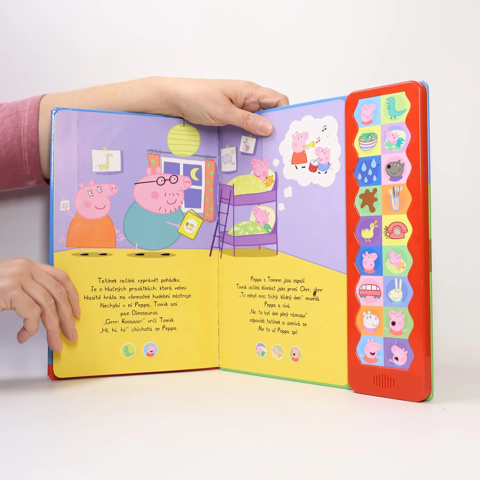 Maminka Prasátková se těší, jak si všichni užijí příjemné, tiché nedělní odpoledne. To by ovšem za Peppou a Tomem nesměli dorazit kamarádi! Hrací knížka s 18 veselými zvuky vás rozhodně nenechá v klidu!