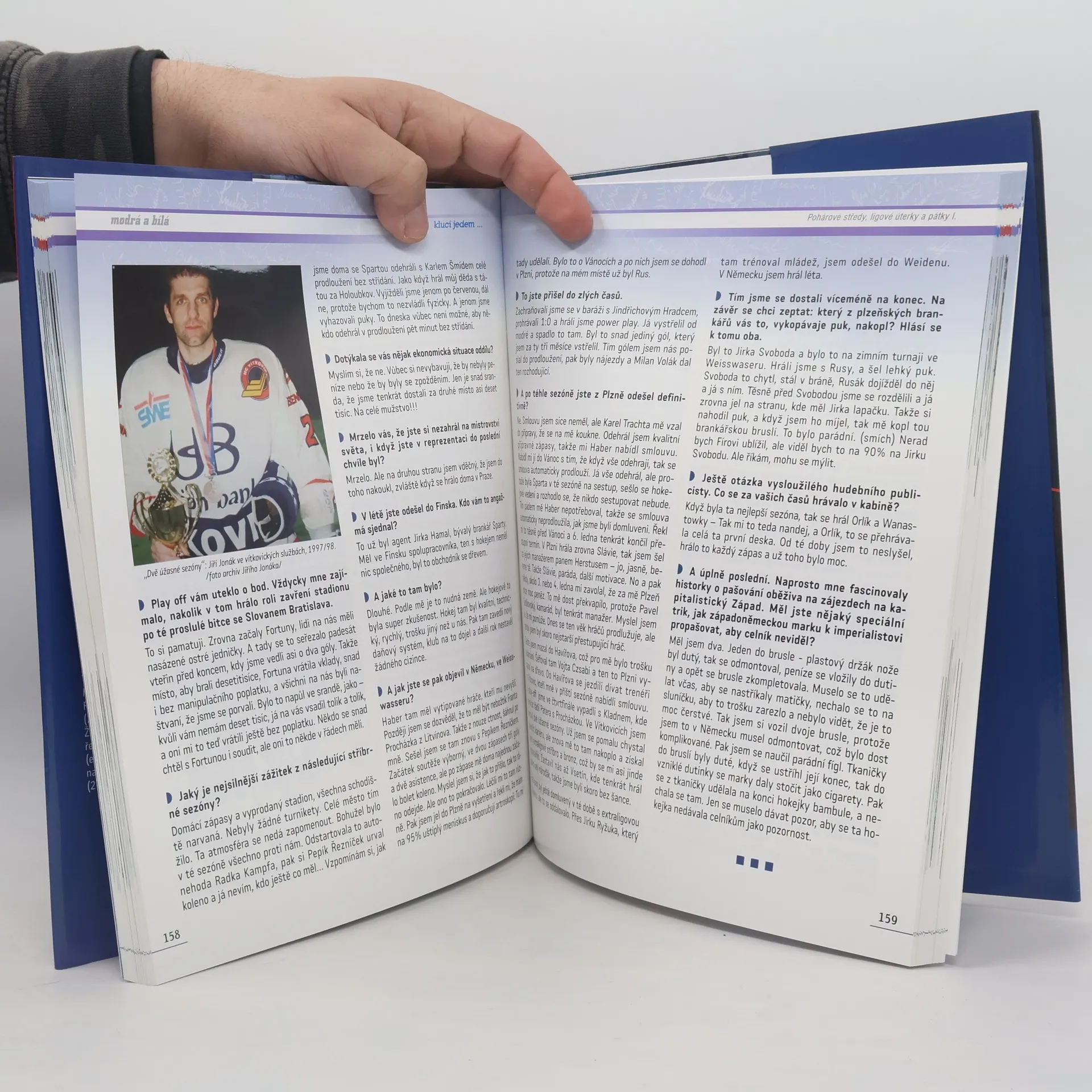 Modrá a bílá, kluci jedem je kniha určená všem příznivcům hokeje, zejména pak hokeje plzeňského. 44 hokejistů zvučných jmen, kteří za dobu své hokejové kariéry strávili několik sezón v Plzni, vypráví svůj sportovní a životní příběh. Protagonisty knihy se mimo jiné stal Bohuslav Ebermann, Marek Sýkora, Vladimír Bednář, Martin Straka, Jaroslav Špaček, Milan Razým…. V historii hokeje je pořád co vyprávět, o čem mluvit, co objevovat - což autor knihou vrchovatě dokazuje.