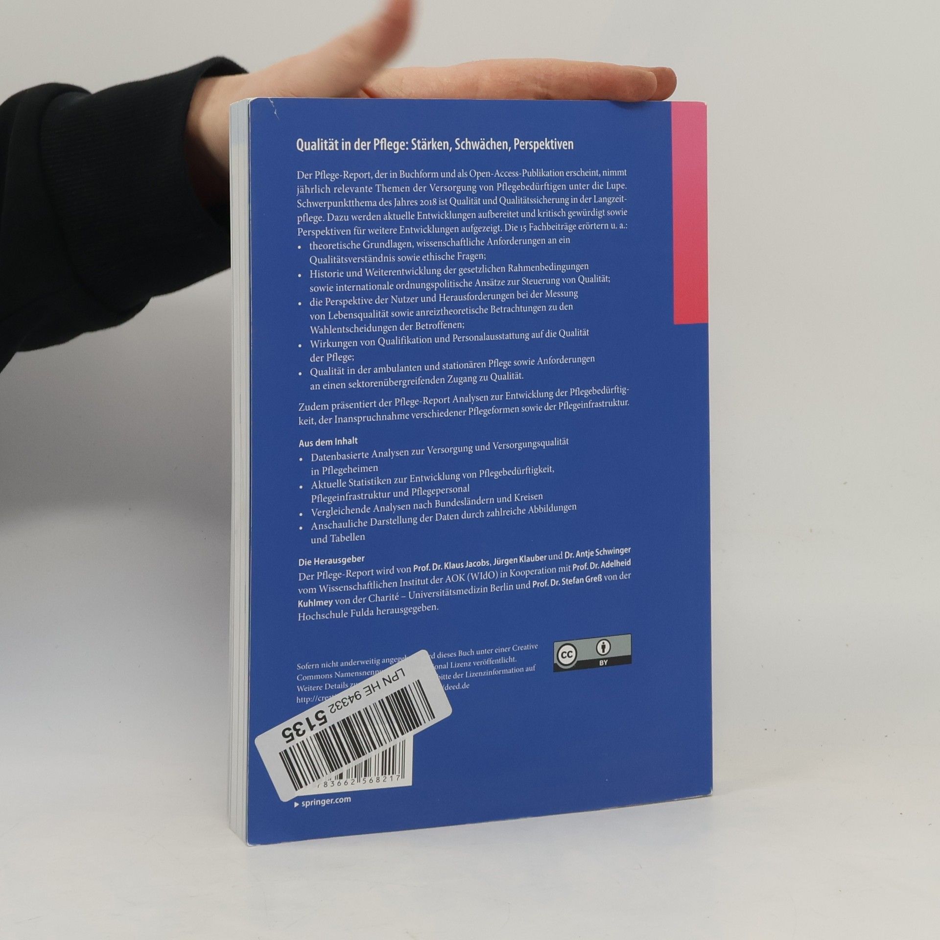 Qualität in der Stärken, Schwächen, PerspektivenDer Pflege-Report, der in Buchform und als Open-Access-Publikation erscheint, nimmt jährlich relevante Themen der Versorgung von Pflegebedürftigen unter die Lupe. Schwerpunktthema des Jahres 2018 ist Qualität und Qualitätssicherung in der Langzeitpflege. Dazu werden aktuelle Entwicklungen aufbereitet und kritisch gewürdigt sowie Perspektiven für weitere Entwicklungen aufgezeigt. Die 15 Fachbeiträge erörtern Darüber hinaus präsentiert der Pflege-Report Analysen zur Entwicklung der Pflegebedürftigkeit, der Inanspruchnahme verschiedener Pflegeformen sowie der Pflegeinfrastruktur.Aus dem Inhalt Die HerausgeberDer Pflege-Report wird von Prof. Dr. Klaus Jacobs , Jürgen Klauber und Dr. Antje Schwinger vom Wissenschaftlichen Institut der AOK (WIdO) in Kooperation mit Prof. Dr. Adelheid Kuhlmey von der Charité - Universitätsmedizin Berlin und Prof. Dr. Stefan Greß von der Hochschule Fulda herausgegeben.