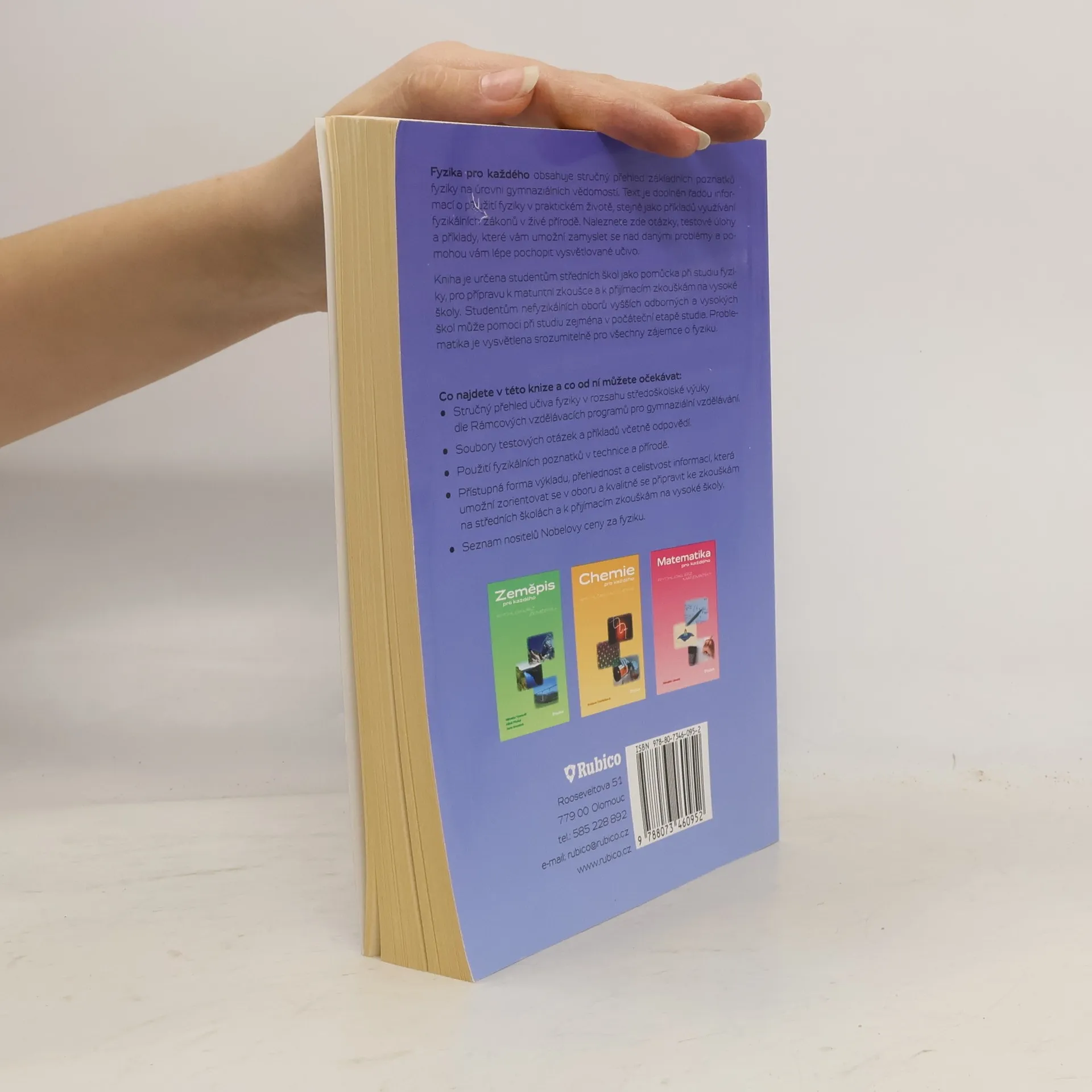 Fyzika pro každého obsahuje stručný přehled základních poznatků fyziky na úrovni gymnaziálních vědomostí. Text je doplněn řadou informací o použití fyziky v praktickém životě, stejně jako příkladů využívání fyzikálních zákonů v živé přírodě. Naleznete zde otázky, testové úlohy a příklady, které vám umožní zamyslet se nad danými problémy a pomohou vám lépe pochopit vysvětlované učivo. Kniha je určena studentům středních škol jako pomůcka při studiu fyziky, pro přípravu k maturitní zkoušce a k přijímacím zkouškám na vysoké školy. Studentům nefyzikálních oborů vyšších odborných a vysokých škol může pomoci při studiu zejména v počáteční etapě studia. Problematika je vysvětlena srozumitelně pro všechny zájemce o fyziku.