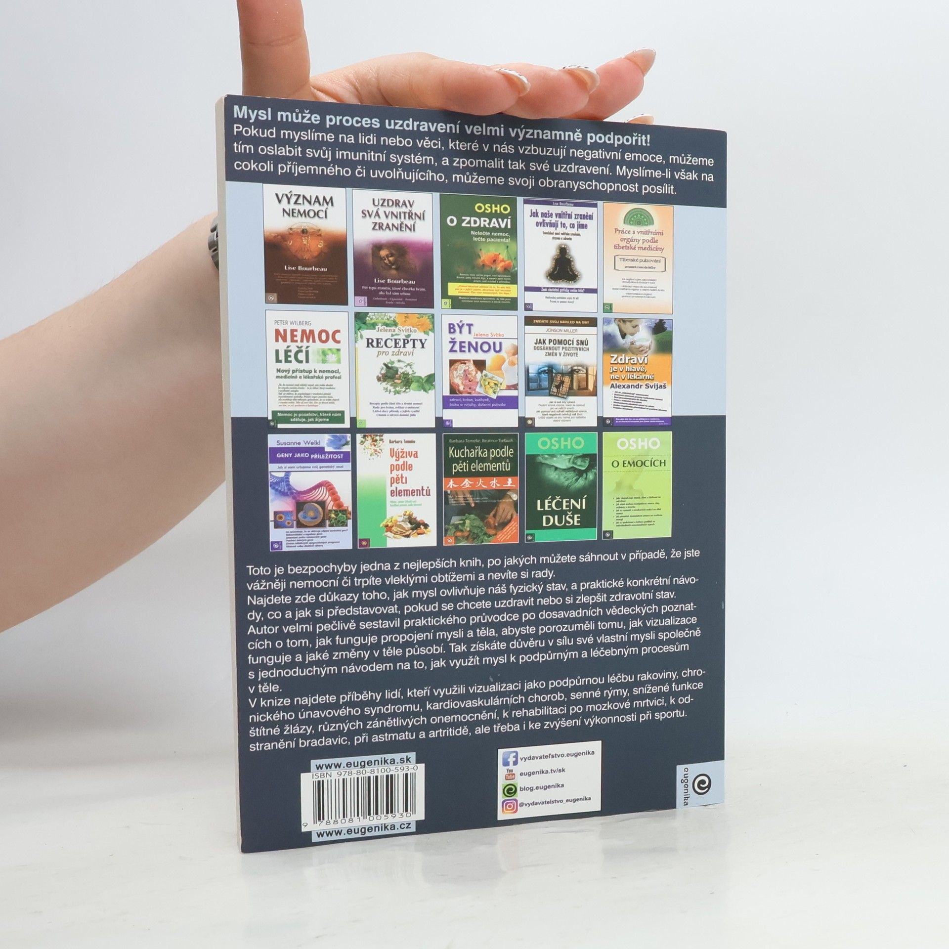 Tato kniha je jedním z nejlepších průvodců pro ty, kteří čelí vážným zdravotním problémům nebo chronickým obtížím. Obsahuje důkazy o tom, jak mysl ovlivňuje fyzický stav, podložené vědeckými studiemi a úspěšnými příklady. Nabízí konkrétní návody na vizualizace, které mohou pomoci při uzdravování nebo zlepšení zdraví. Tyto vizualizace jsou zábavné a povzbudivé, což přispívá k pozitivnímu naladění a celkovému zlepšení stavu. Autor pečlivě shrnuje vědecké poznatky o propojení mysli a těla, aby čtenáři porozuměli, jak vizualizace fungují a jaké změny vyvolávají v těle. Kniha obsahuje příběhy lidí, kteří vizualizaci využili jako podpůrnou léčbu při různých onemocněních, včetně rakoviny, chronického únavového syndromu, kardiovaskulárních chorob a dalších. Ukazuje, jak může mysl významně podpořit proces uzdravení. Negativní myšlenky mohou oslabit imunitní systém a zpomalit uzdravení, zatímco pozitivní a uvolňující myšlenky mohou obranyschopnost posílit. Tato kniha je cenným zdrojem pro každého, kdo hledá alternativní přístupy k léčbě a zlepšení zdraví.