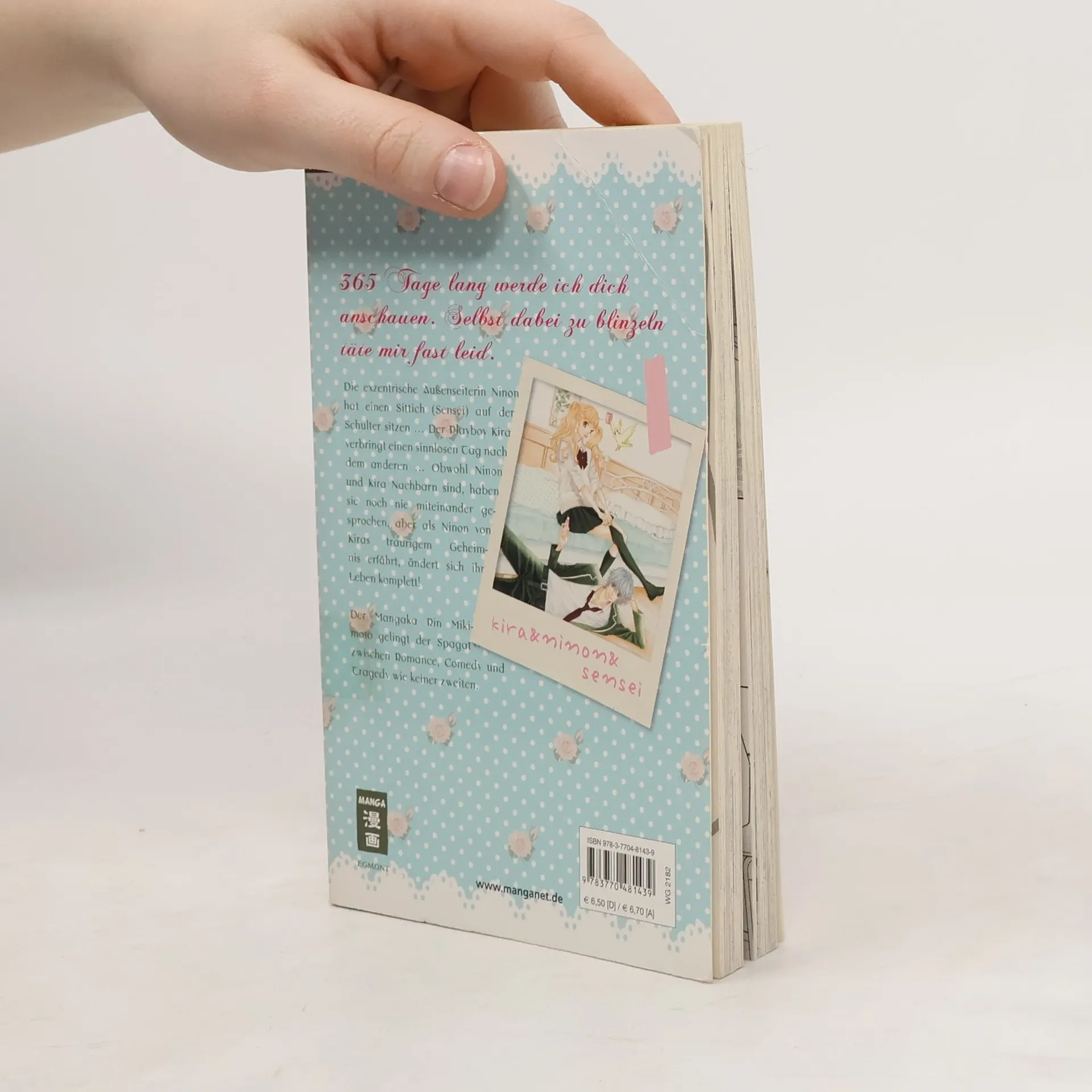 „365 Tage lang werde ich dich anschauen. Selbst dabei zu blinzeln täte mir fast leid.“ Die exzentrische Außenseiterin Ninon hat einen Sittich (Sensei) auf der Schulter sitzen … Der Playboy Kira verbringt einen sinnlosen Tag nach dem anderen … Obwohl Ninon und Kira Nachbarn sind, haben sie noch nie miteinander gesprochen, aber als Ninon von Kiras traurigem Geheimnis erfährt, ändert sich ihr Leben komplett! Der Mangaka Rin Mikimoto gelingt der Spagat zwischen Romance, Comedy und Tragedy wie keiner zweiten.