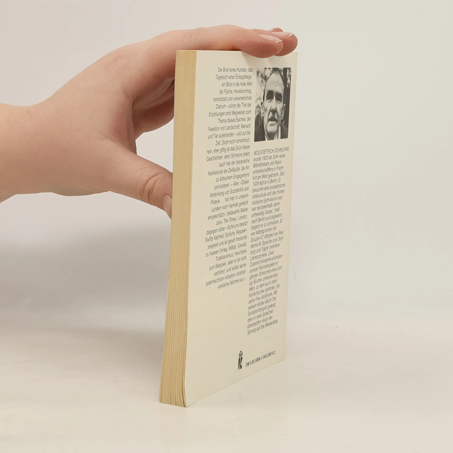 Der Brief eines Hundes, das Tagebuch einer Eintagsfliege, ein Blick in die heile Welt der Fische, Havelsonntag, Herbstblatt und vorwinterliches Diarium - schon die Titel der Erzählungen sind Wegweiser zum Thema dieses Buches: der Reaktion von Landschaft, Mensch und Tier aufeinander - und auf die Zeit. Doch nicht romantisch, nein, eher giftig ist das Grün dieser Geschichten, denn Schnurre bleibt auch hier der literarische Karikaturist der Zeitläufe, die ihn zu kritischem Engagement provozieren.