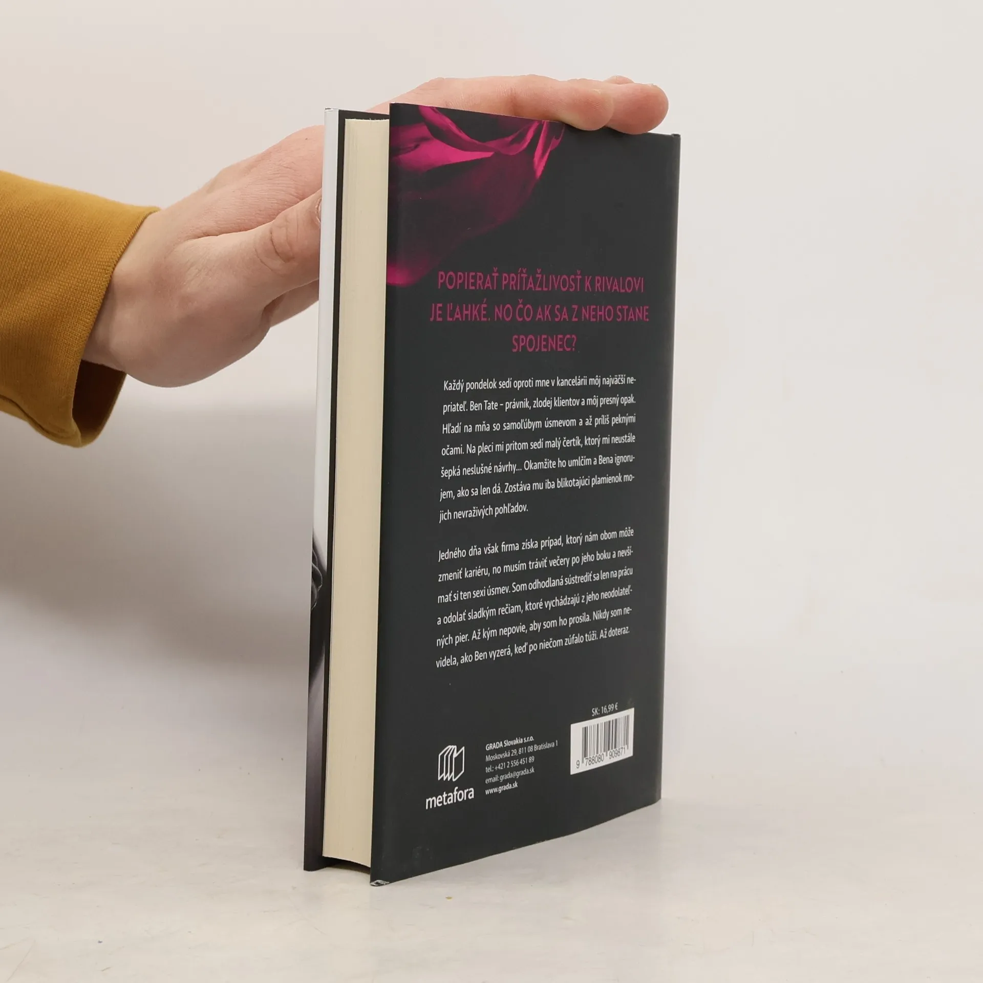 Každý pondelok sedí oproti mne v kancelárii môj najväčší nepriateľ. Ben Tate – právnik, zlodej klientov a môj presný opak. Hľadí na mňa so samoľúbym úsmevom a až príliš peknými očami. Na pleci mi pritom sedí malý čertík, ktorý mi neustále šepká neslušné návrhy... Okamžite ho umlčím a Bena ignorujem, ako sa len dá. Zostáva mu iba blikotajúci plamienok mojich nevraživých pohľadov. Jedného dňa však firma získa prípad, ktorý nám obom môže zmeniť kariéru, no musím tráviť večery po jeho boku a nevšímať si ten sexi úsmev. Som odhodlaná sústrediť sa len na prácu a odolať sladkým rečiam, ktoré vychádzajú z jeho neodolateľných pier. Až kým nepovie, aby som ho prosila. Nikdy som nevidela, ako Ben vyzerá, keď po niečom zúfalo túži. Až doteraz.