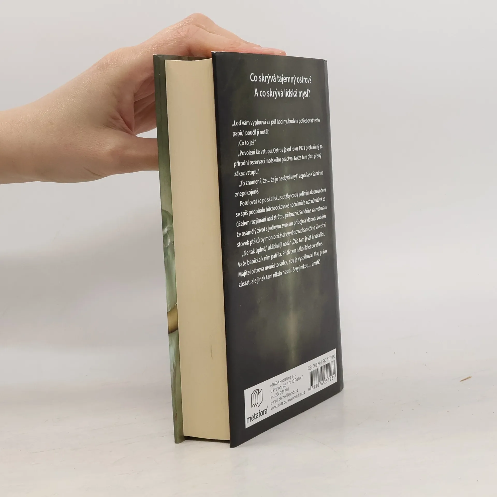 Jediná možnost, jak přežít, je uniknout... Co skrývá tajemný ostrov? A co skrývá lidská mysl? Sandrine, která se před nedávnem přistěhovala do Normandie, dostává výzvu od notáře, aby si zajela převzít osobní věci z domu po své zemřelé babičce – svérázné ženě, jež žila osaměle na maličkém ostrově nedaleko pobřeží a odmítala se stýkat s dcerou i s vnučkou. Sandrine vystupuje z lodi na šedivém, chladném ostrově a setkává se s hrstkou obyvatel, starých lidí žijících v téměř naprostém odloučení od civilizace. Všichni jí popisují babičku jako milou a laskavou ženu, tedy obraz daleký tomu, co o ní Sandrine vyprávěla matka. Na ostrově vládne podivná atmosféra. Stačí pár hodin, aby si Sandrine uvědomila, že zdejší obyvatelé skrývají nějaké tajemství. Cosi, z čeho mají hrůzu. Proč tedy odtud nikdo z nich neodjede? Co se stalo s dětmi z prázdninového tábora, narychlo uzavřeného v roce 1949? Namísto odpovědí je mladá žena po několika dnech nalezena, jak bloudí po pláži na pevnině s oblečením zmáčeným krví, která není její… Román získal cenu za nejlepší francouzský román roku 2019, která se uděluje na každoročně konaném literárním festivalu detektivek v Cognacu.