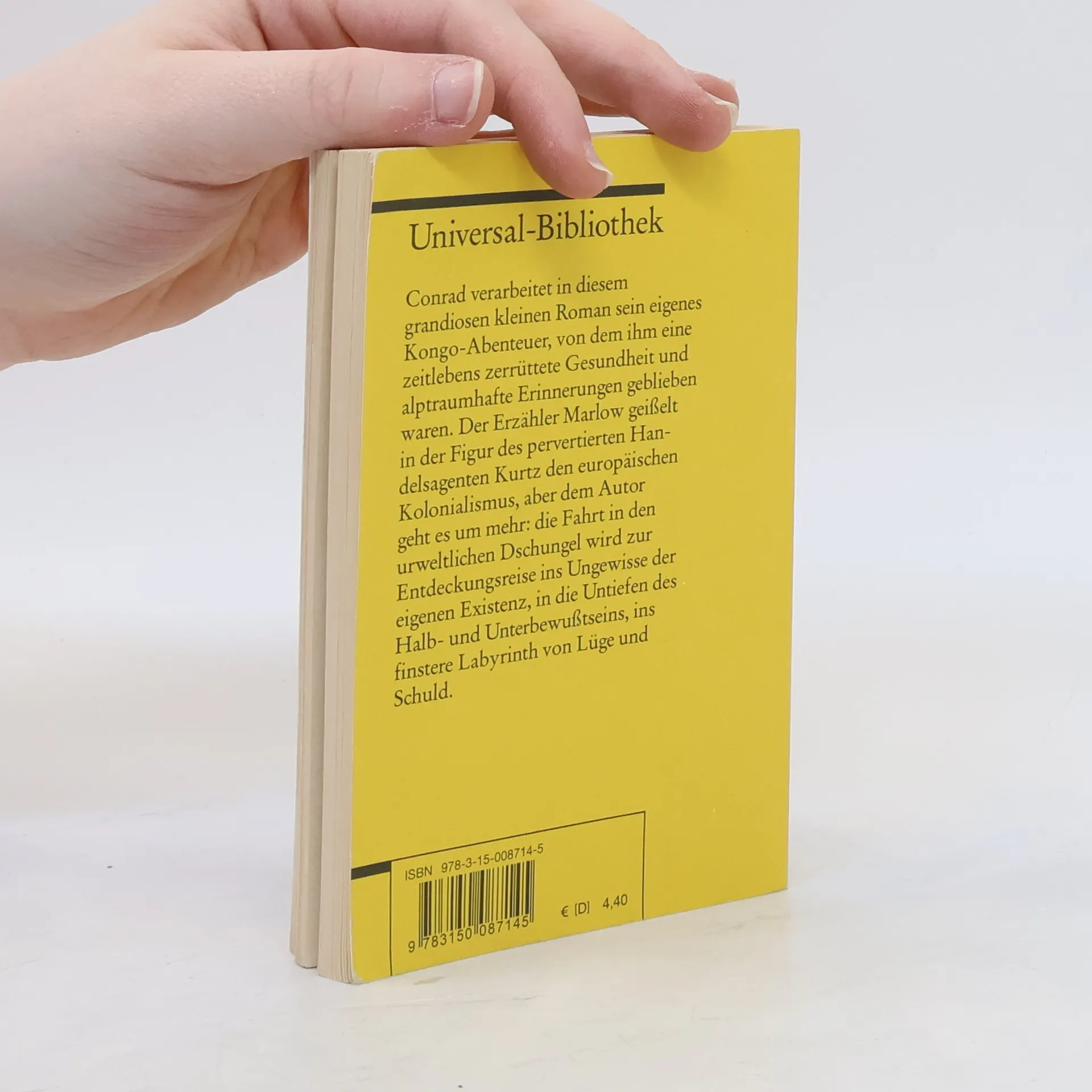 Conrad verarbeitet in diesem grandiosen kleinen Roman (im Original: »Heart of Darkness«) sein eigenes Kongo-Abenteuer, von dem ihm eine zeitlebens zerrüttete Gesundheit und alptraumhafte Erinnerungen geblieben waren. Der Erzähler Marlow geißelt in der Figur des pervertierten Handelsagenten Kurtz den europäischen Kolonialismus, aber dem Autor geht es um mehr: die Fahrt in den urweltlichen Dschungel wird zur Entdeckungsreise ins Ungewisse der eigenen Existenz, in die Untiefen des Halb- und Unterbewusstseins, ins finstere Labyrinth von Lüge und Schuld.