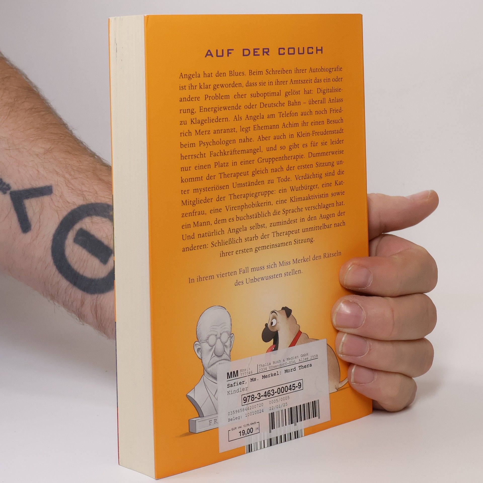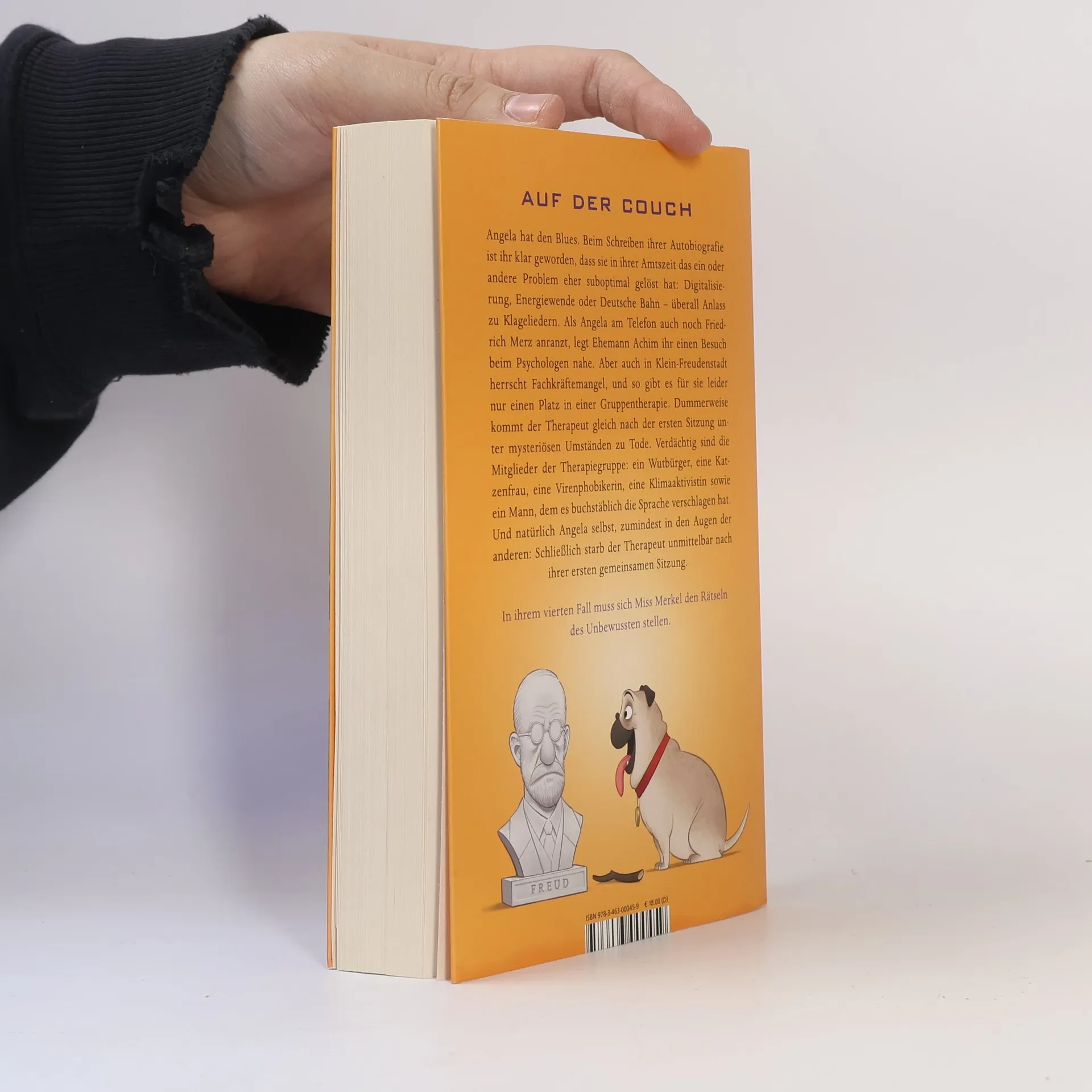 Der vierte Band der Bestseller-Krimireihe um die ermittelnde Altkanzlerin Angela ist niedergeschlagen. Beim Schreiben ihrer Autobiografie ist ihr klar geworden, dass sie in ihrer Amtszeit das ein oder andere Problem des Landes eher suboptimal gelöst hat. Sei es zum Beispiel die Digitalisierung, die Energiewende oder die Bundesbahn, die allesamt Anlass zu Klagegebeten geben. Nachdem Angela auch noch Friedrich Merz anranzt, schlägt Ehemann Achim ihr einen Besuch beim Psychologen vor. Da aber auch in Angelas beschaulichem Heimatort Klein-Freudenstadt Fachkräftemangel herrscht, gibt es für sie nur einen Platz in einer Gruppentherapie bei Doktor Felix Fenstermacher. Dummerweise wird der Therapeut gleich nach der ersten Sitzung auf seinem Hausboot in die Luft gesprengt. Angela bekommt dadurch gleich viel bessere Laune, endlich kann sie wieder ermitteln. Verdächtig sind die Mitglieder der Gruppe: ein Wutbürger, eine Katzenfrau, eine Viren-Phobikerin, eine Klimaaktivistin und ein Mann, dem es buchstäblich die Sprache verschlagen hat. Allerdings fällt der Verdacht der anderen erst einmal auf Angela selbst, schließlich starb der Therapeut gleich nach ihrer ersten gemeinsamen Sitzung.