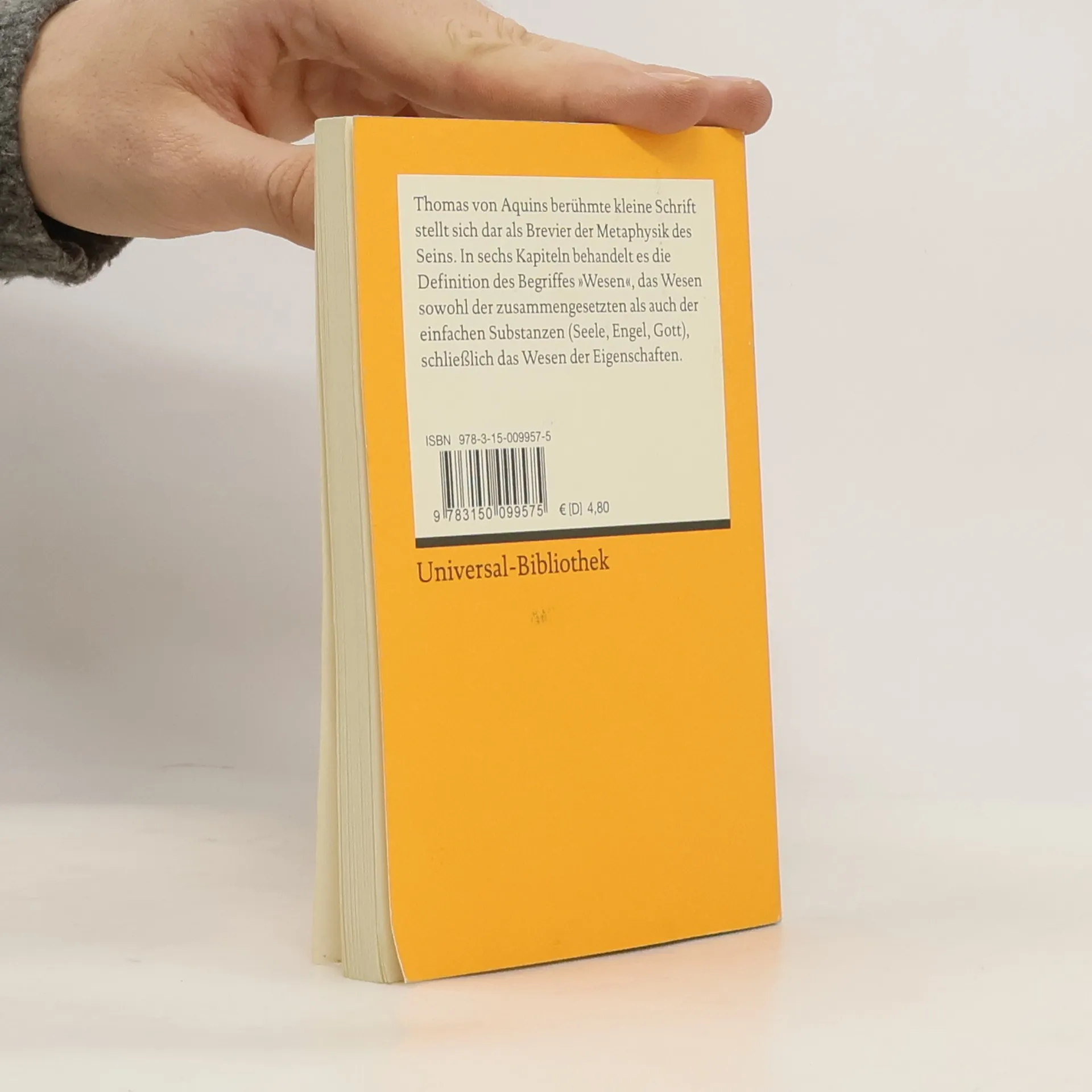 Thomas von Aquins berühmte kleine Schrift stellt sich dar als Brevier der Metaphysik des Seins. In sechs Kapiteln behandelt es die Definition des Begriffes „Wesen“, das Wesen sowohl der zusammengesetzten als auch der einfachen Substanzen (Seele, Engel, Gott), schließlich das Wesen der Eigenschaften. Sprachen: Deutsch, Latein