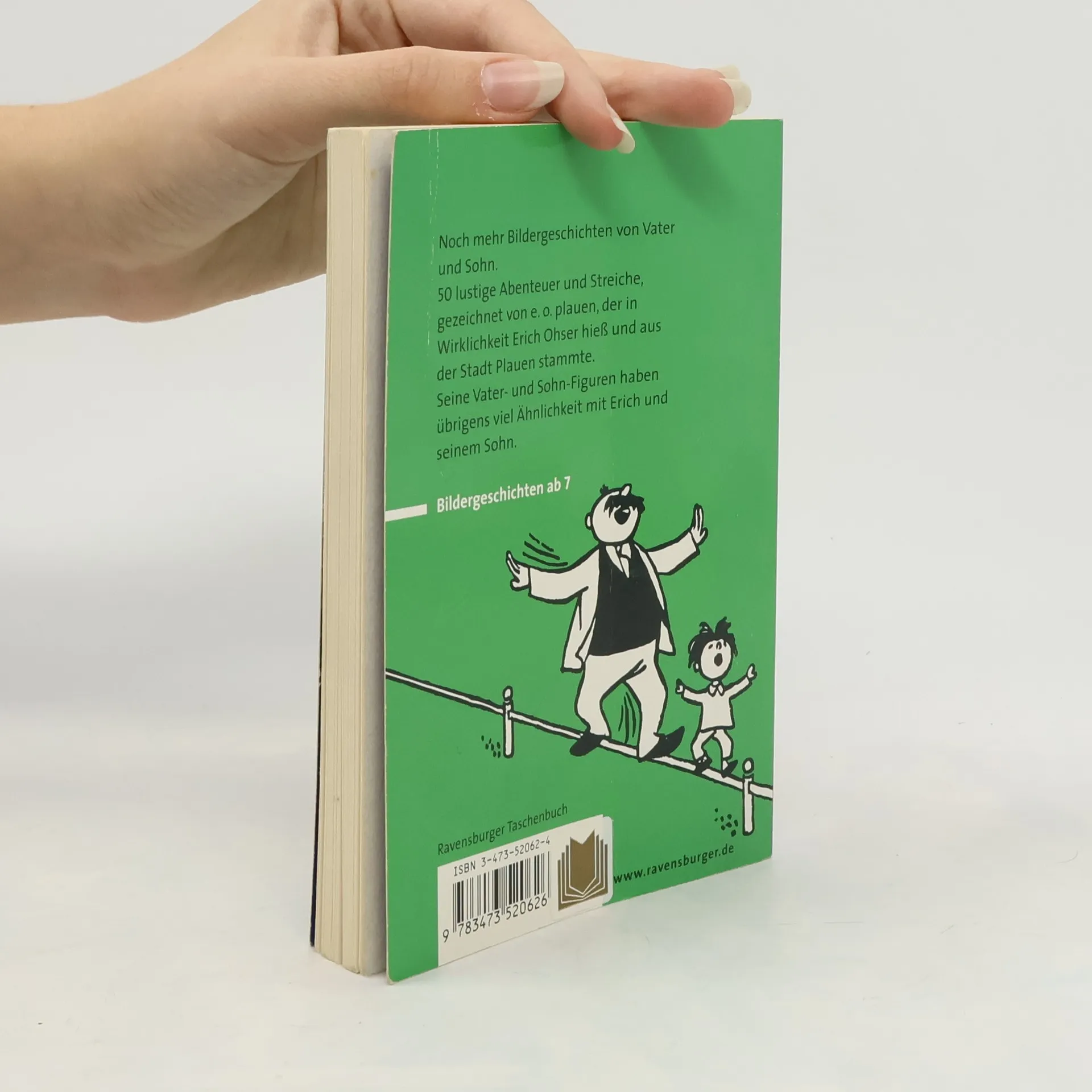 Erich Ohser, bekannt unter dem Pseudonym e.o.plauen, wurde am 18. März 1903 bei Plauen in Sachsen geboren und starb am 6. April 1944 in Berlin. Er war ein deutscher Zeichner, der besonders durch seine Comicstrips um Vater und Sohn Bekanntheit erlangte. Der wunderbare Humor der Geschichten von »Vater und Sohn« ist nahezu zeit- und kulturunabhängig, manchmal rührend, manchmal auch bissig; ganz zutiefst menschlich.