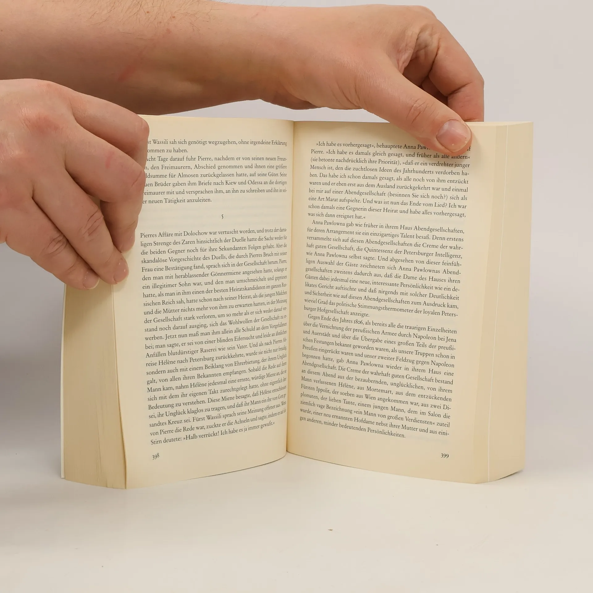 Die Schicksale der russischen Adelsfamilien Rostow und Bolkonski zu Beginn des 19. Jahrhunderts, des gutmütigen, steinreichen Pierre Besuchow und der intriganten Kuragins, Familienfeiern, Empfänge, Abendgesellschaften, Duelle, Niederkunfts- und Sterbeszenen, Jagden, Reisen, Bälle in Petersburg und Moskau, Theatervorstellungen, weihnachtliche Schlittenfahrten – an all dem läßt Tolstoi seinen Leser Anteil nehmen. Das Leben jedes einzelnen ist eng verwoben mit einem umfassenden, beeindruckenden Geschichtsbild Europas während der napoleonischen Kriege, in dem der Autor die bedeutensten Persönlichkeiten jener Zeit porträtiert.