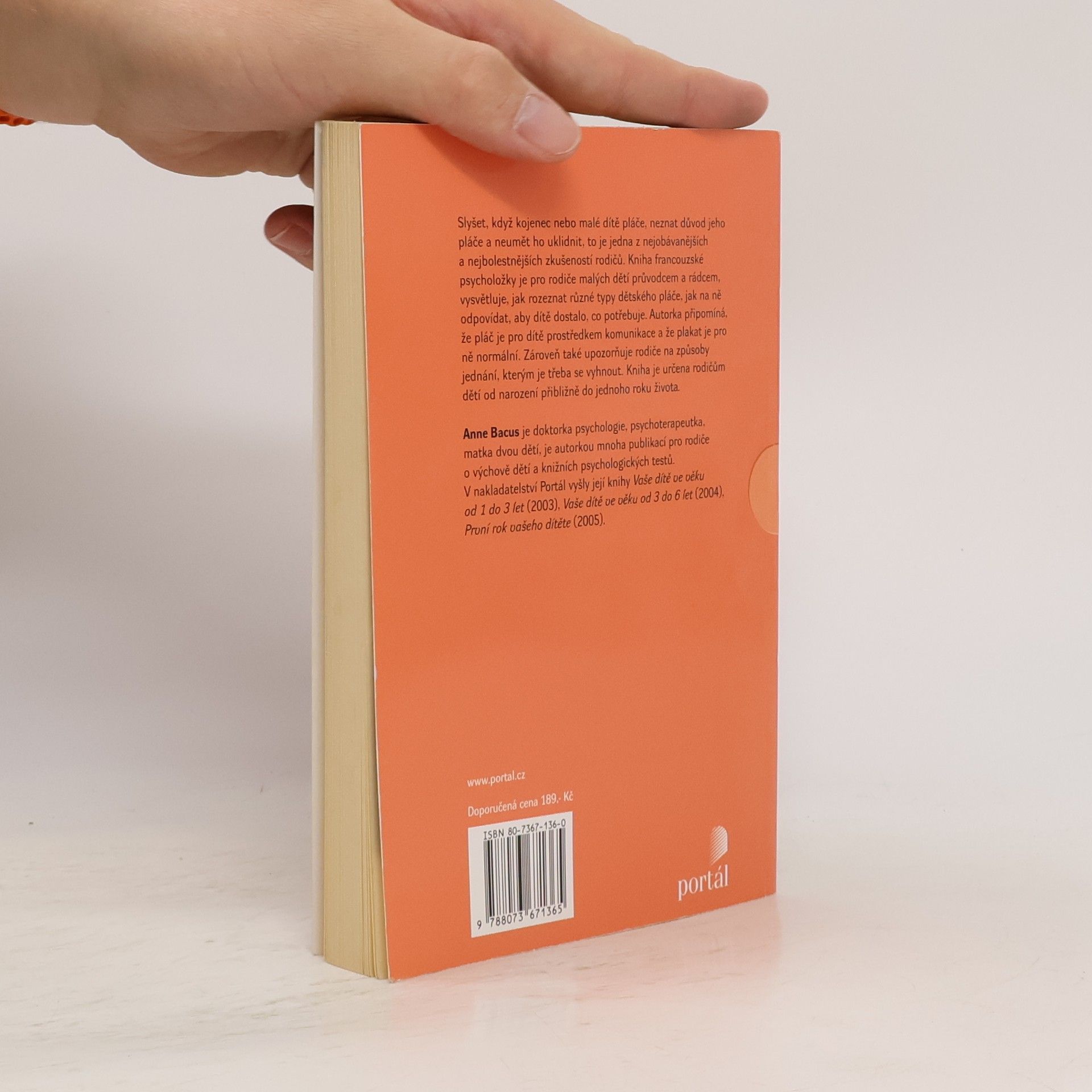 Jak zjistit, proč dítě pláče, a jak ho uklidnit Slyšet, když kojenec nebo malé dítě pláče, neznat důvod jeho pláče a neumět ho uklidnit, to je jedna z nejobávanějších a nejbolestnějších zkušeností rodičů. Kniha francouzské psycholožky je pro rodiče malých dětí průvodcem a rádcem, vysvětluje, jak rozeznat různé typy dětského pláče, jak na ně odpovídat, aby dítě dostalo, co potřebuje. Připomíná, že pláč je pro dítě prostředkem komunikace a že plakat je pro ně normální. Zároveň také upozorňuje na způsoby jednání rodičů, kterým je třeba se vyhnout. Kniha je určena pro rodiče dětí od narození přibližně do jednoho roku života.
