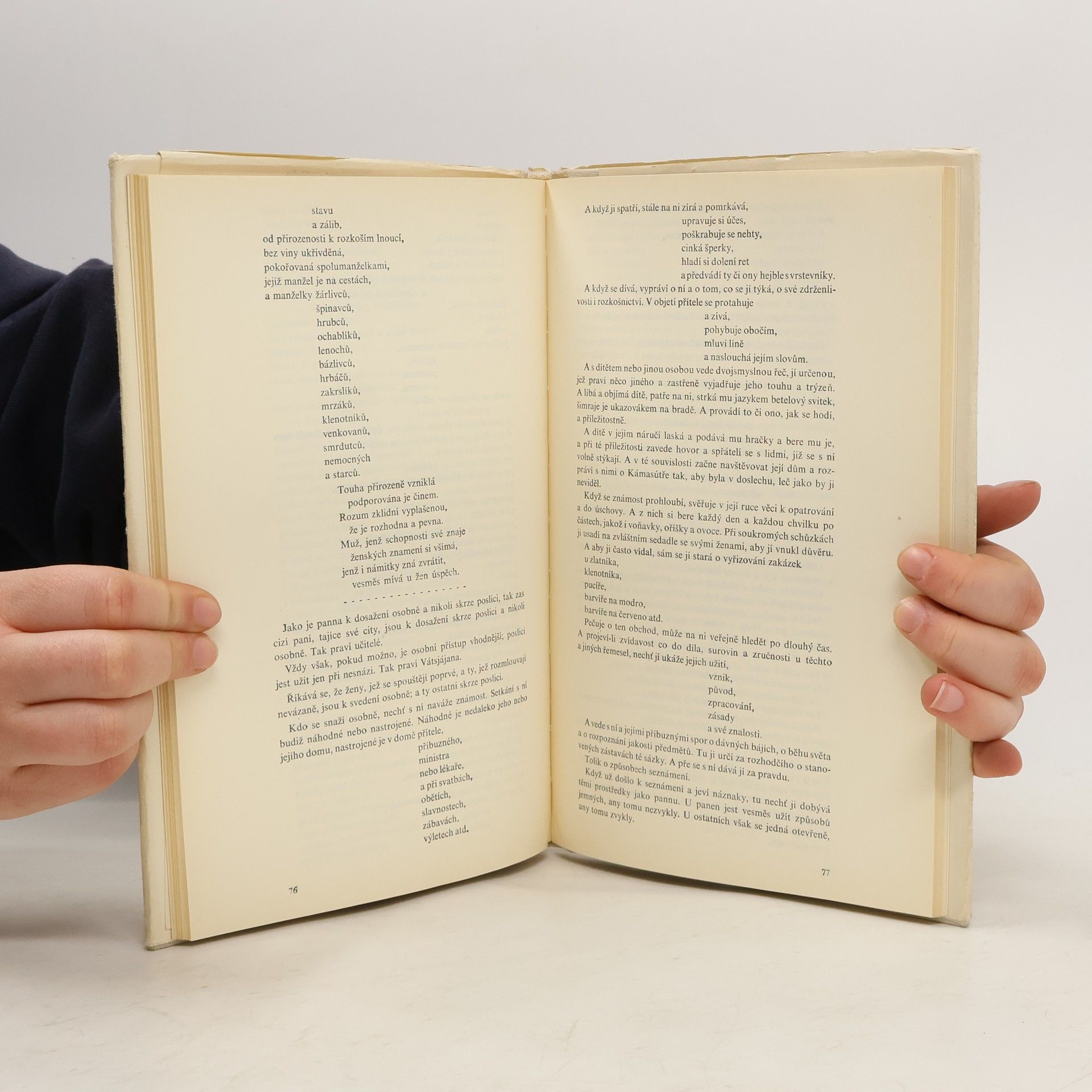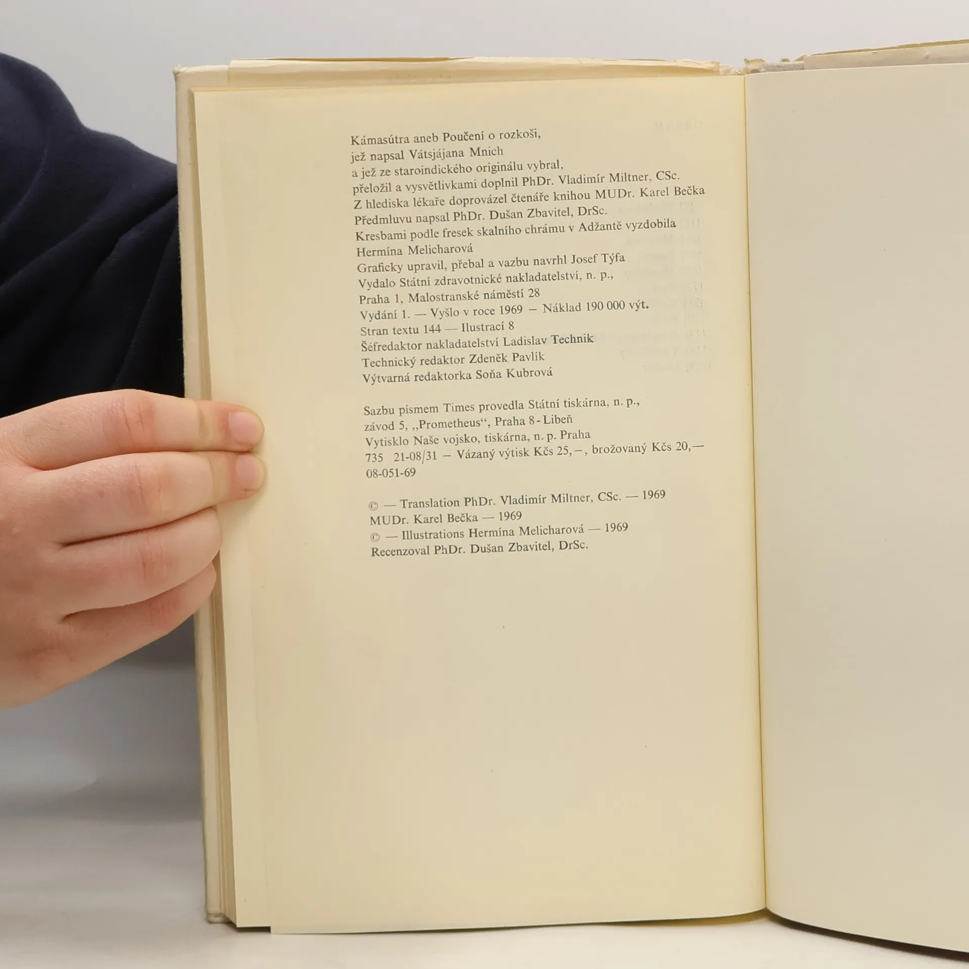 Toto je první kniha Kámasútry přeložená přímo ze staroindického originálu, která vyšla poprvé v Československu v roce 1969, bohužel některé části byly vypuštěny díky komunistickým cenzorům. Knihu přeložil a vysvětlivkami doplnil PhDr. Vladimír Miltner, CSc. Z hlediska lékaře doprovázel čtenáře knihou MUDr. Karel Bečka. Kresbami podle fresek vyzdobila Hermína Melicharová. Vátsjájanova Kámasútra, která vznikla někdy ve. 4.-5: století našeho letopočtu, je nejstarším dochovaným spisem, jenž se vědecky zabývá rozkoší, jedním z trojího smyslu života. Trochu zjednodušeně řečeno - je to podrobná učebnice lásky, v níž autor, odvolávaje se často na starší své předchůdce v tomto vědním oboru, podává ucelené poučení o milostném hemžení ve staré Indii.