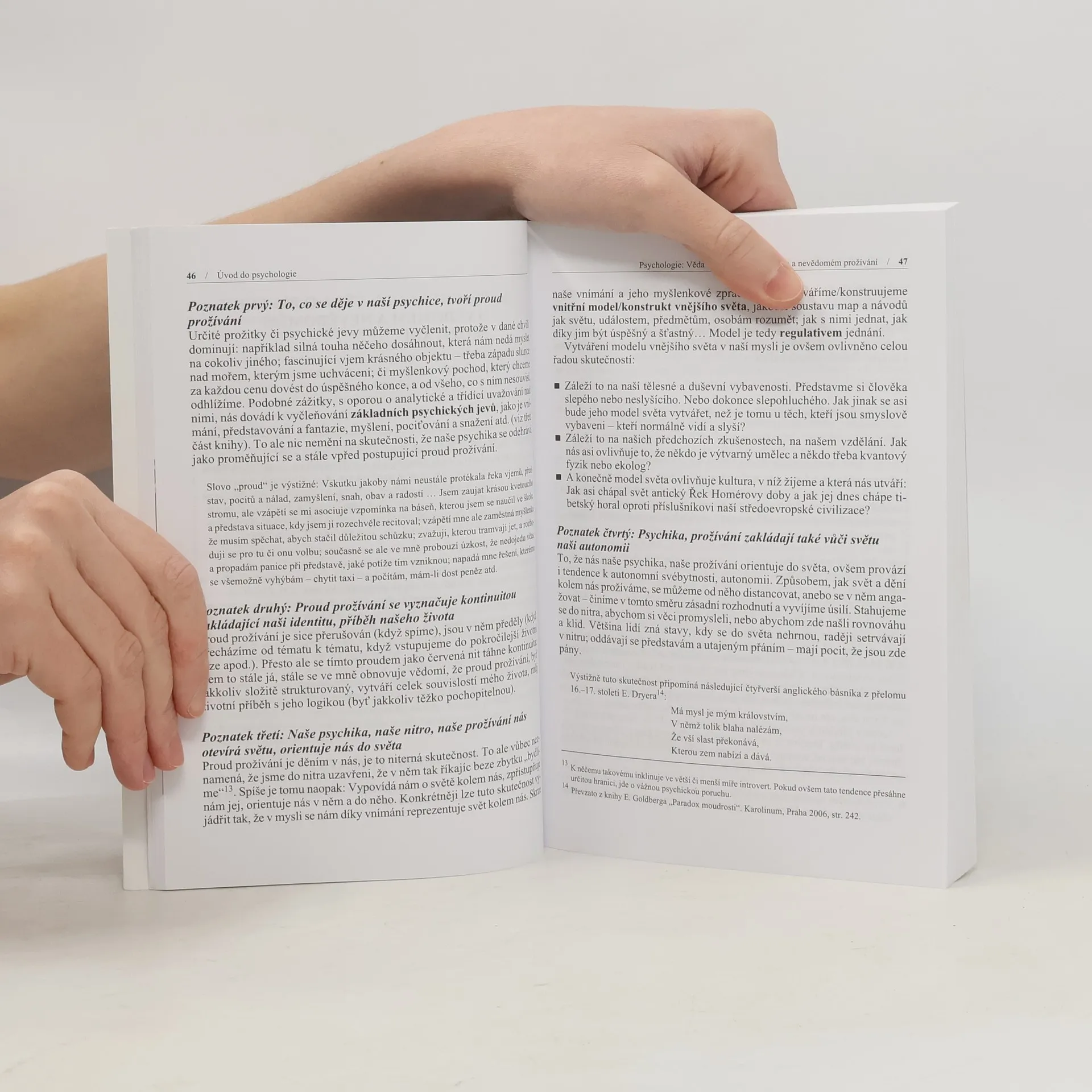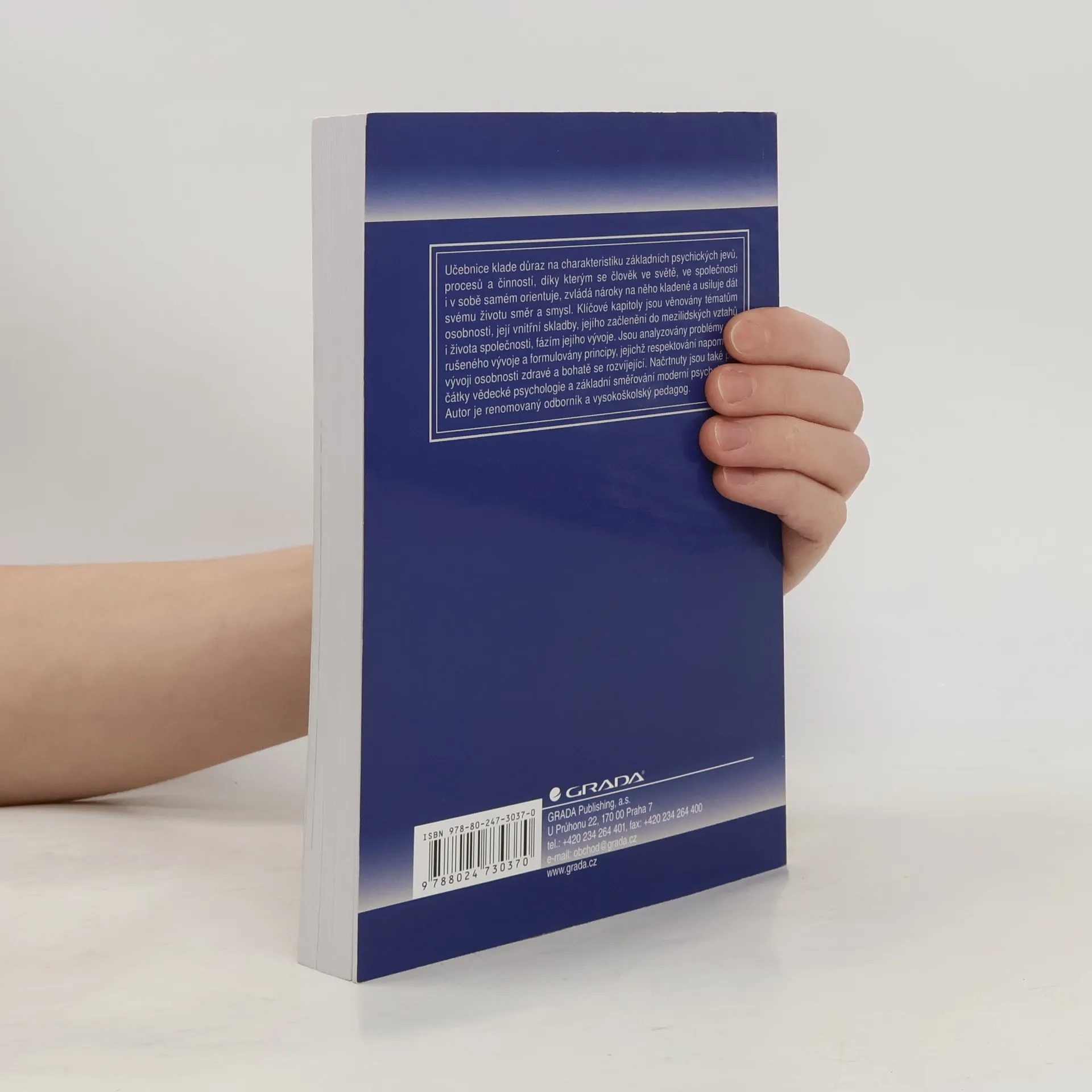 Učebnice klade důraz na charakteristiku základních psychických jevů, procesů a činností, díky kterým se člověk ve světě, ve společnosti i v sobě samém orientuje, zvládá nároky na něho kladené a usiluje dát svému životu směr a smysl. Klíčové kapitoly jsou věnovány tématům osobnosti, její vnitřní skladby, jejího začlenění do mezilidských vztahů i života společnosti, fázím jejího vývoje. Jsou analyzovány problémy narušeného vývoje a formulovány principy, jejichž respektování napomáhá vývoji osobnosti zdravé a bohatě se rozvíjející. Načrtnuty jsou také počátky vědecké psychologie a základní směřování moderní psychologie. Autor je renomovaný odborník a vysokoškolský pedagog.