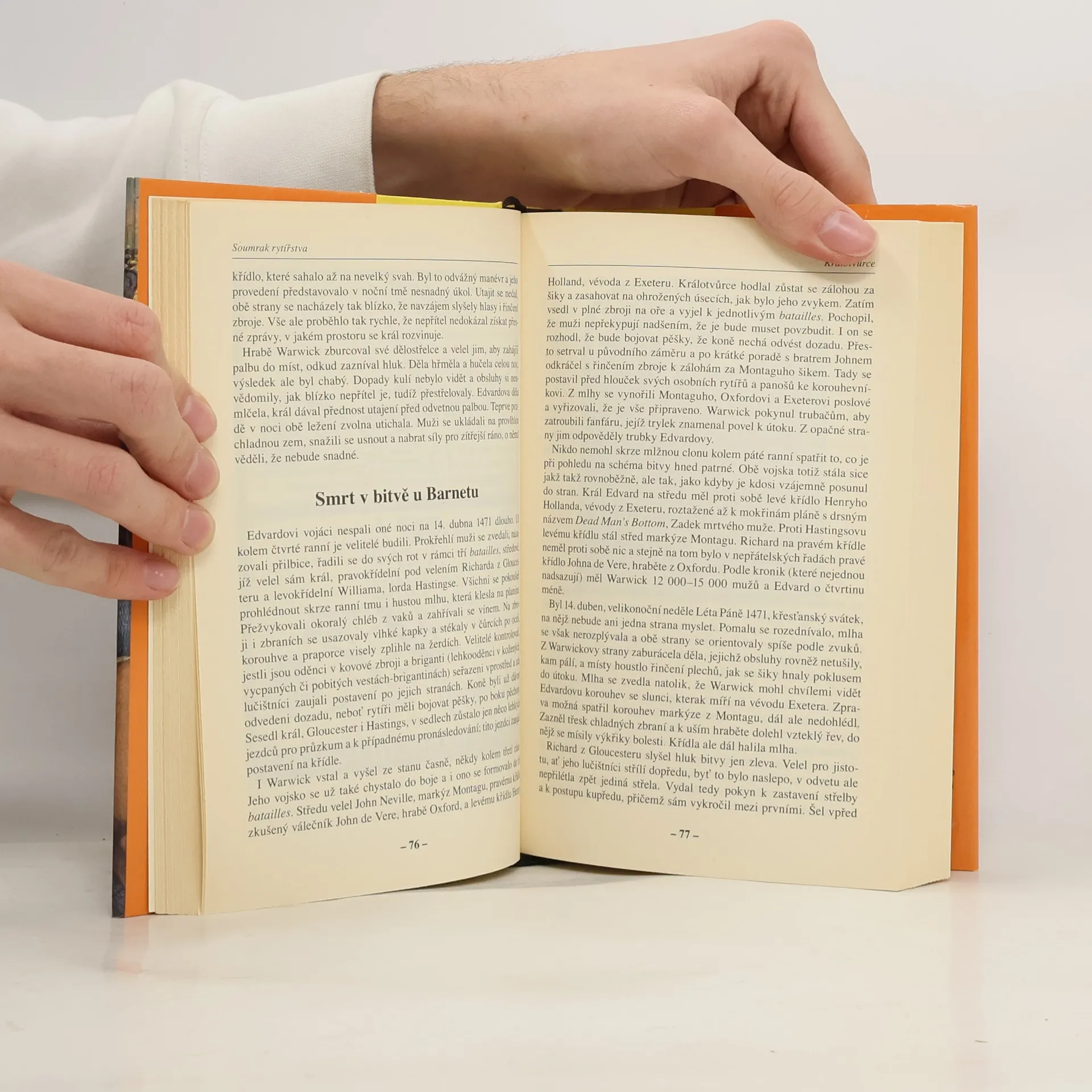 Soumrak rytířstva, čtvrtý a závěrečný svazek projektu Rytířské bitvy a osudy, vypráví o posledních rytířských střetech a osobnostech „podzimu středověku“, o časech, kdy na bojištích získávaly hlavní slovo neurozená pěchota a střelné zbraně. Válkou růží projdeme přes bitvu u Towtonu, staneme se svědky vzestupu i pádu „Králotvůrce“ Warwicka a budeme uvažovat, kde i jak došlo k poslednímu boji krále Richarda III. Skrze tři rychle za sebou jdoucí bitvy, Grandson, Murten a Nancy, spatříme trpký konec rytířské slávy burgundského vévody Karla Smělého, budeme sledovat boje hrdých Maurů i pyšných španělských rytířů o Granadu. Skrze bitvu u Fornova a životní osudy Pierra Bayrda, jemuž dali už současníci přídomek Rytíř bez bázně a hany, se přeneseme do posledních rytířských střetů na italských bojištích, za nimiž udělala tečku bitva u Pávie, kterou ani jedna strana nechtěla... (Knižní web)