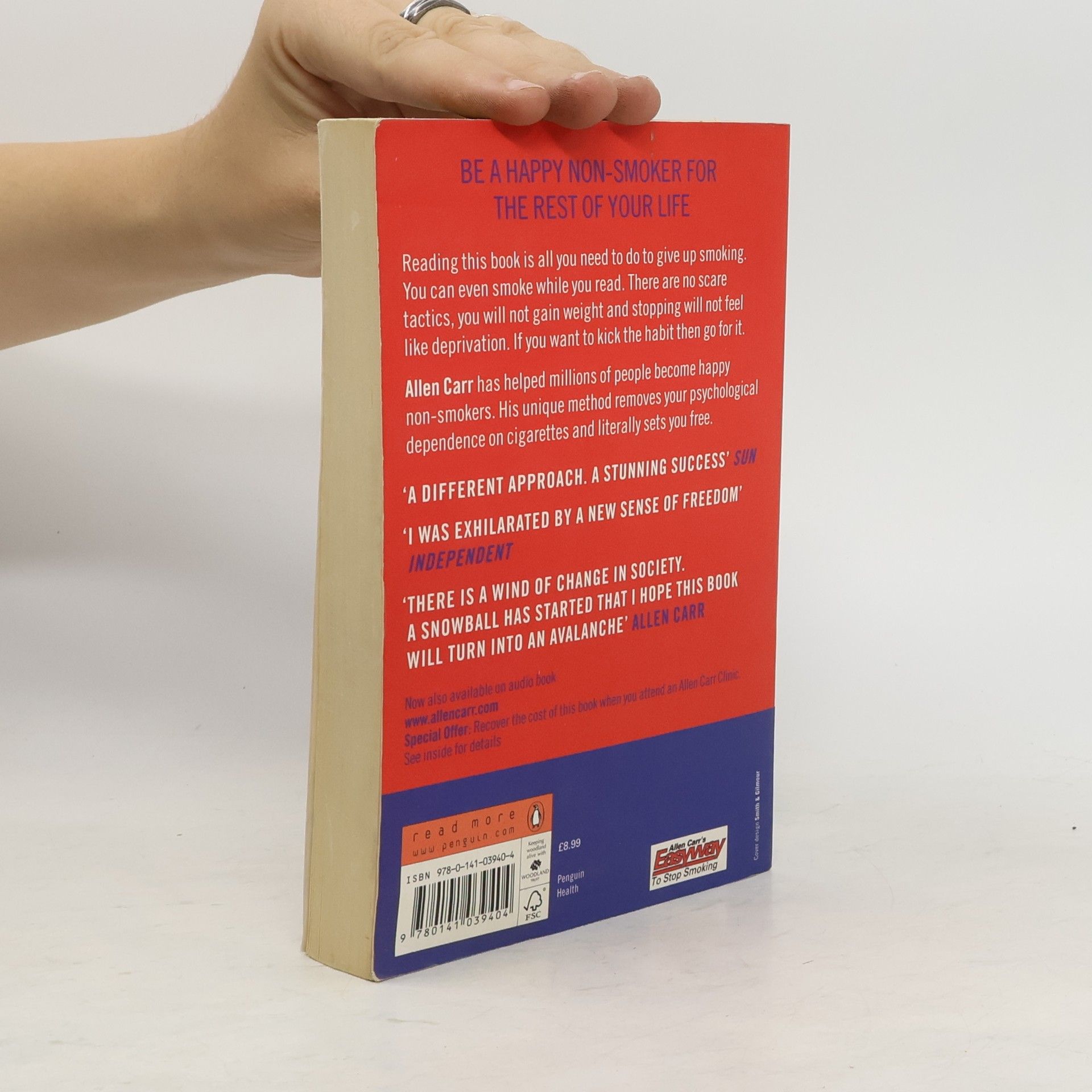 The revolutionary international bestseller that will stop you smoking - for good. 'If you follow my instructions you will be a happy non-smoker for the rest of your life.' That's a strong claim from Allen Carr, but as the world's leading and most successful quit smoking expert, Allen was right to boast! Reading this book is all you need to give up smoking. You can even smoke while you read. There are no scare tactics, you will not gain weight and stopping will not feel like deprivation. If you want to kick the habit then go for it. Allen Carr has helped millions of people become happy non-smokers. His unique method removes your psychological dependence on cigarettes and literally sets you free. Accept no substitute. Five million people can't be wrong.