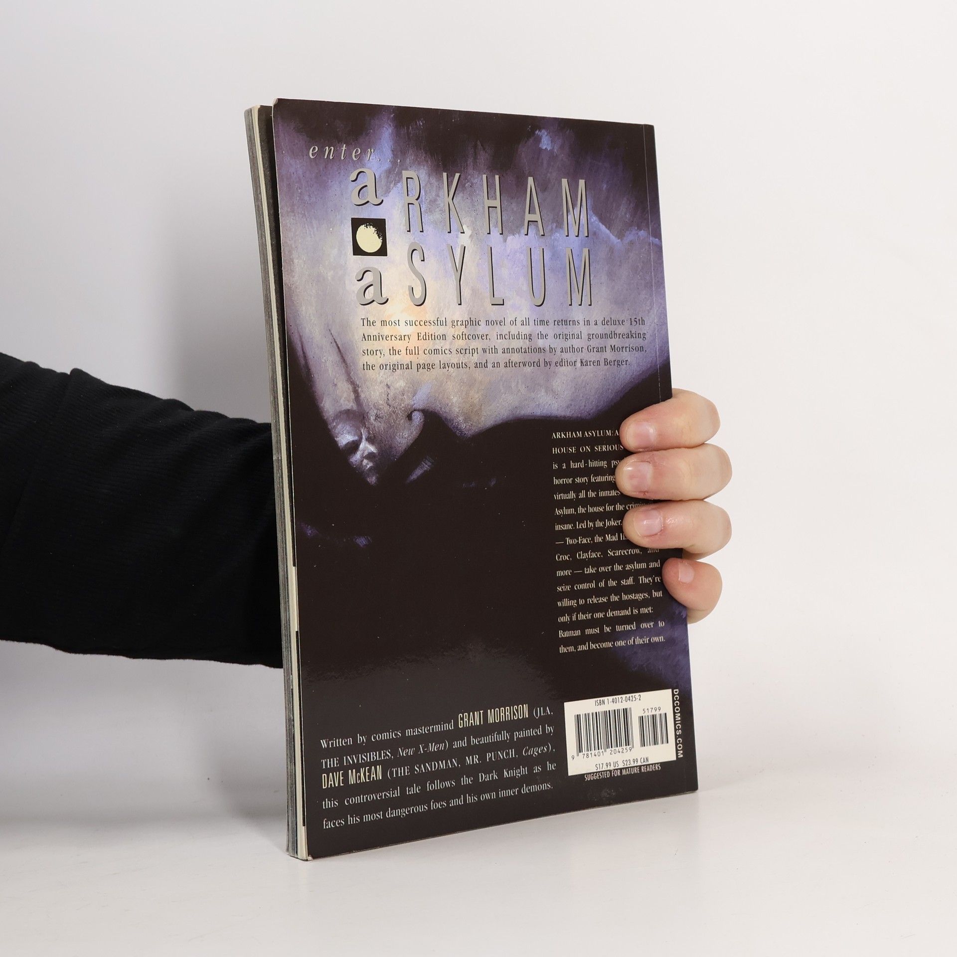 In this groundbreaking, painted graphic novel, the inmates of Arkham Asylum have taken over Gotham's detention center for the criminally insane on April Fools' Day, demanding Batman in exchange for their hostages. Accepting their demented challenge, Batman is forced to live and endure the personal hells of the Joker, Scarecrow, Poison Ivy, Two-Face, and many other sworn enemies in order to save the innocents and retake the prison. During his run through this absurd gauntlet, the Dark Knight's own sanity is placed in jeopardy. This special anniversary edition trade paperback also reproduces the original script with annotations by Morrison and editor Karen Berger.