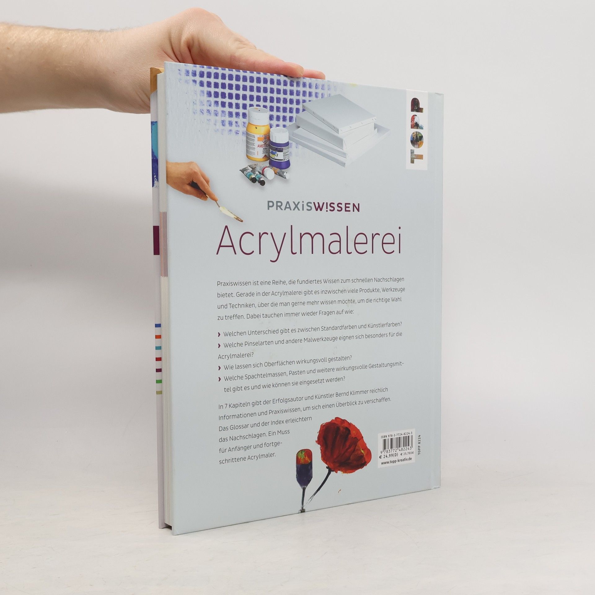 DAS Nachschlagewerk zum Thema Acrylmalerei: Neben einem geschichtlichen Abriss, der Informationen über die Wurzeln der Acrylmalerei gibt, wird alles Wissenswerte rund um das Thema in den Kapiteln Material, Werkzeug, Grundtechniken, Spezialtechniken, Tipps und Tricks sowie einer kleinen Galerie mit Motiven zusammengetragen. Fundiertes Wissen aus der langjährigen Erfahrung des Künstlers und Erfolgautors Bernd Klimmer in Sinneinheiten gegliedert: Welchen Unterschied gibt es zwischen Studien- und Künstlerfarben? Welche Eigenschaften haben Borsten- oder Synthetikpinsel? Was ist ein Retarder? Welche Gele gibt es und wie können Sie eingesetzt werden? Checklisten und Tabellen liefern einen raschen Überblick.