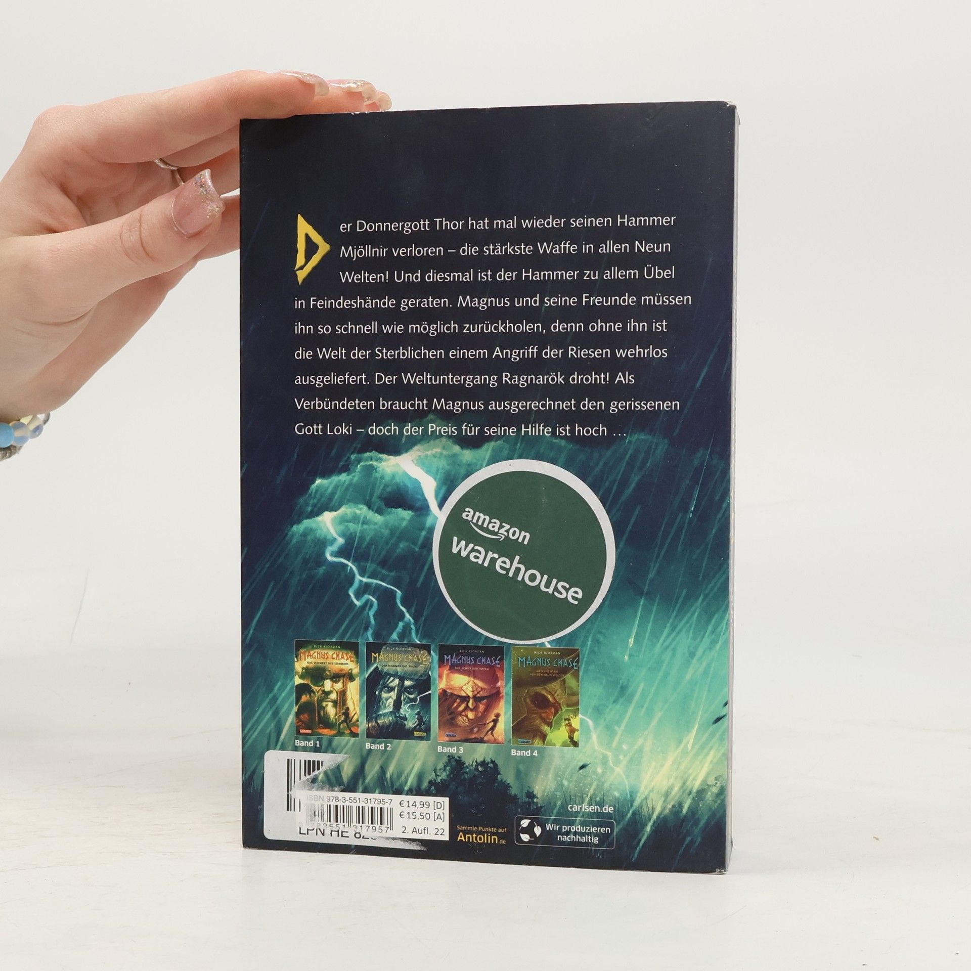 Der Donnergott Thor hat seinen Hammer verloren, was äußerst besorgniserregend ist, da es sich um die mächtigste Waffe der Neun Welten handelt. Zu allem Überfluss ist der Hammer in die Hände des Feindes geraten. Magnus Chase und seine Freunde müssen ihn dringend zurückholen, denn ohne ihn ist die Welt der Sterblichen wehrlos gegen einen Angriff von Riesen. Das drohende Ragnarök steht bevor! Um ihr Ziel zu erreichen, benötigen sie einen Verbündeten – und das ist ausgerechnet Loki, der Gott der Lügen und Streiche. Leider ist Loki die einzige Person, die einen Deal für die Rückgabe des Hammers aushandeln kann, doch der Preis für seine Unterstützung ist hoch. Der 16-jährige Magnus Chase lebt seit dem mysteriösen Tod seiner Mutter auf der Straße und verdient seinen Lebensunterhalt mit Diebstählen, bis er von seinem besonderen Erbe erfährt: Er ist der Sohn des nordischen Gottes Frey und soll die Welt vor dem Untergang retten. In dieser Fantasy-Trilogie überführt der Autor alte Sagen und Legenden in moderne Geschichten und begeistert Leser*innen weltweit für die nordische Mythologie. ***Feuerriesen, Walküren und nordische Götter - packende Fantasy für Leser*innen ab 12 Jahren und für alle Fans der nordischen Mythologie.***