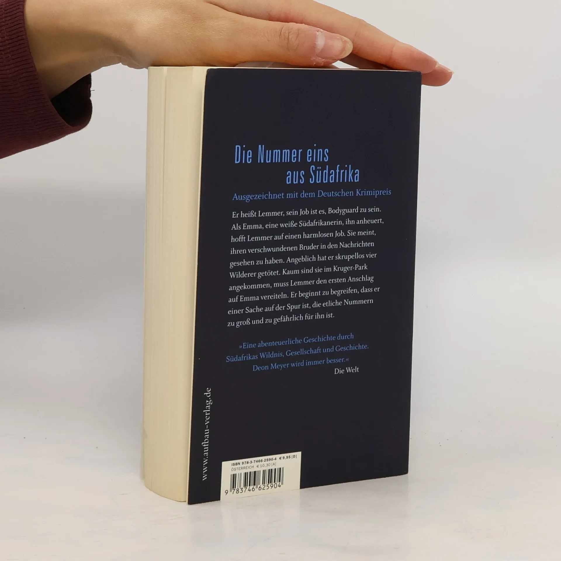 Er heißt Lemmer, sein Job ist es, Bodyguard zu sein. Als Emma, eine weiße Südafrikanerin, ihn anheuert, hofft Lemmer auf einen harmlosen Job. Sie meint, ihren Jahre verschwundenen Bruder in den Nachrichten gesehen zu haben. Angeblich hat er skrupellos vier Wilderer getötet. Kaum sind sie im Kruger-Park angekommen, muss Lemmer den ersten Anschlag auf Emma vereiteln. Er beginnt zu begreifen, dass er einer Sache auf der Spur ist, die etliche Nummern zu groß und zu gefährlich für ihn ist. »Eine abenteuerliche Geschichte durch Südafrikas Wildnis, Gesellschaft und Geschichte. Deon Meyer wird immer besser.« Die Welt Ausgezeichnet mit dem Deutschen Krimipreis.