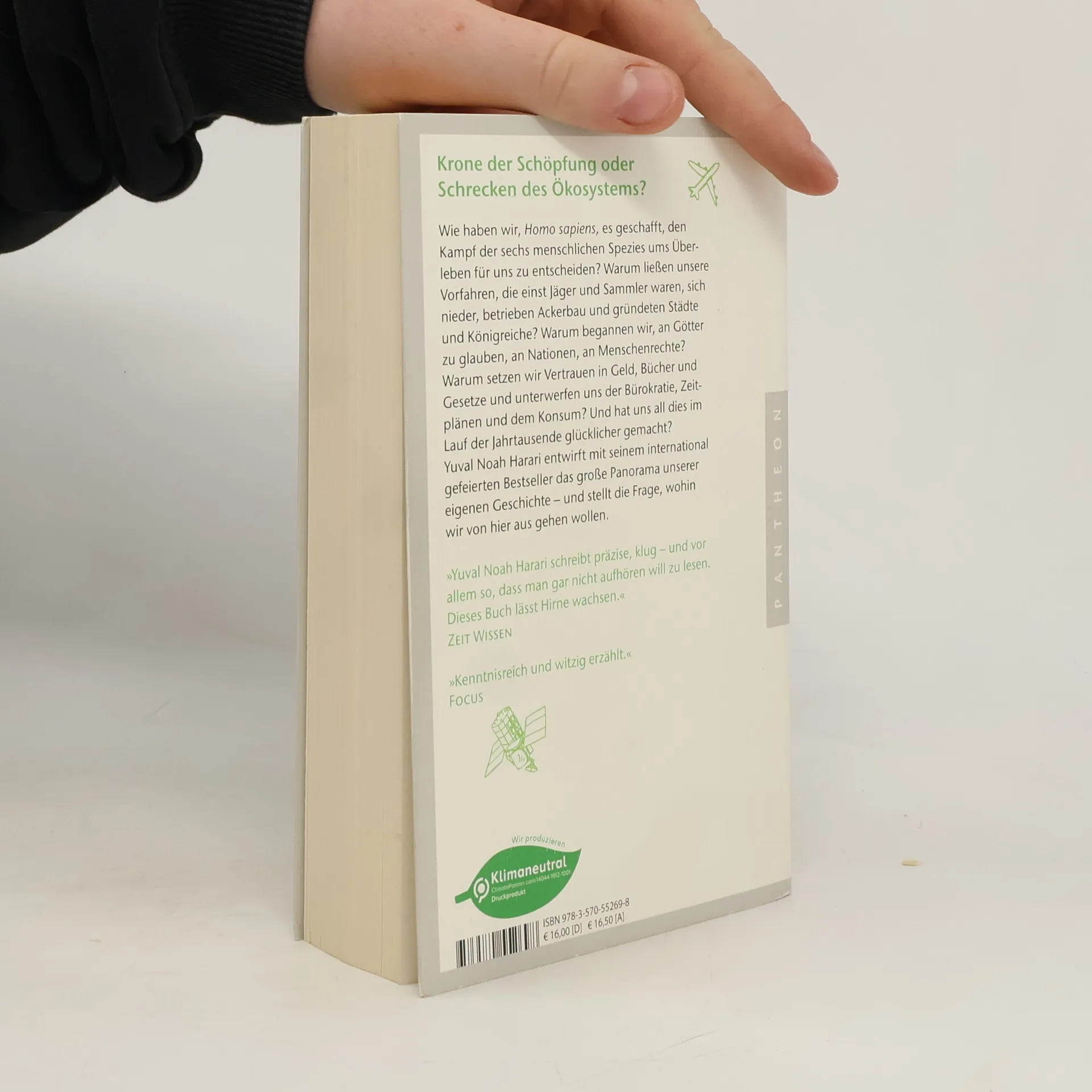 Der Mensch: Krone der Schöpfung oder Schrecken des Ökosystems? Wie gelang es Homo Sapiens, den Überlebenskampf gegen andere menschliche Spezies zu gewinnen? Warum wandten sich unsere Vorfahren von Jägern und Sammlern zu Ackerbau, Städten und Königreichen? Was führte zu unserem Glauben an Götter, Nationen und Menschenrechte? Warum vertrauen wir auf Geld, Bücher und Gesetze und unterwerfen uns Bürokratie und Konsum? Hat uns dieser Wandel glücklicher gemacht? Vor 100.000 Jahren war Homo sapiens ein unbedeutendes Tier in Afrika, das mit fünf anderen menschlichen Spezies lebte. Ihr Einfluss auf das Ökosystem war vergleichbar mit dem von Gorillas oder Quallen. Vor 70.000 Jahren jedoch vollzog sich ein rascher Wandel, der Homo sapiens zur dominierenden Spezies und zum Schrecken des Ökosystems machte, vor allem aufgrund der besonderen Beschaffenheit seines Gehirns. Diese Vorherrschaft hat sich bis heute verstärkt: Der Mensch hat die Fähigkeit zu schöpferischem und destruktivem Handeln wie kein anderes Lebewesen. Jetzt steht die Menschheit an einem entscheidenden Punkt, an dem sie ihren zukünftigen Weg wählen muss. Internationaler Bestseller – in fast 40 Sprachen übersetzt. Harari schreibt präzise und fesselnd, was das Lesen zu einem Erlebnis macht. Sein Meisterwerk verbindet große historische Ereignisse mit der Kraft von Ideen.