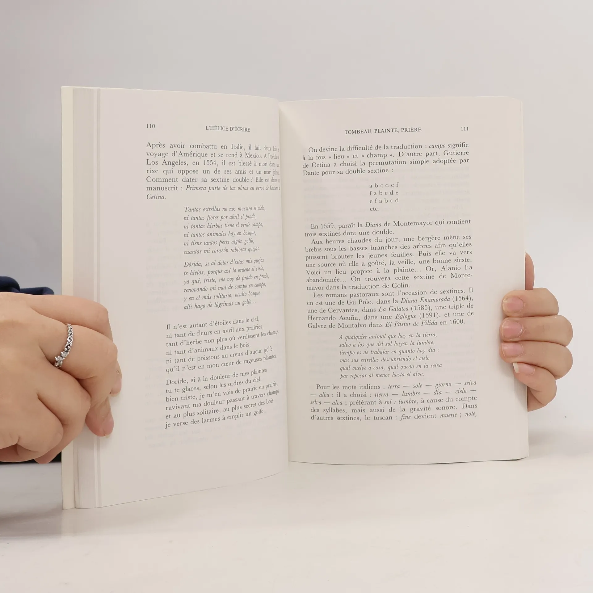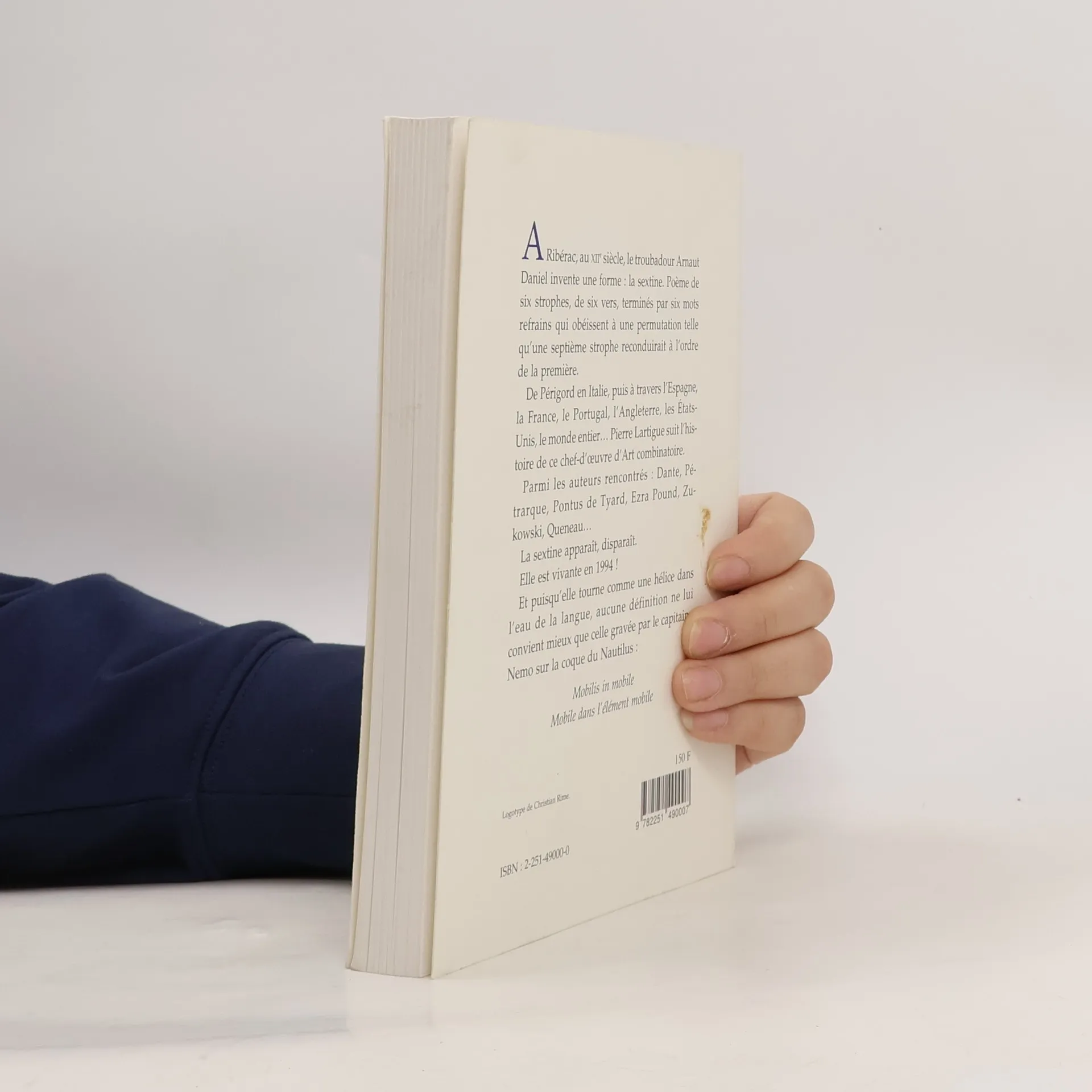 A Riberac, au XIIe siecle, le troubadour Arnaut Daniel invente une la sextine. Poeme de six strophes, de six vers, termines par six mots refrains qui obeissent a une permutation telle qu'une septieme strophe reconduirait a l'ordre de la premiere. De Perigord en Italie, puis a travers l'Espagne, la France, le Portugal, l'Angleterre, les Etats-Unis, le monde entier... Pierre Lartigue suit l'histoire de ce chef-d'oeuvre d'Art combinatoire . Parmi les auteurs Dante, Petrarque, Pontus de Tyard, Ezra Pound, Zukowski, Queneau... La sextine apparait, disparait. Elle est vivante! Et puisqu'elle tourne comme une helice dans l'eau de la langue, aucune definition ne lui convient mieux que celle gravee par le capitaine Nemo sur la coque du Nautilus Mobilis in mobili
