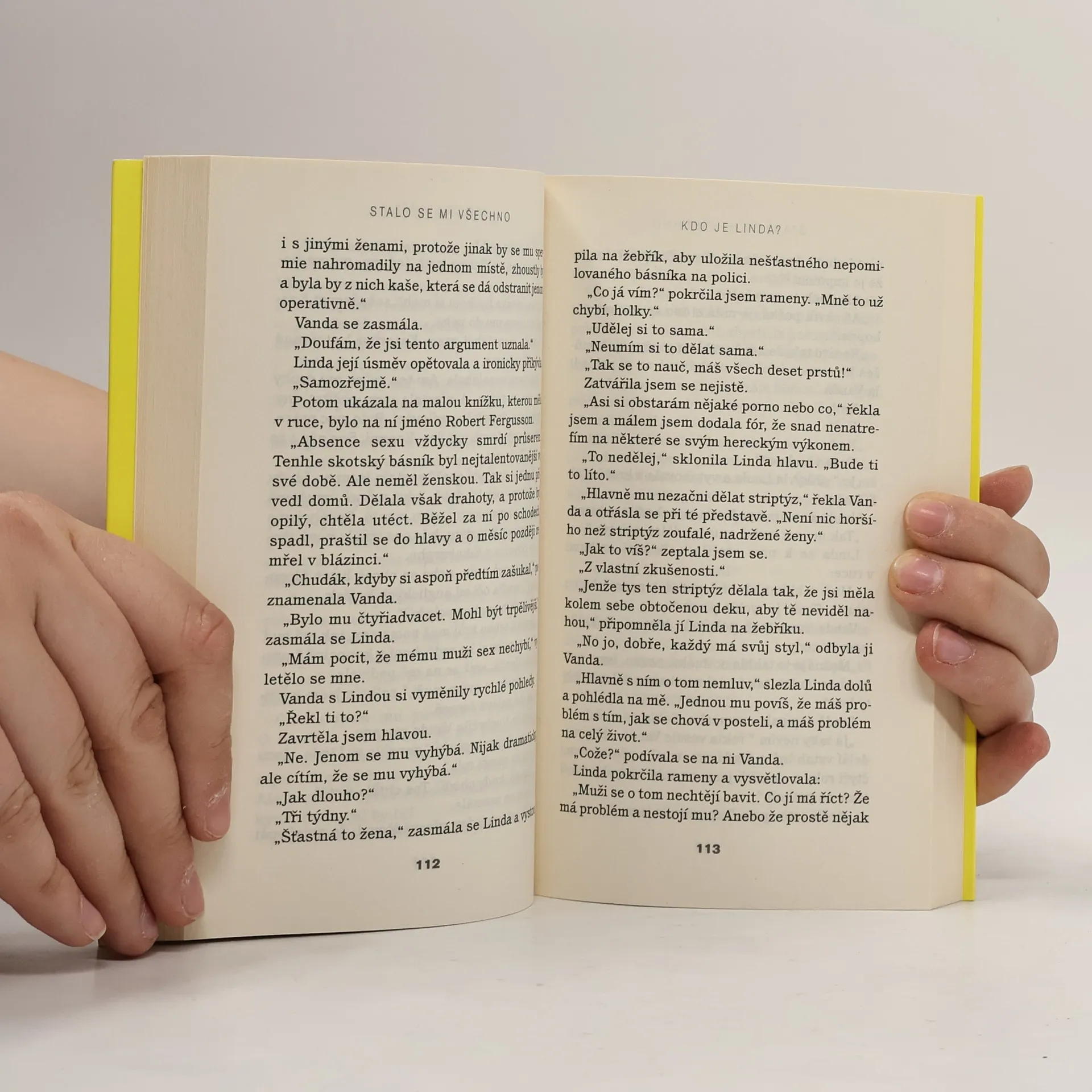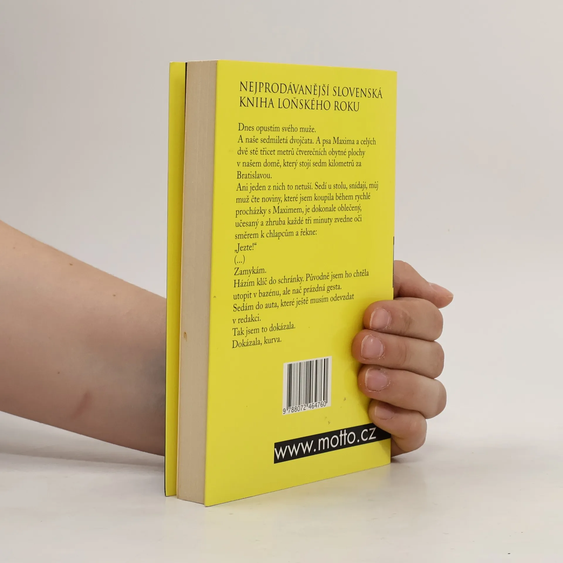 Nejprodávanější slovenská kniha loňského roku Dnes opustím svého muže. A naše sedmiletá dvojčata. A psa Maxima a celých dvě stě třicet metrů čtverečních obytné plochy v našem domě, který stojí sedm kilometrů za Bratislavou. Ani jeden z nich to netuší. Sedí u stolu, snídají, můj muž čte noviny, které jsem koupila během rychlé procházky s Maximem, je dokonale oblečený, učesaný a zhruba každé tři minuty zvedne oči směrem k chlapcům a řekne: „Jezte!“ Zamykám. Házím klíč do schránky. Původně jsem ho chtěla utopit v bazénu, ale nač prázdná gesta. Sedám do auta, které ještě musím odevzdat v redakci. Tak jsem to dokázala. Dokázala, kurva.