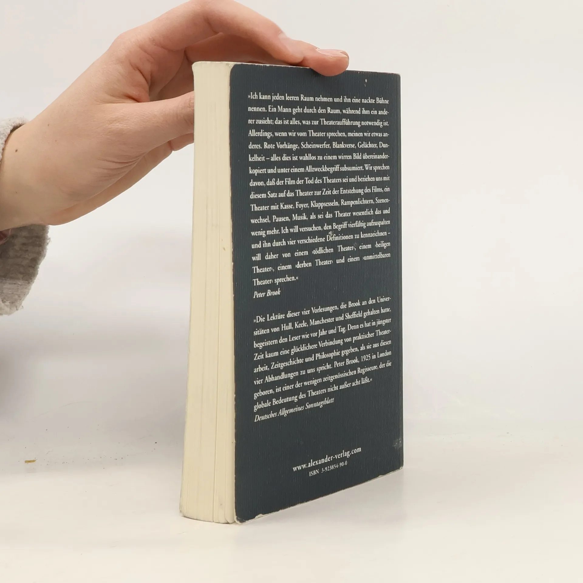 »Die einflussreichste Theaterschrift des 20. Jahrhunderts.« Süddeutsche Zeitung Der leere Raum ist der Klassiker unter den Büchern zum Theater. Es basiert auf vier Vorlesungen, die Peter Brook unter dem Titel The Empty Space: The Theater Today in den sechziger Jahren an den Universitäten von Hull, Keele, Manchester und Sheffield hielt. 1968 erschienen diese Gedanken zum Gegenwartstheater in Buchform. Nachdem der Band für längere Zeit vergriffen war, machte ihn der Alexander Verlag 1983 wieder greifbar für das deutsche Publikum. Brook unterteilt das Theater in vier verschiedene Formen: Das konventionelle Theater definiert er als "tödlich", das an Ritualen festhaltende Theater als das "heilige", das leicht verständliche, volksnahe Theater als "derbes" und das von ihm favorisierte als "unmittelbares Theater".