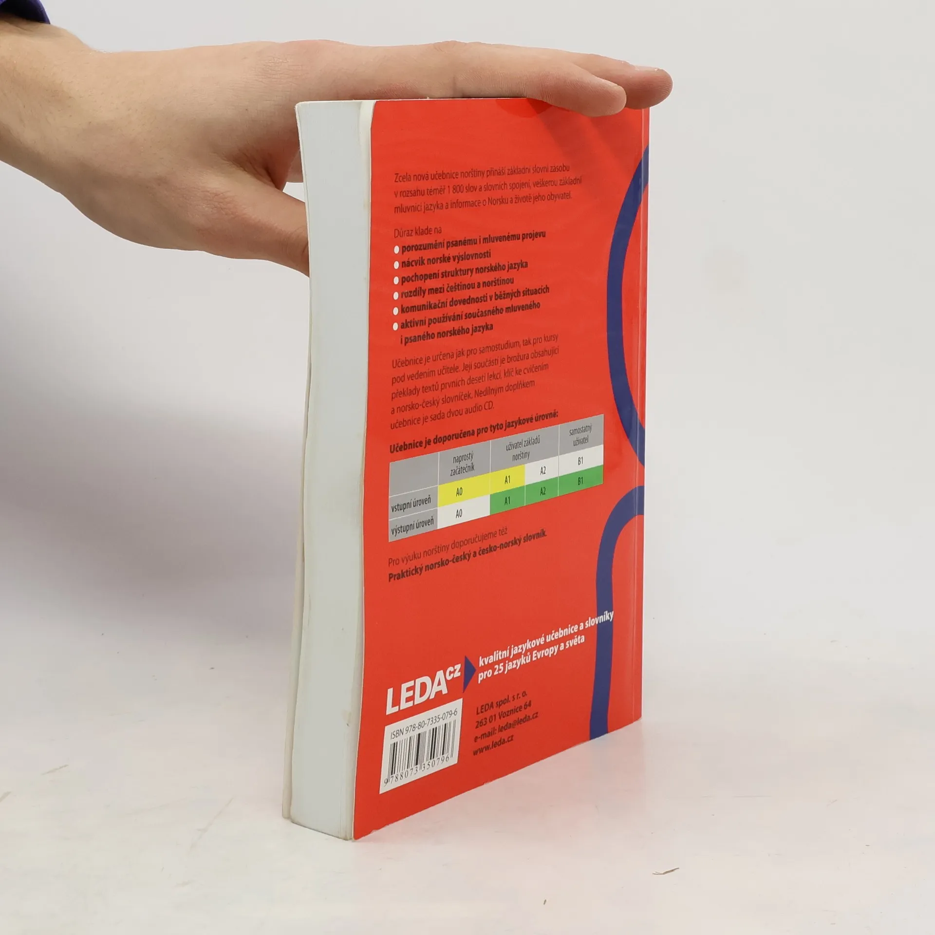 Základní učebnice norštiny je určena všem, kteří se chtějí naučit norsky (bokmal) především samostudiem, dobře ale poslouží i pro jazykové kurzy. V jednotlivých lekcích je zařazen úvodní článek (nebo články), dále dialogy, základní slovíčka pro danou lekci, rozšiřující slovní zásoba, oddíl frází a předložkových vazeb, informace týkající se norských reálií, oddíl s mluvnickým výkladem, cvičení na výslovnost, poslechová cvičení a velké množství cvičení na mluvnické jevy a slovní zásobu. Úvodní texty jednotlivých lekcí obsahují jak užitečné fráze nutné pro dorozumění v běžných situacích, tak zajímavé reálie týkající se Norska a života lidí v této zemi. Součástí učebnice jsou klíč ke cvičením, norsko-český slovníček v samostatné brožuře a dvě audio CD.