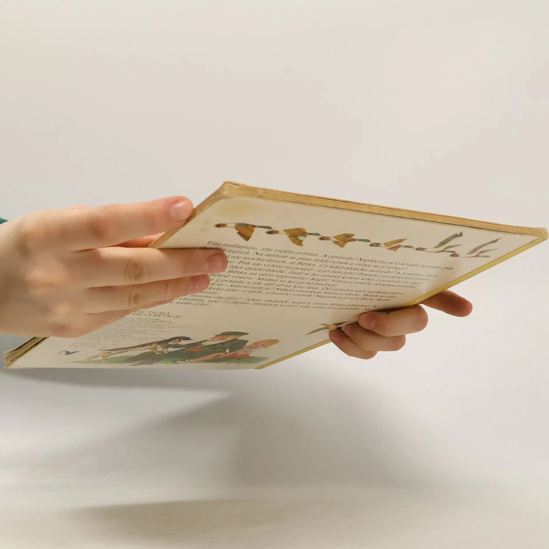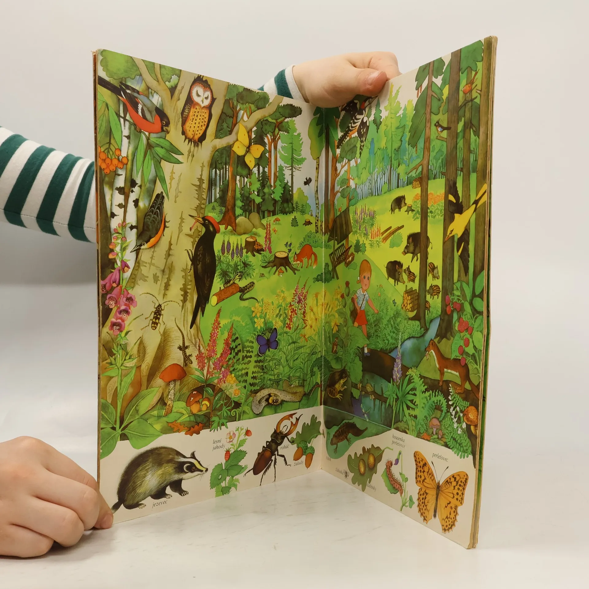 Barevné ilustrace ukazují zvířata na louce, v lese a v rybníce.