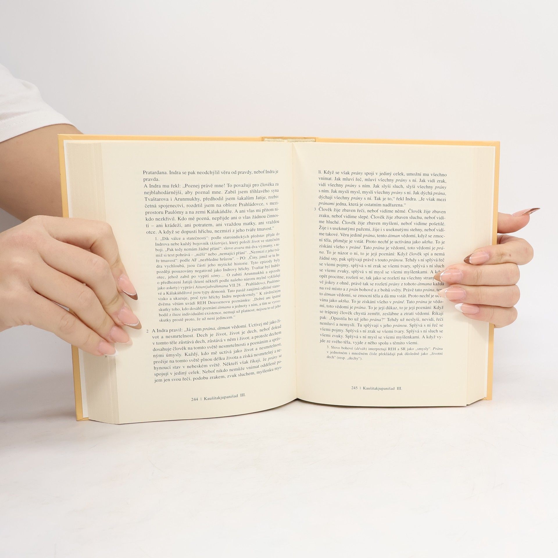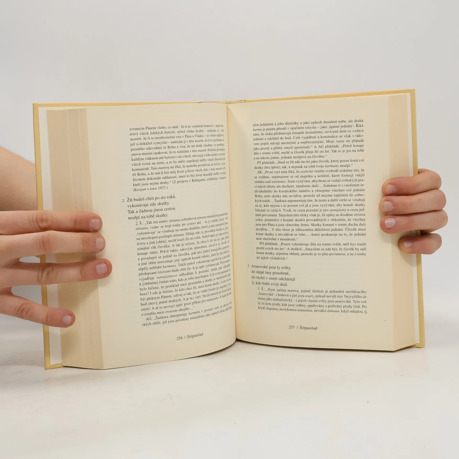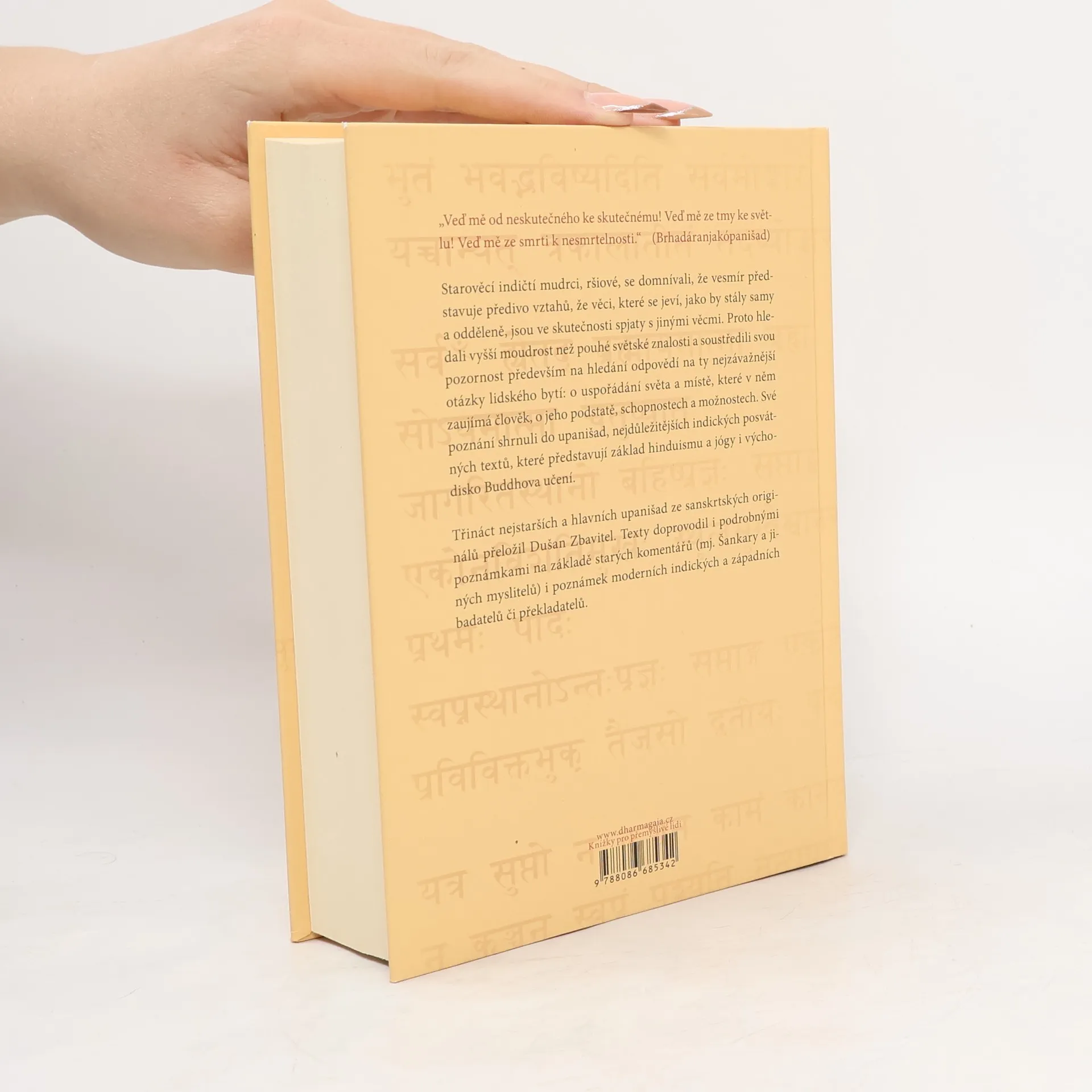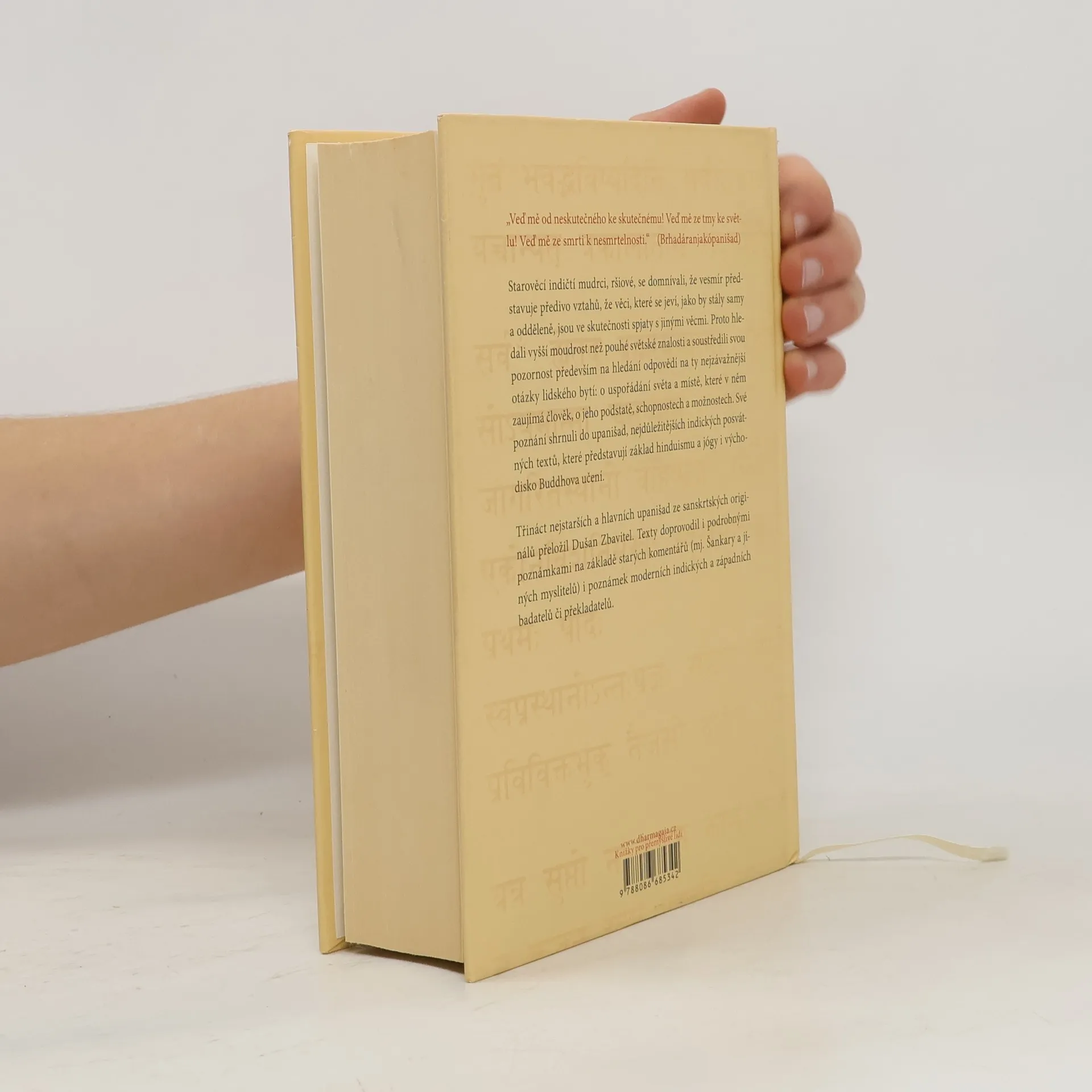 Skvost světové literatury, nejvýznamnější a filosofické posvátné texty staré Indie (8.–3. stol. př. n. l.), mají kulturní význam srovnatelný s biblí. Jsou základem hinduismu, jógy a indické filosofie, a také východiskem buddhismu. Obsahují třináct starých indických posvátných textů, mezi nimiž jsou hlavní upanišady jako Brhadáranjaka, Čhándógja a další. Překladatel Dušan Zbavitel, který za svůj překlad obdržel Státní cenu, doplnil texty podrobnými poznámkami založenými na starých komentářích a moderních badatelích. Toto období, považované za "osovou dobu lidských dějin", bylo klíčové pro formování světového myšlení. V té době žili významní myslitelé jako Buddha a Konfucius. Starověcí indičtí mudrci, ršiové, usilovali o vyšší moudrost a zkoumali spojení mezi lidským bytím a kosmickými skutečnostmi. Zatímco védské texty se soustředily na rituály, upanišady se zaměřily na lidskou osobu a její místo ve vesmíru. Závěrem upanišad je rovnice: átman, podstata "já", se rovná brahma, nejzazší realita světa. Tyto texty, bohaté na podněty k zamyšlení, ovlivnily nejen indickou filosofii, ale i buddhismus a džinismus, a v 19. století také západní myslitele. Dodnes jsou významným zdrojem pro učitele jógy na Západě.