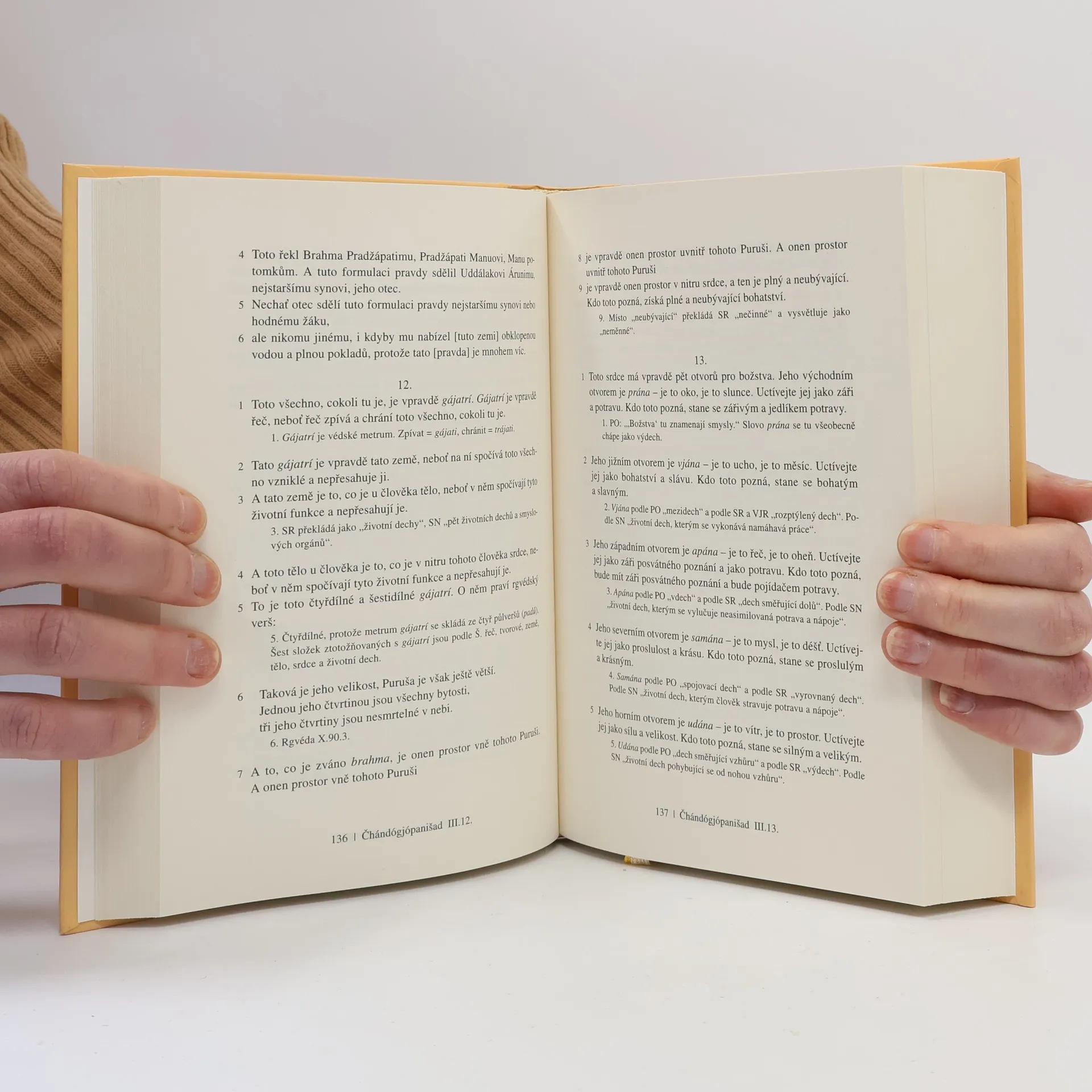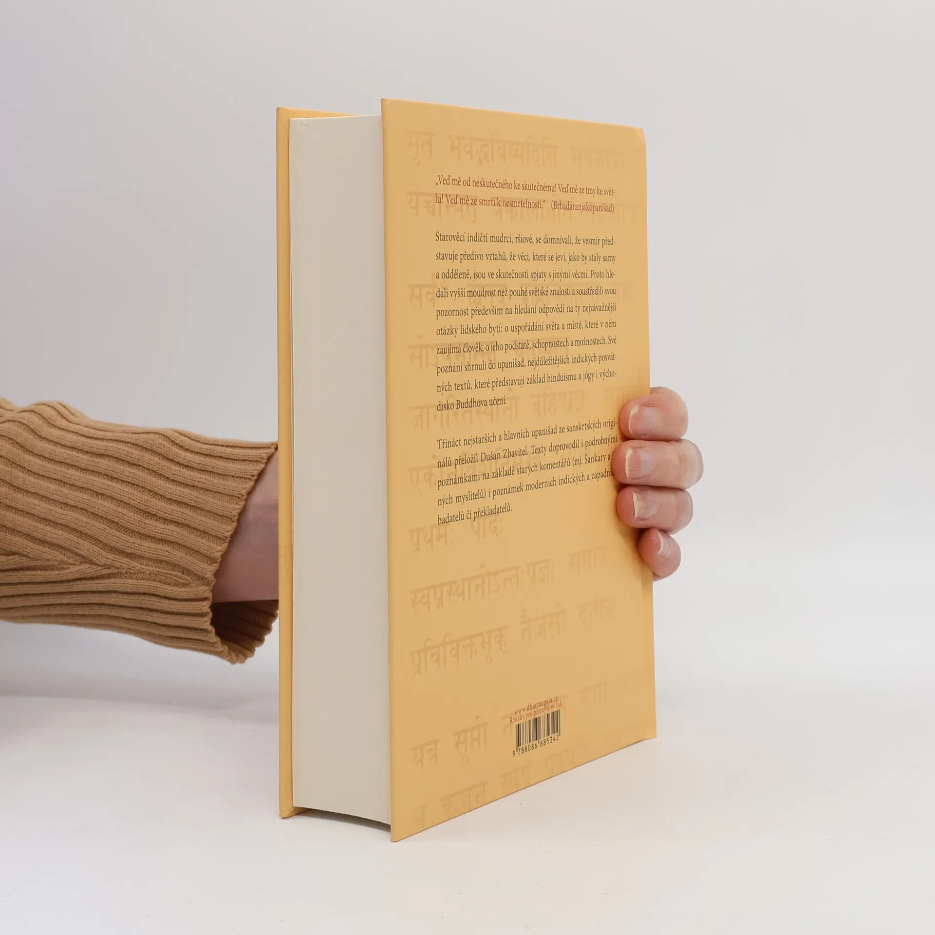 Skvost světové literatury, nejvýznamnější a filosofické posvátné texty staré Indie (8.–3. stol. př. n. l.), mají kulturní význam srovnatelný s biblí. Jsou základem hinduismu, jógy a indické filosofie, a také východiskem buddhismu. Obsahují třináct starých indických posvátných textů, mezi nimiž jsou hlavní upanišady jako Brhadáranjaka, Čhándógja a další. Překladatel Dušan Zbavitel, který za svůj překlad obdržel Státní cenu, doplnil texty podrobnými poznámkami založenými na starých komentářích a moderních badatelích. Toto období, považované za "osovou dobu lidských dějin", bylo klíčové pro formování světového myšlení. V té době žili významní myslitelé jako Buddha a Konfucius. Starověcí indičtí mudrci, ršiové, usilovali o vyšší moudrost a zkoumali spojení mezi lidským bytím a kosmickými skutečnostmi. Zatímco védské texty se soustředily na rituály, upanišady se zaměřily na lidskou osobu a její místo ve vesmíru. Závěrem upanišad je rovnice: átman, podstata "já", se rovná brahma, nejzazší realita světa. Tyto texty, bohaté na podněty k zamyšlení, ovlivnily nejen indickou filosofii, ale i buddhismus a džinismus, a v 19. století také západní myslitele. Dodnes jsou významným zdrojem pro učitele jógy na Západě.