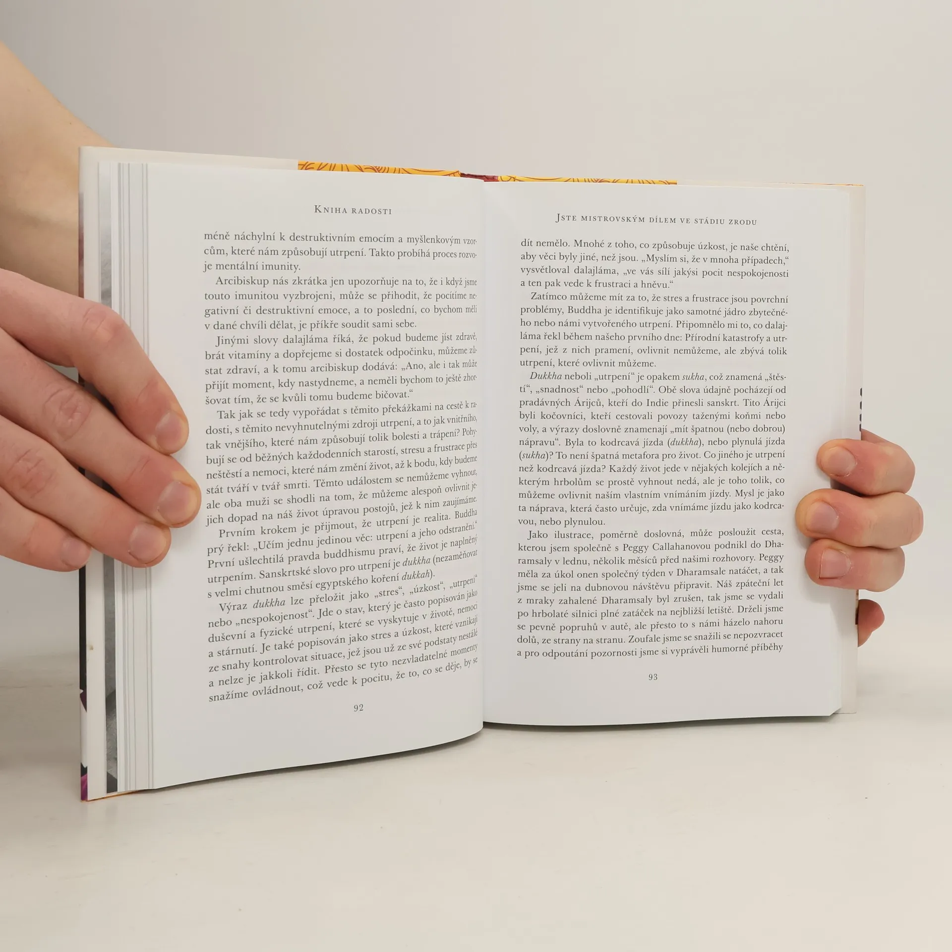 Jak být šťastný v dnešním proměnlivém světě. Pokud se vnímáte jako obyčejný člověk, neměli byste se chovat jako někdo výjimečný. Bez ohledu na status jsme si všichni rovni. Svět se rychle mění a čelíme tragédiím, katastrofám a osobním neštěstím. Můžeme však najít radost i v těžkých časech a pracovat na svém přístupu k sobě a ostatním. Kniha radosti přináší zkušenosti dvou neuvěřitelných mužů, kteří navzdory těžkým životním zkouškám zůstávají veselí, soucitní a neztrácejí víru v lidstvo. Douglas Abrams propojuje příběhy dalajlámy a arcibiskupa Desmonda Tutua, přičemž jejich odpovědi na otázky o radosti, pokory, humoru, odpuštění a vděčnosti doplňuje vědeckými poznatky. Kniha nás vede od zaměření na sebe k zaměření na společnost, ukazuje, jak se poučit z utrpení a uvědomit si, že jsme součástí velkého společenství. Nikdo se nevyhne utrpení, ale to neznamená, že nemůžeme prožívat radost. Netrapme se tím, co nemůžeme změnit. „Pokud s tím lze něco udělat, jaký je důvod ke sklíčenosti? Pokud se nic dělat nedá, k čemu je být sklíčený?“ Nechte se inspirovat moudrostí dvou „veselých kop“, které se umějí zasmát samy sobě a otevřou vám oči, rozesmějí vás i rozpláčou.