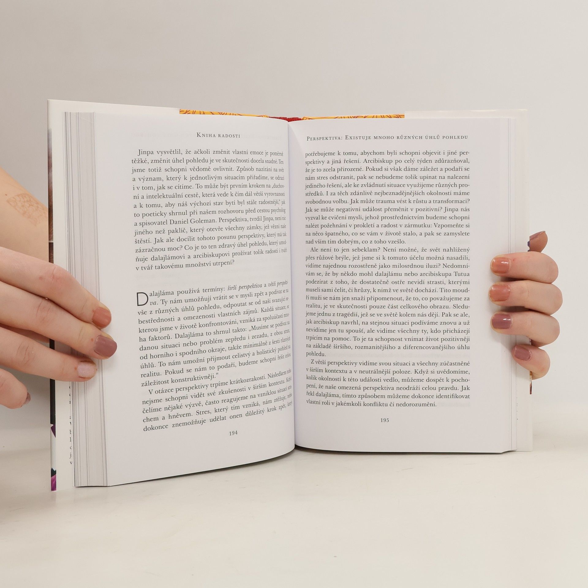 Jak být šťastný v dnešním proměnlivém světě. Pokud se vnímáte jako obyčejný člověk, neměli byste se chovat jako někdo výjimečný. Bez ohledu na status jsme si všichni rovni. Svět se rychle mění a čelíme tragédiím, katastrofám a osobním neštěstím. Můžeme však najít radost i v těžkých časech a pracovat na svém přístupu k sobě a ostatním. Kniha radosti přináší zkušenosti dvou neuvěřitelných mužů, kteří navzdory těžkým životním zkouškám zůstávají veselí, soucitní a neztrácejí víru v lidstvo. Douglas Abrams propojuje příběhy dalajlámy a arcibiskupa Desmonda Tutua, přičemž jejich odpovědi na otázky o radosti, pokory, humoru, odpuštění a vděčnosti doplňuje vědeckými poznatky. Kniha nás vede od zaměření na sebe k zaměření na společnost, ukazuje, jak se poučit z utrpení a uvědomit si, že jsme součástí velkého společenství. Nikdo se nevyhne utrpení, ale to neznamená, že nemůžeme prožívat radost. Netrapme se tím, co nemůžeme změnit. „Pokud s tím lze něco udělat, jaký je důvod ke sklíčenosti? Pokud se nic dělat nedá, k čemu je být sklíčený?“ Nechte se inspirovat moudrostí dvou „veselých kop“, které se umějí zasmát samy sobě a otevřou vám oči, rozesmějí vás i rozpláčou.