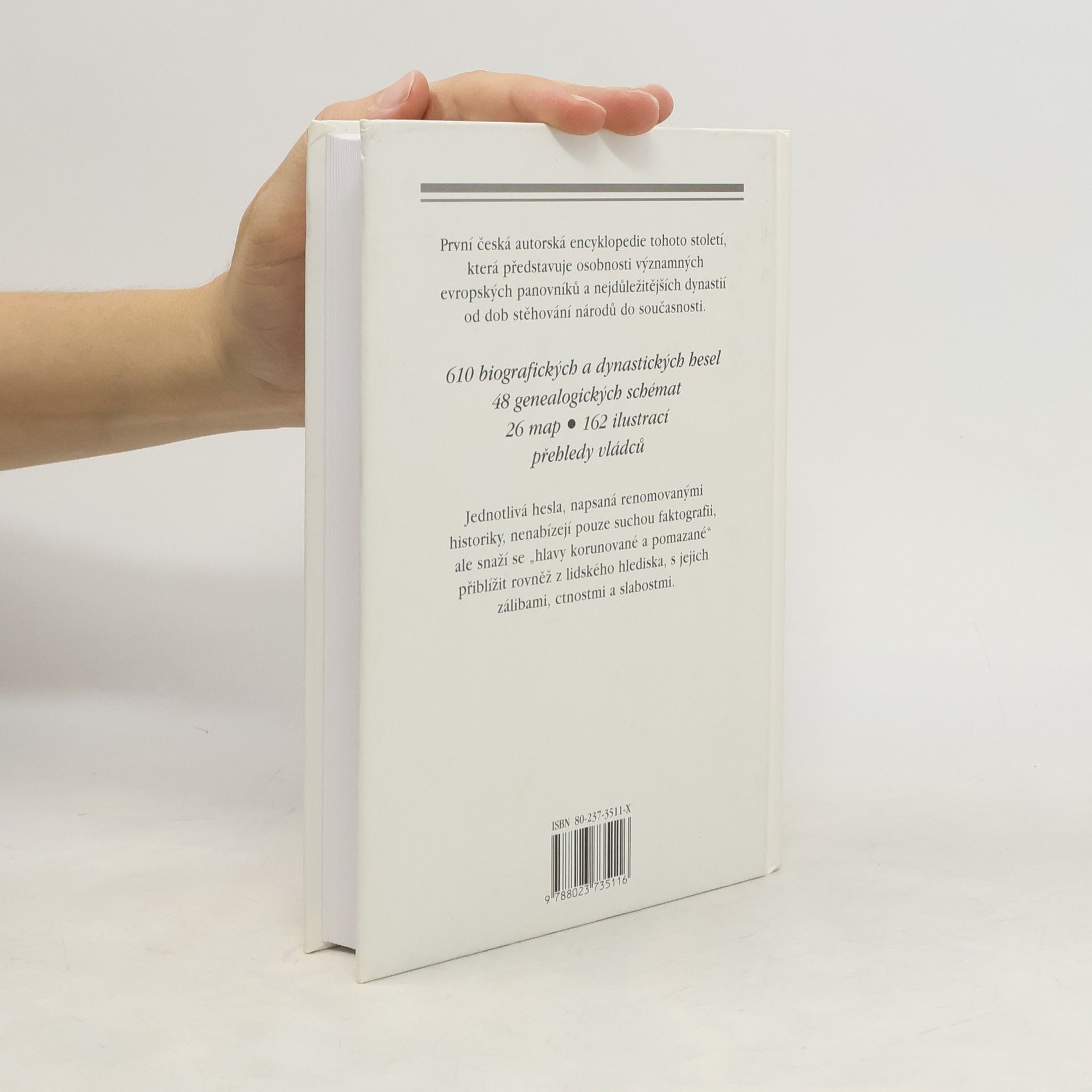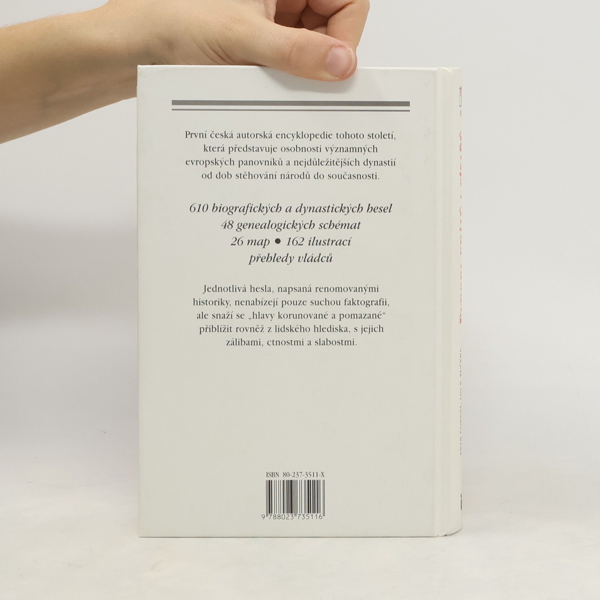 Encyklopedie představuje osobnosti významných evropských panovníků a nejdůležitějších dynastií od dob stěhování národů do současnosti. Obsahuje 610 biografických a dynastických hesel, 48 genealogických schémat, mapy, ilustrace a přehledy vládců.