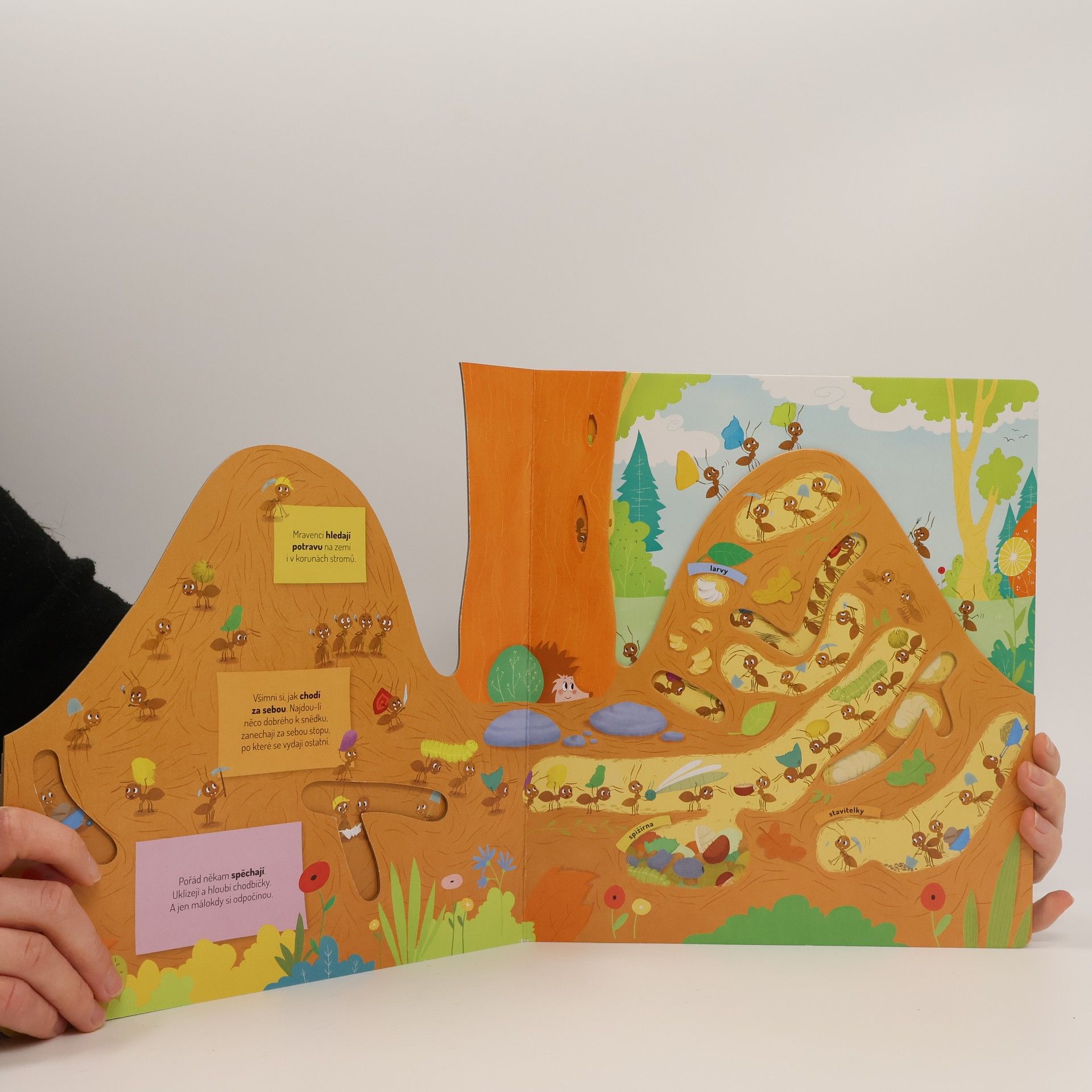 Představ si, že jsi mravenec a strávíš jeden den v mraveništi. Jaké to asi bude? Celý den budeš pořád někam utíkat – uklízet a hloubit chodbičky, hledat různá semínka, abys měl co jíst, a až tě to přestane bavit, vylezeš si úplně nahoru na vršek mravenčí kupy, aby ses opaloval a nahříval si tělíčko. Ale dost už bylo řečí. Víš co? Udělej si pohodlí a pojď se s námi podívat přímo do mraveniště…