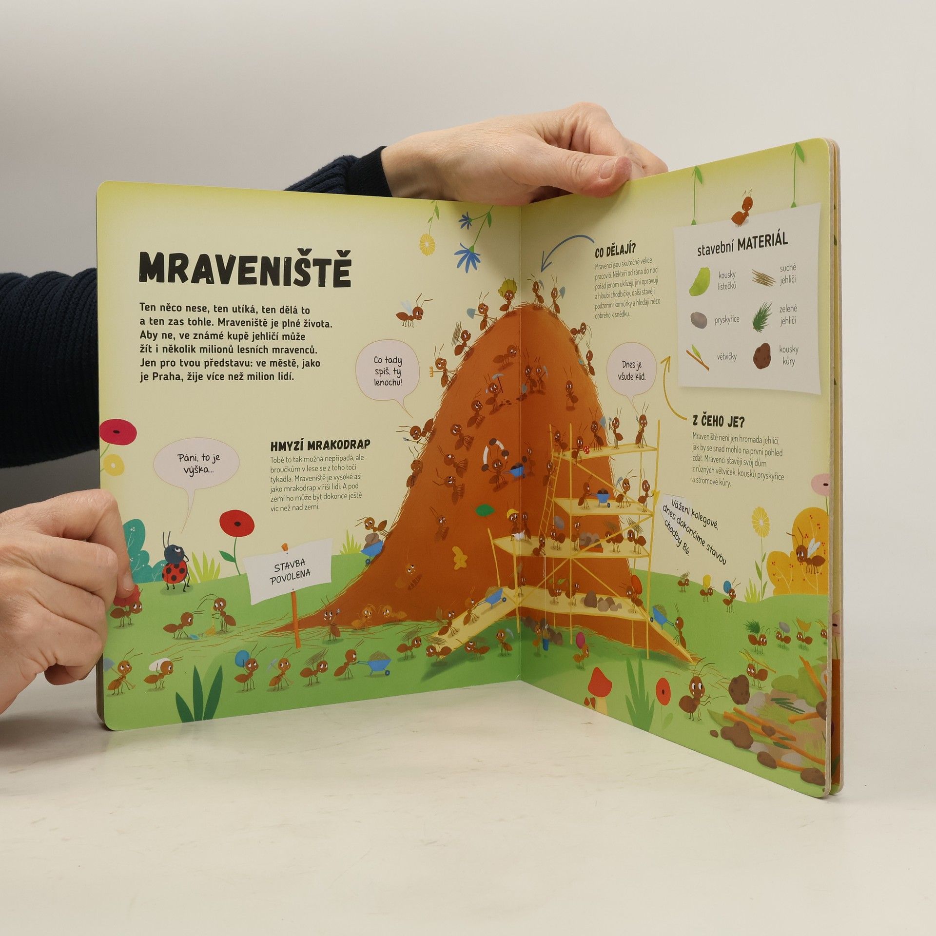 Představ si, že jsi mravenec a strávíš jeden den v mraveništi. Jaké to asi bude? Celý den budeš pořád někam utíkat – uklízet a hloubit chodbičky, hledat různá semínka, abys měl co jíst, a až tě to přestane bavit, vylezeš si úplně nahoru na vršek mravenčí kupy, aby ses opaloval a nahříval si tělíčko. Ale dost už bylo řečí. Víš co? Udělej si pohodlí a pojď se s námi podívat přímo do mraveniště…