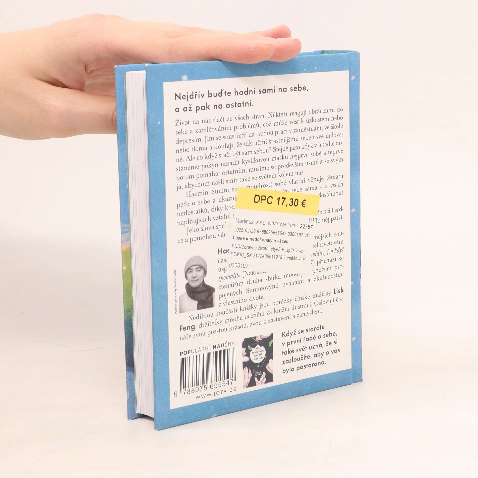 Jak přijmout sama sebe ve světě usilujícím o dokonalost. Mnozí z nás na různé tlaky v životě reagují tím, že se stáhnou do sebe a problém ignorují, což někdy vede k úzkosti nebo depresi. Jiní reagují tím, že se usilovněji věnují svým povinnostem v práci, ve škole nebo doma, v naději, že to přinese štěstí jim samotným i jejich nejbližším. Co když ale stačí být prostě sám sebou? Stejně jako když v letadle dostaneme pokyn nasadit kyslíkovou masku napřed sobě a teprve pak pomáhat ostatním, musíme být nejprve v míru sami se sebou, než budeme moci být v míru se světem kolem sebe. V tomto krásném pokračování svého mezinárodního bestselleru Věci, které uvidíte, jen když zpomalíte se zen-buddhistický mnich Haemin Sunim s moudrostí sobě vlastní věnuje tématu péče o sebe a tvrdí, že pouze přijetím sebe sama – a všech nedostatků, díky kterým jsme sami sebou – můžeme dosáhnout soucitných a naplňujících vztahů s partnerem, rodinou a přáteli. Kniha Láska k nedokonalým věcem, kterou doprovází více než třicet pět barevných ilustrací, potěší vaše oči i srdce a pomůže vám mít rádi sebe, svůj život a každého, kdo do něj patří. Když se staráte v první řadě o sebe, také svět uzná, že si zasloužíte, aby o vás bylo postaráno.