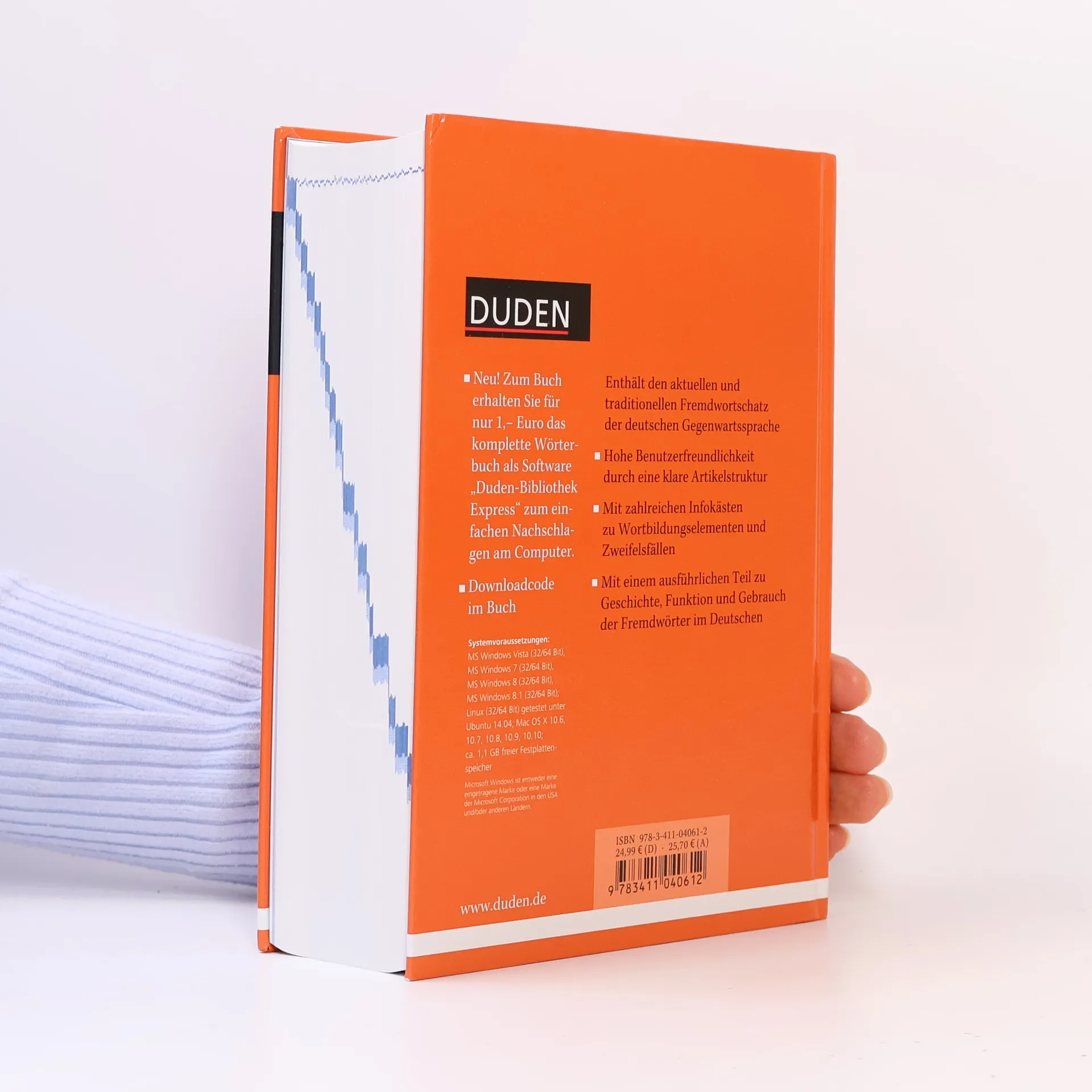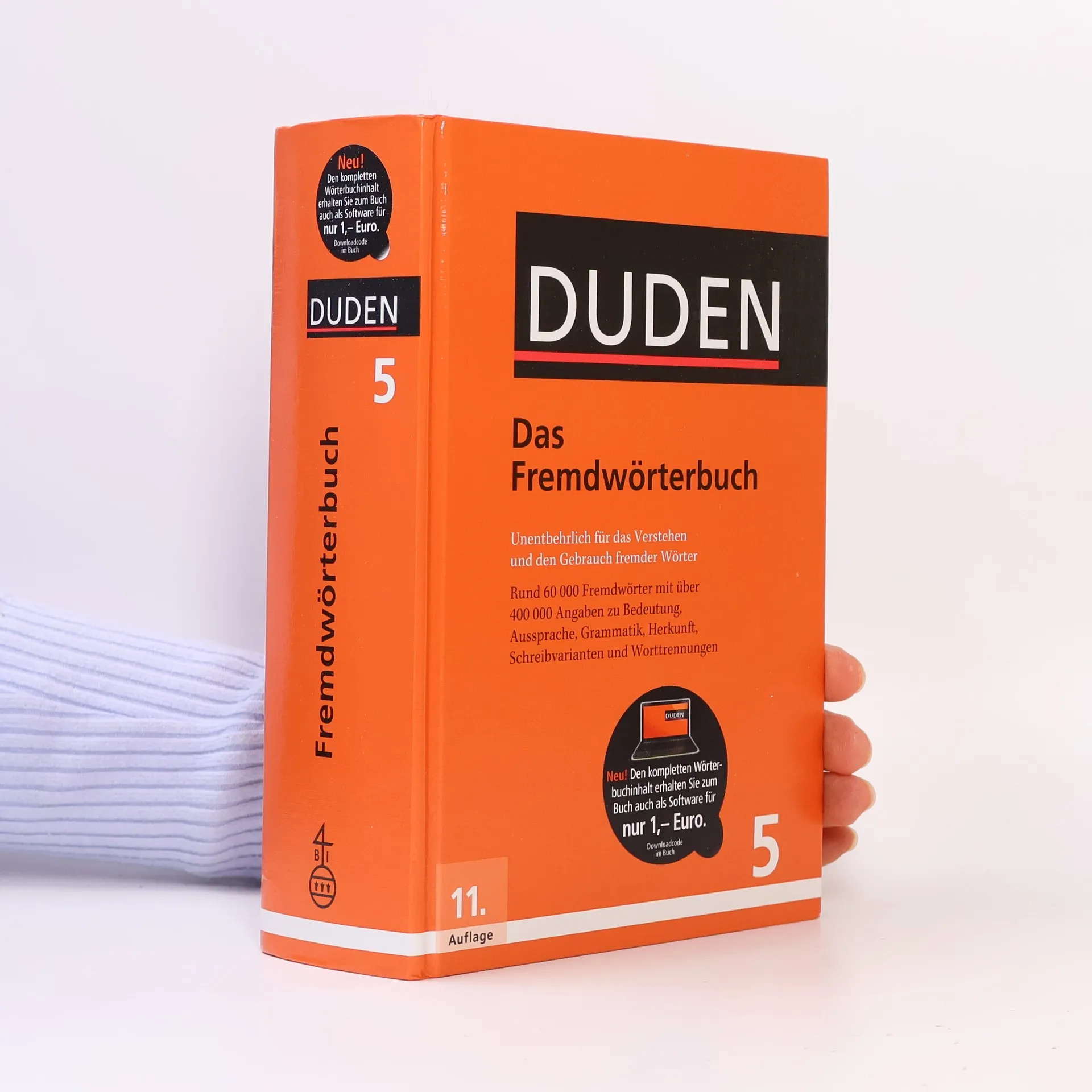 Gigathlon? Bonobo? Boyfriendjeans? Wissen Sie, was diese Fremdwörter bedeuten? Das „Duden-Fremdwörterbuch“ verzeichnet mit rund 60.000 Stichwörtern sowohl den aktuellen als auch den traditionellen Fremdwortschatz der deutschen Sprache. In die aktuelle 11. Auflage wurden rund 1.000 Stichwörter neu aufgenommen. Sie stammen vor allem aus den Gebieten Computer/Informatik, Medizin, Naturwissenschaften, Wirtschaft und Sport. Außerdem wurde der Wortschatz aus den Bereichen Medizin und Psychologie inhaltlich überarbeitet. Alle Stichwörter sind mit Angaben zur Aussprache, Grammatik, Herkunft und Bedeutung sowie zu den Stilebenen versehen. Außerdem enthält der Band Hinweisartikel zu rechtschreiblichen Zweifelsfällen und zu Wortbildungselementen wie epi-, Epi- oder akro-, Akro-. Der Download bietet ferner rund 13.000 Vertonungen. 11., vollständig überarbeitete und aktualisierte Auflage. Neu: Buchkäufer erhalten den kompletten Wörterbuchinhalt zum Buch auch als Programm „Duden-Bibliothek Express“ für das einfache Nachschlagen am Computer zum Preis von 1,- Euro (Downloadcode im Buch). Zahlreiche Suchfunktionen erleichtern die Recherche direkt beim Schreiben. „Das Fremdwörterbuch“ ist kombinierbar mit allen anderen elektronischen Wörterbüchern aus der Software-Reihe „Duden-Bibliothek“.