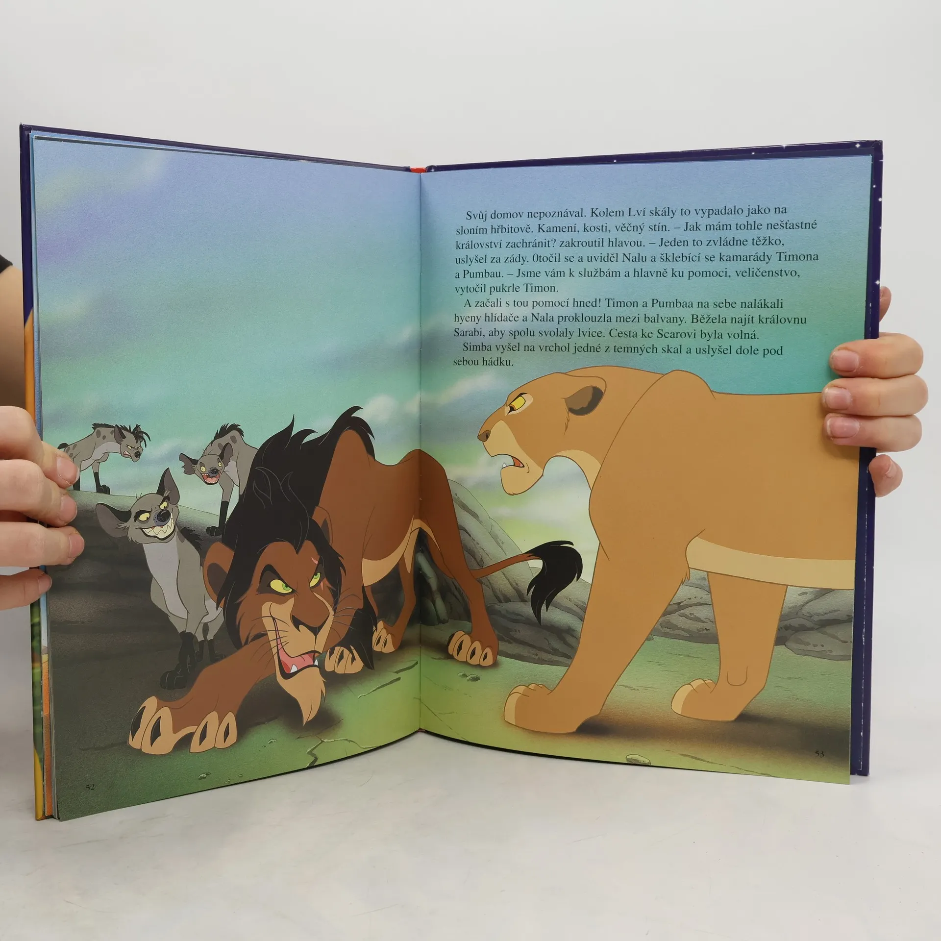 Oranžový kotouč slunce nahlédl prvními žhavými paprsky do nekonečné země písku, skal a stepní trávy a nad tím dílem světa, který lidé pokřtili jménem Afrika, se rozezněly tisíce bubnů a bubínků. Ale to nebouřily bubny! To dusala kopyta zeber a žiraf a dupaly mohutné sloní nohy. A nad bubny vřískaly a pípaly hlasy tisícihlavého sboru dalších zvířat. Všechna spěchala, aby se poprvé poklonila prvorozenému synu lvího krále Mufasy