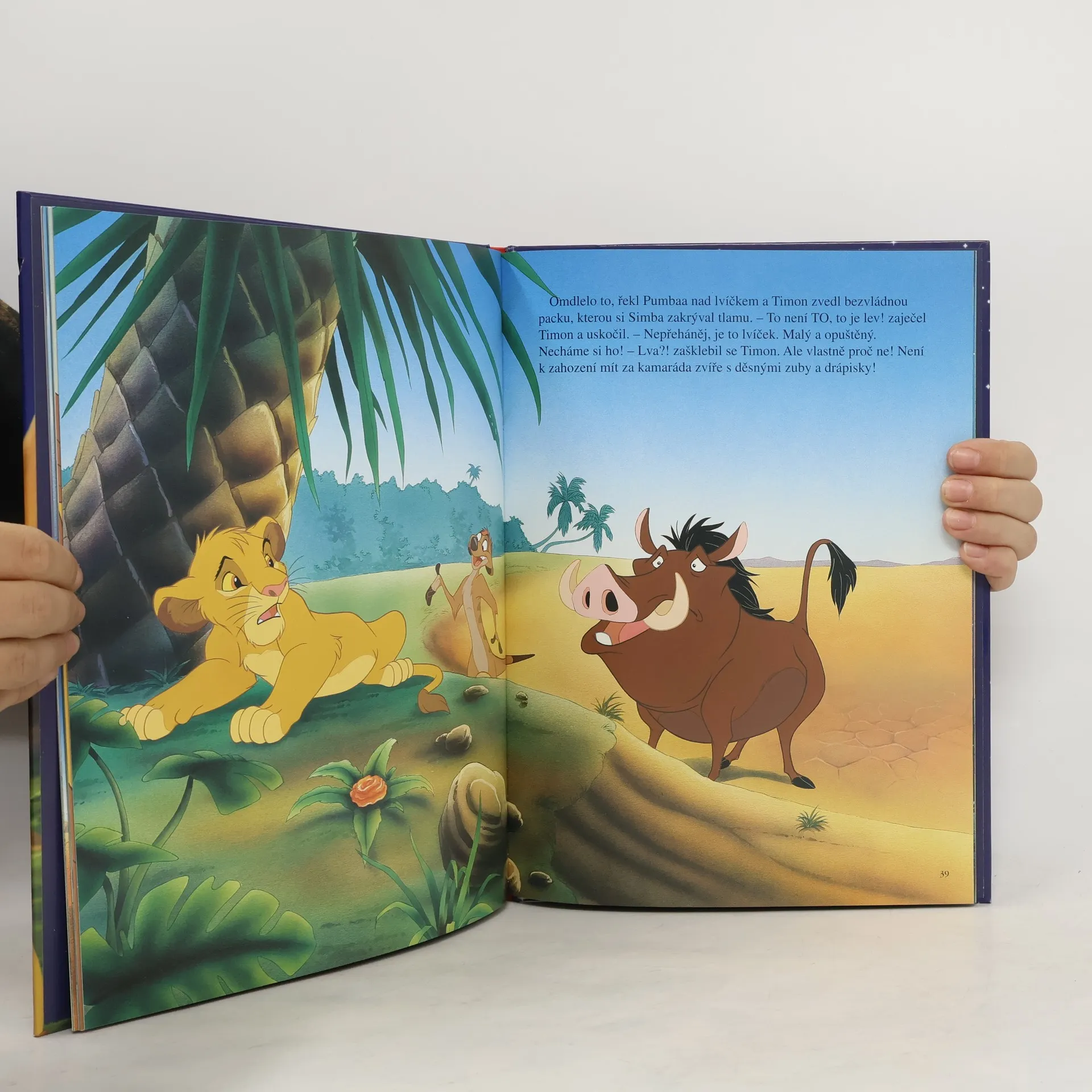 Oranžový kotouč slunce nahlédl prvními žhavými paprsky do nekonečné země písku, skal a stepní trávy a nad tím dílem světa, který lidé pokřtili jménem Afrika, se rozezněly tisíce bubnů a bubínků. Ale to nebouřily bubny! To dusala kopyta zeber a žiraf a dupaly mohutné sloní nohy. A nad bubny vřískaly a pípaly hlasy tisícihlavého sboru dalších zvířat. Všechna spěchala, aby se poprvé poklonila prvorozenému synu lvího krále Mufasy